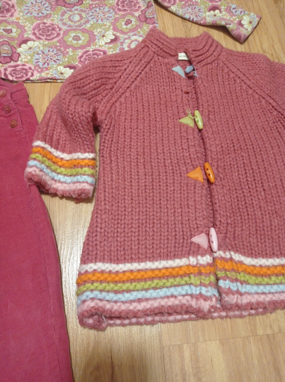 Menzestraky podsite bavlnou, rolacik a teply sveter.velkost 18 mes. Sveter dlzka:40,5 cm, rukav od krku:30 cm, rolak dlzka,:32 cm, rukav od krku:32,5 cm, nohavice 55, 5 cm bez trakov, tam su 2 velkosti nastavenia. Velmi dobry noseny stav. Kupovane v zahranici, znacka: grain de blé. Nohavice a rolak 18 mes a sveter 12 mes ale nosene spolu.