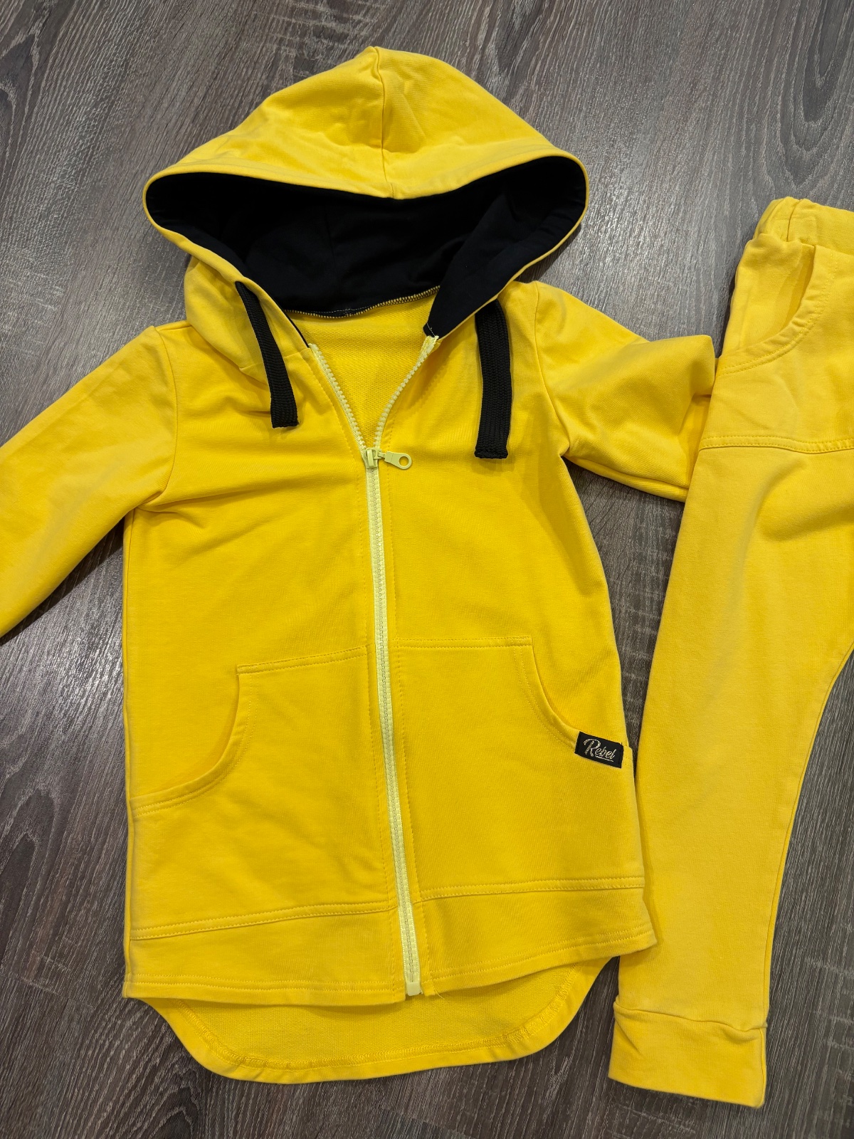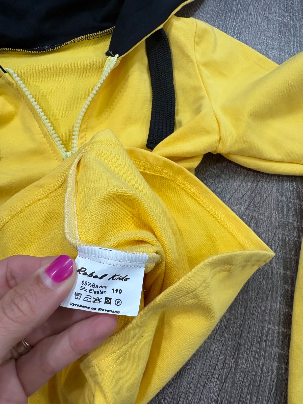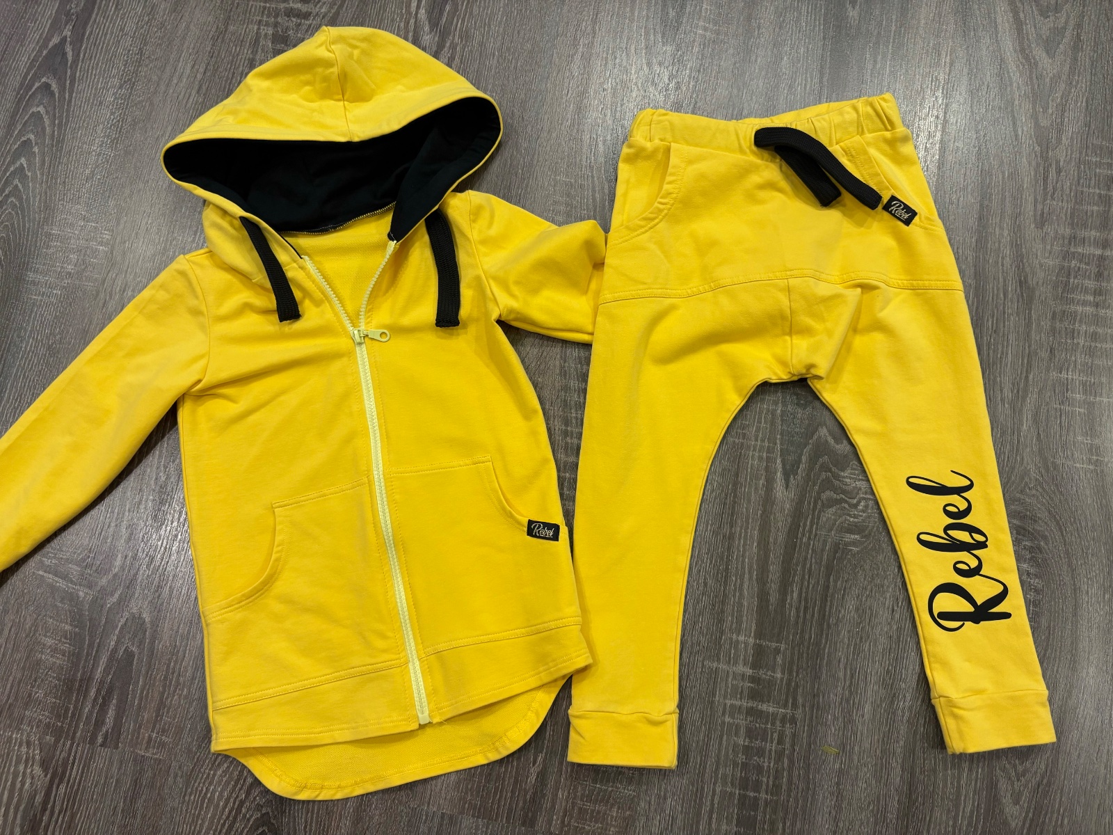 02.Rebel Kids štylova detska suprava,krasnej žlto-čiernej kombinacii vo velkosti 104-110.Dlzka mikiny prednej casti je 49cm,zadnej casti je 55cm,dlzka rukava od krku je 46cm a sirka v podpazusi je od 34x2cm do 39x2cm.Teplaky su dlhe 51cm a sirka v pase je od 26x2cm do 31x2cm.