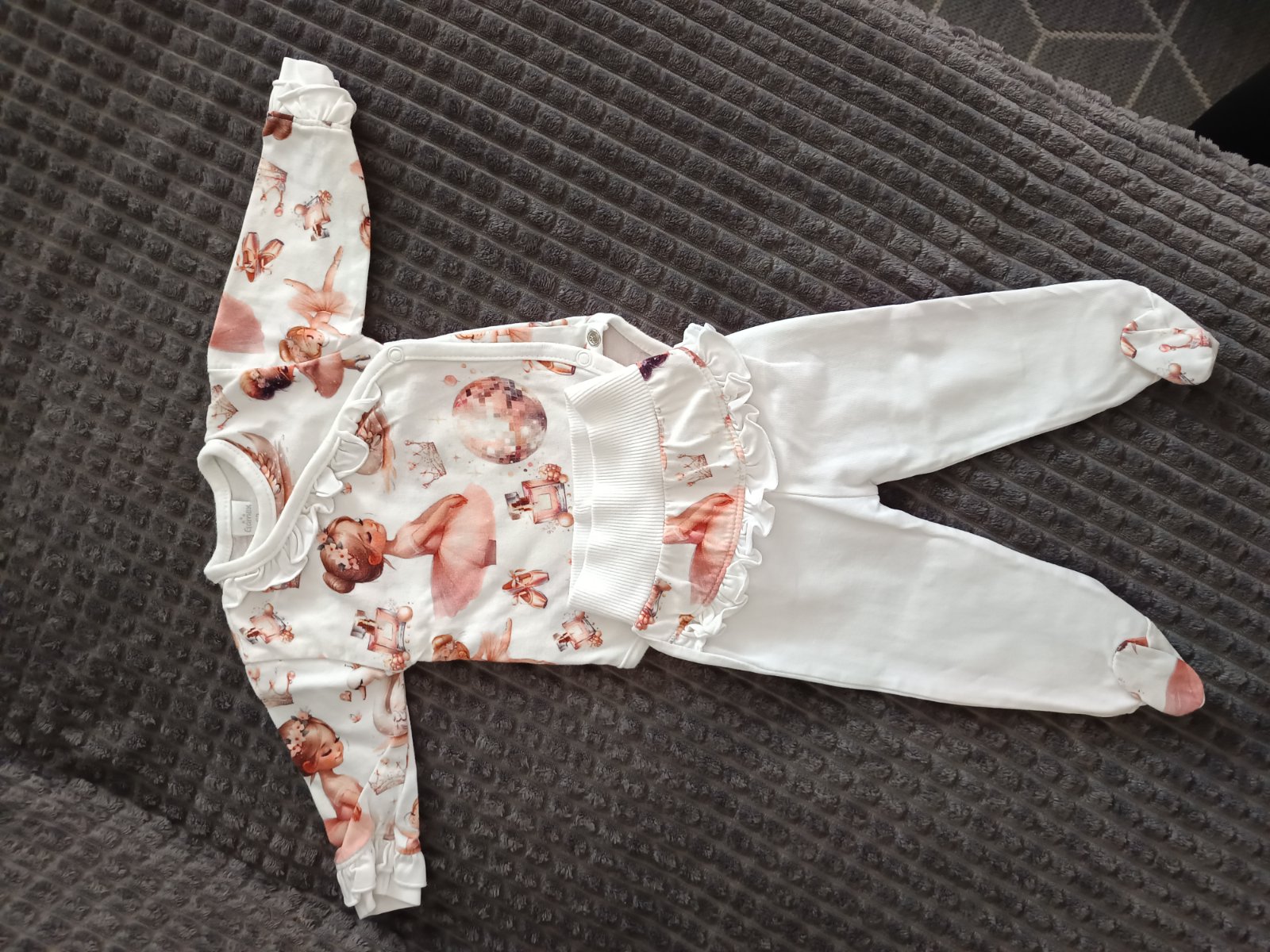 Krásna, 4-dielna súprava na krst. Obsahuje čiapočku, topánočky, nohavice a vrchný diel. Vďaka strihu a ukončeniam na gumičku výborne sadne. Cena 10,- Eur + poštovné.