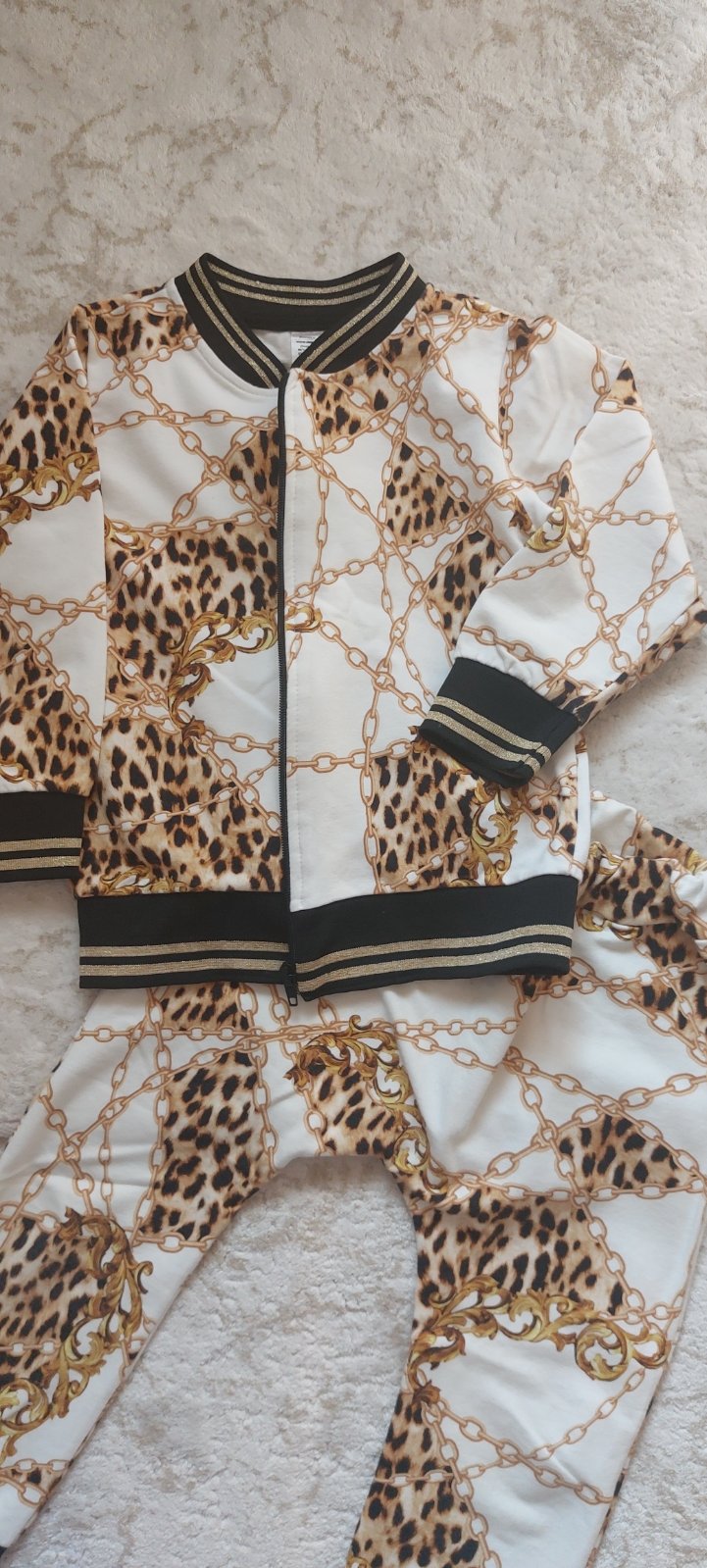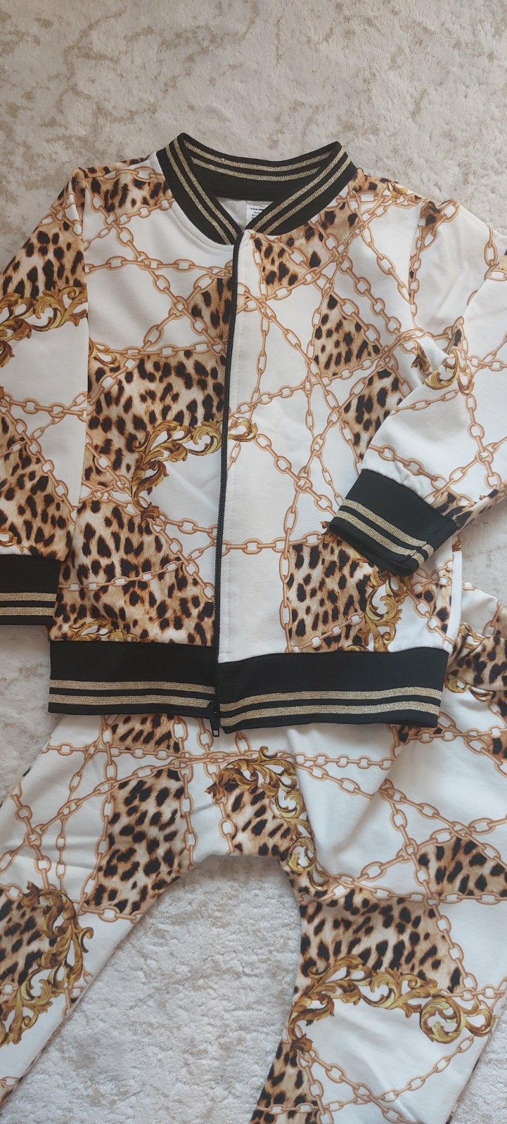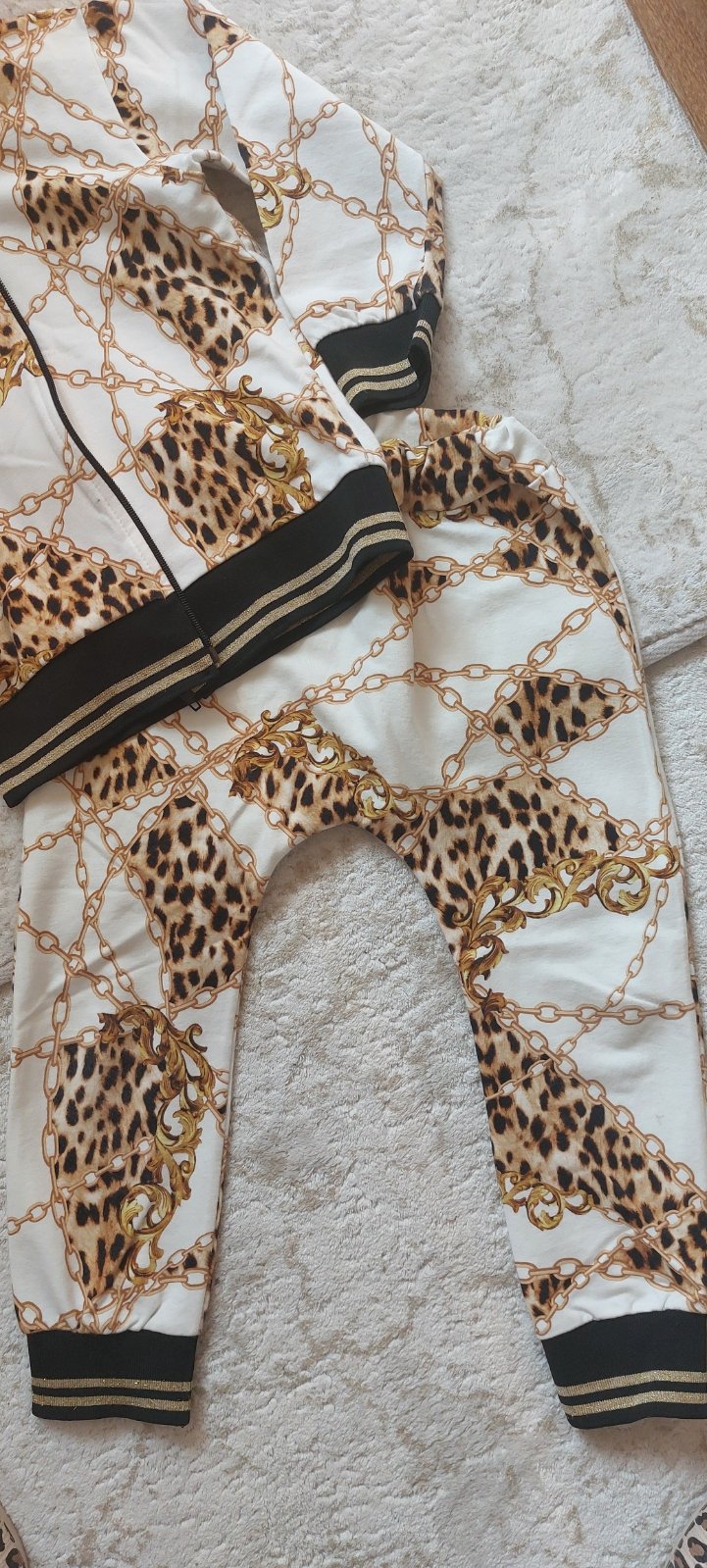 Predám na mieru šitý kompletik, pozostáva z teplacikov a mikinky na zips. Je to kombinácia biela-čierna a zlatá, zvierací motív. Neobyčajný kúsok.