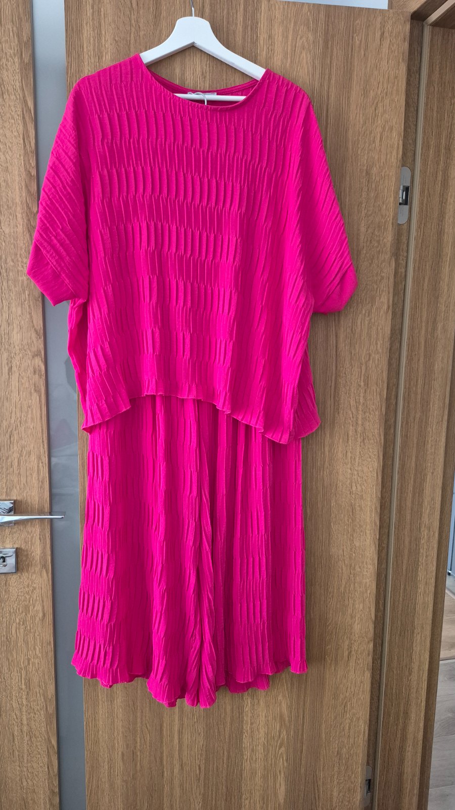 Predam pekny letny set,ma krasnu farbu a pekne sedi na postave,ma prijemny material viskoza,nohavice: dlzka 90cm pas v klude 68 natiahnute 100cm sed 43cm bluzka: dlzka 58cm sirka 150cm, komplet sa da nosit aj samostatne,pri mensich cislach je oversize strih,povodna cena 52 nova 14,5 vratane postovneho a balneho,platba vopred na ucet....talianska vyroba