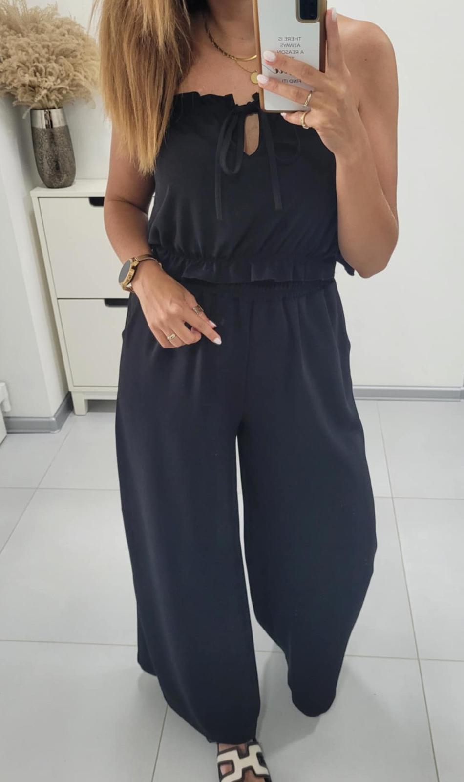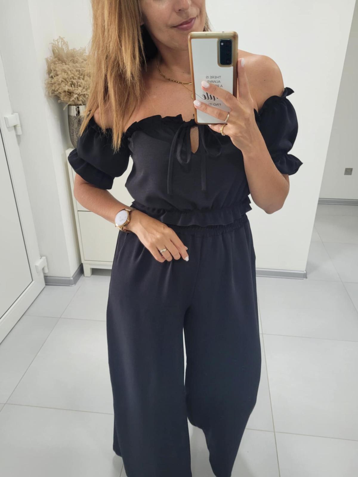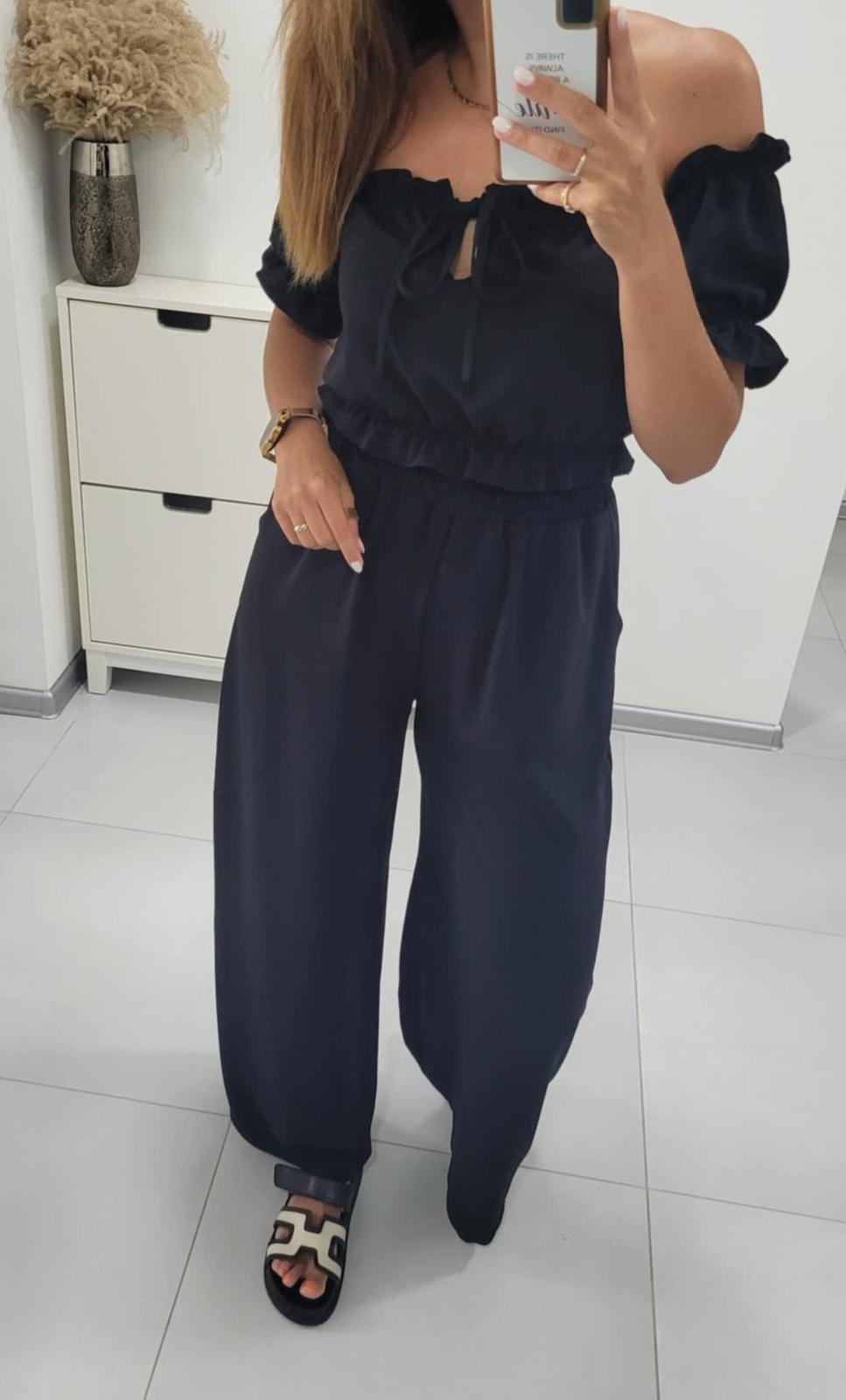 Dámsky komplet je od poľského výrobcu, je kvalitný, nekrčivý, ľahký letný materiál, nohavice v pase guma, vršok sa dá nosiť na viacero spôsobov - do pasa, ako nadpupkový, ramená možno odhaliť alebo schovať, pôvodná cena 29,90 €
