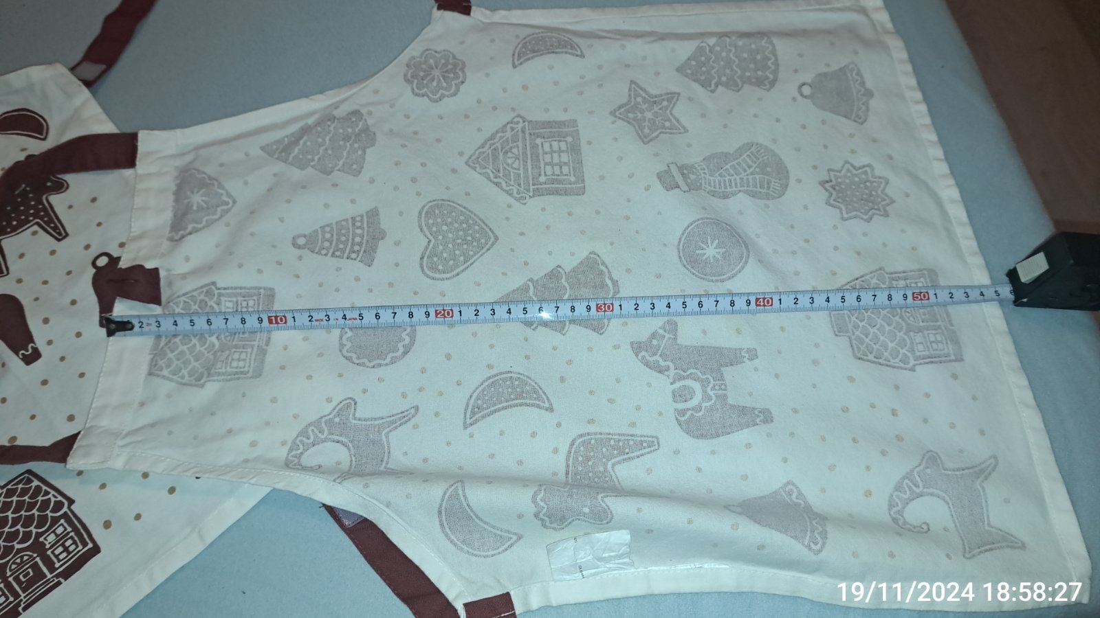 Set zásterky a čiapky pre deti, na hranie, na pomáhanie maminke pri Vianočnom.pečení aj na karneval do školy. My sme mali podobne aj na vianočnom foteni. Velkost nie je písana, naše deti mali 8-9 rokov.