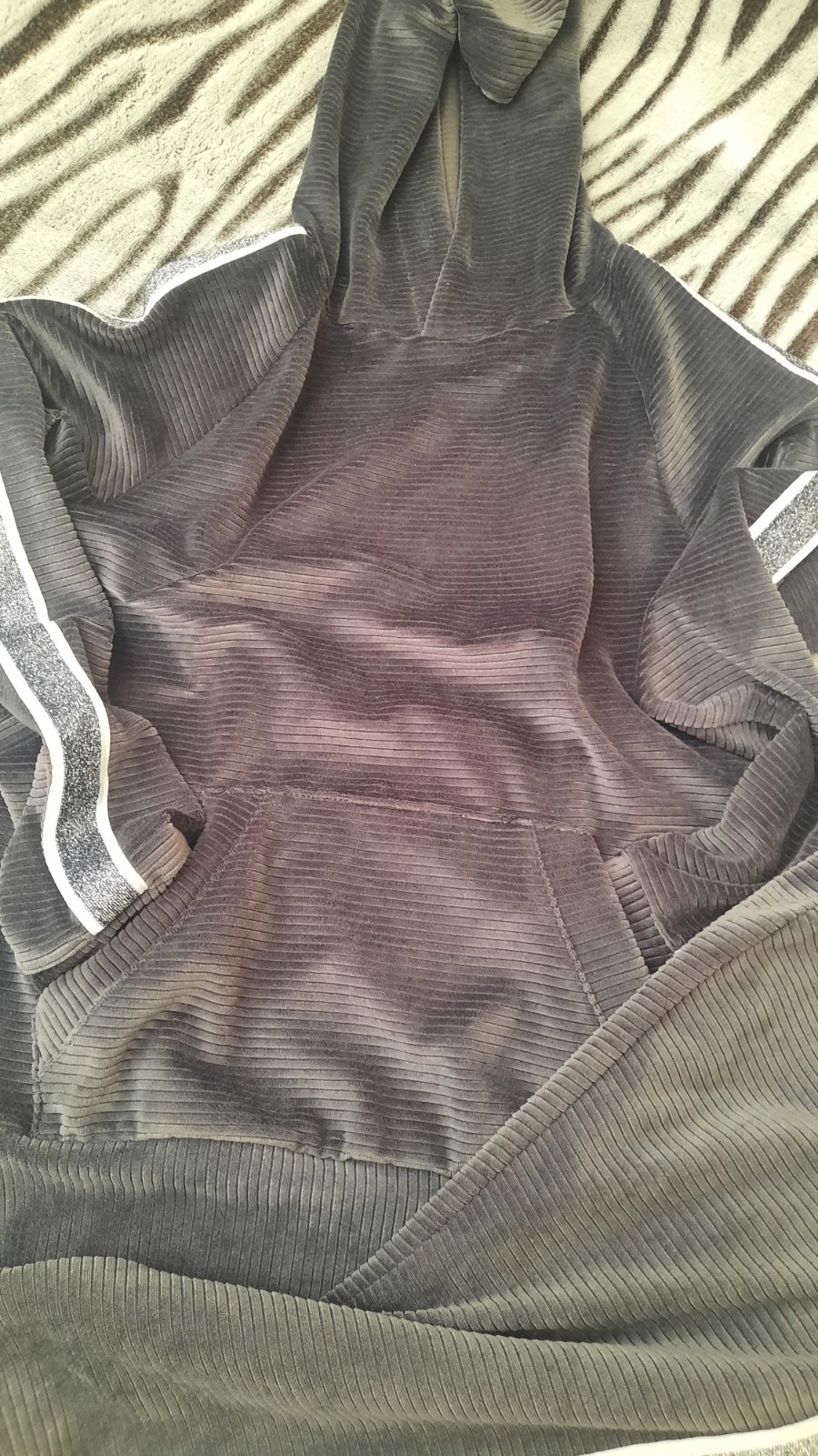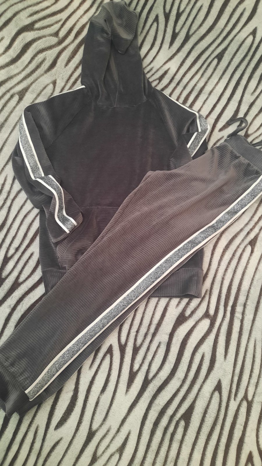 Málo nosena, velúr s pruzkom, farba rovnaka aj nohavice aj mikina, su to odlesky.