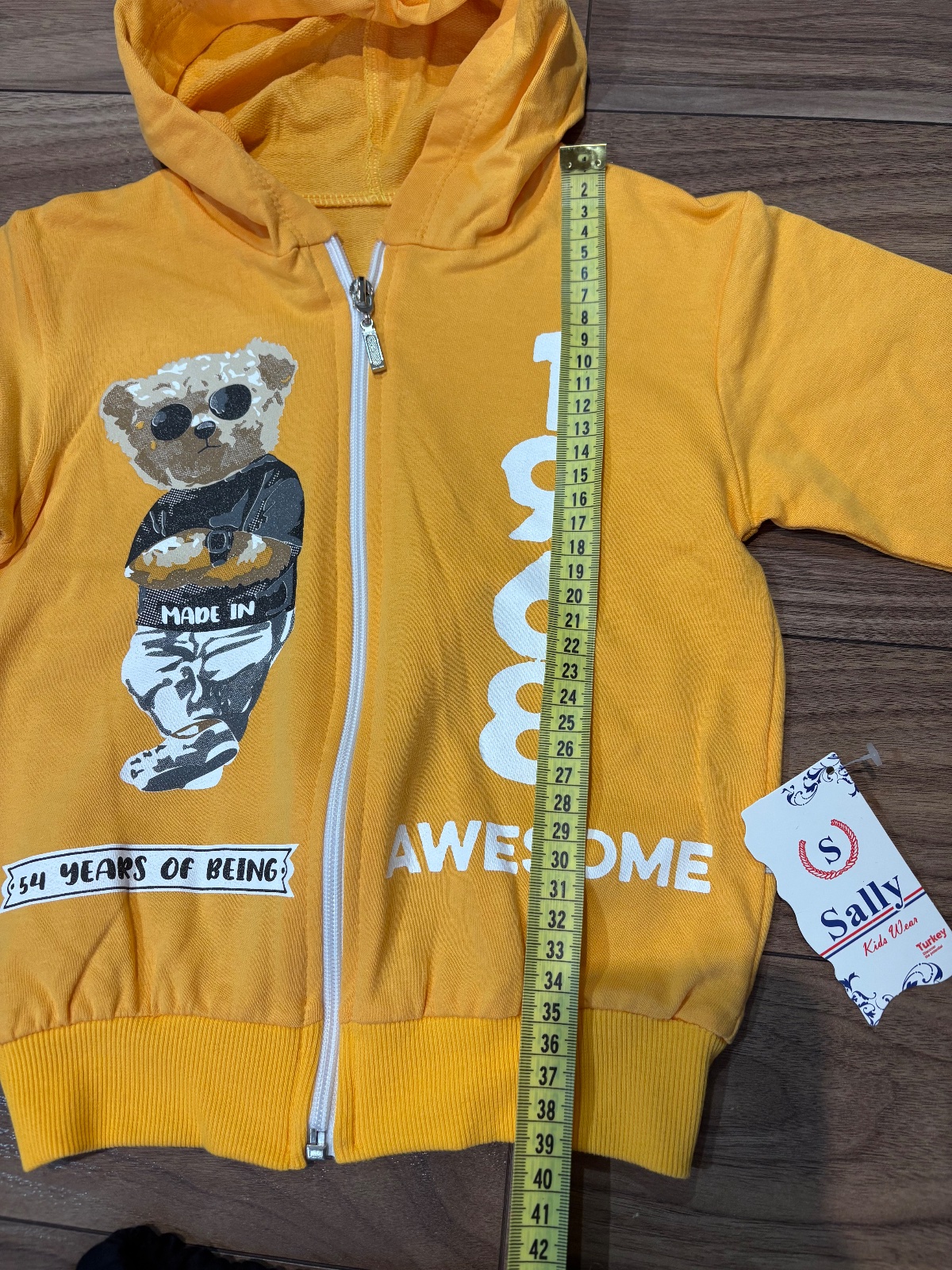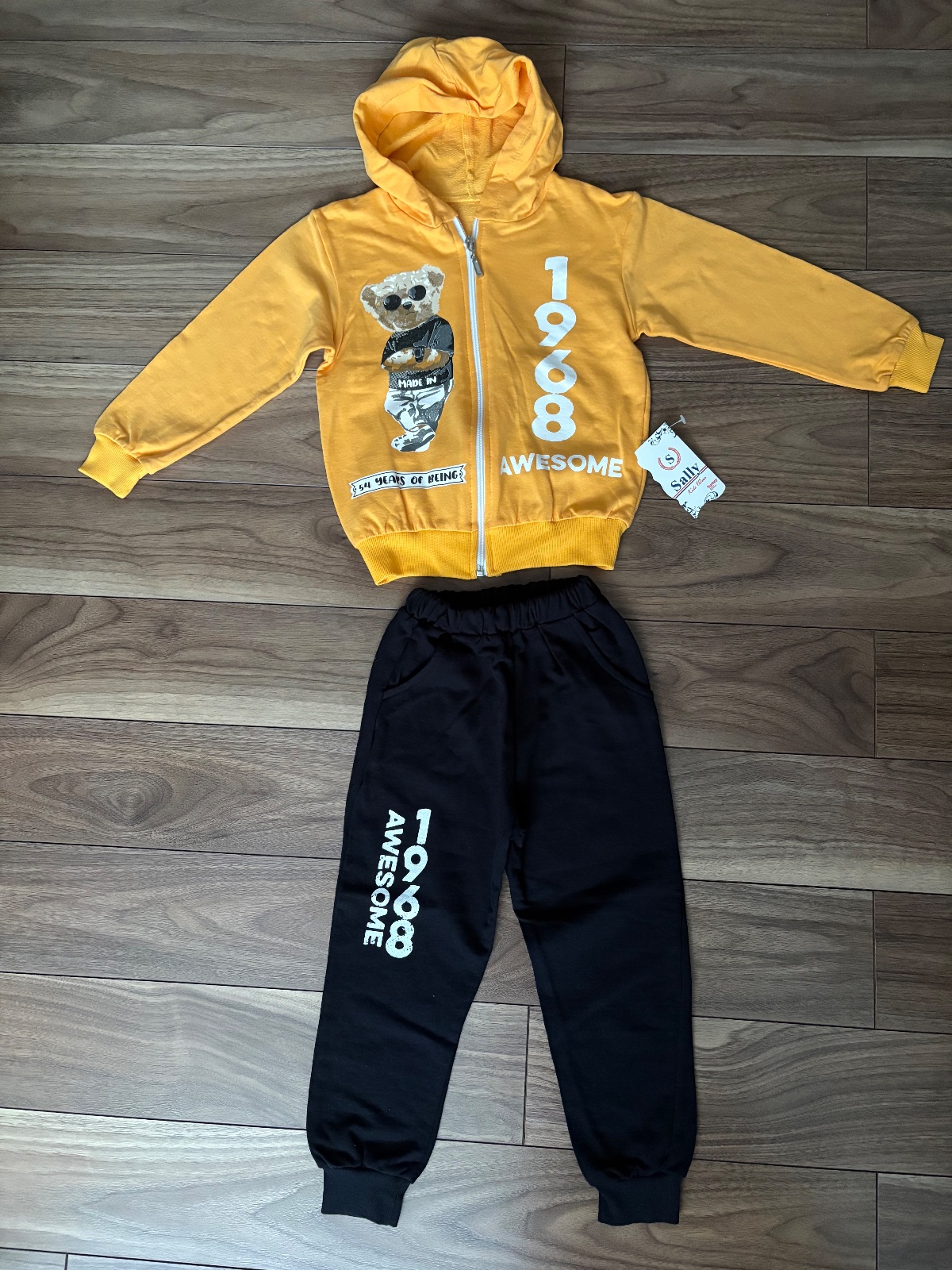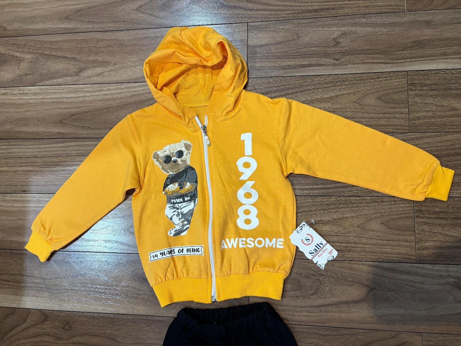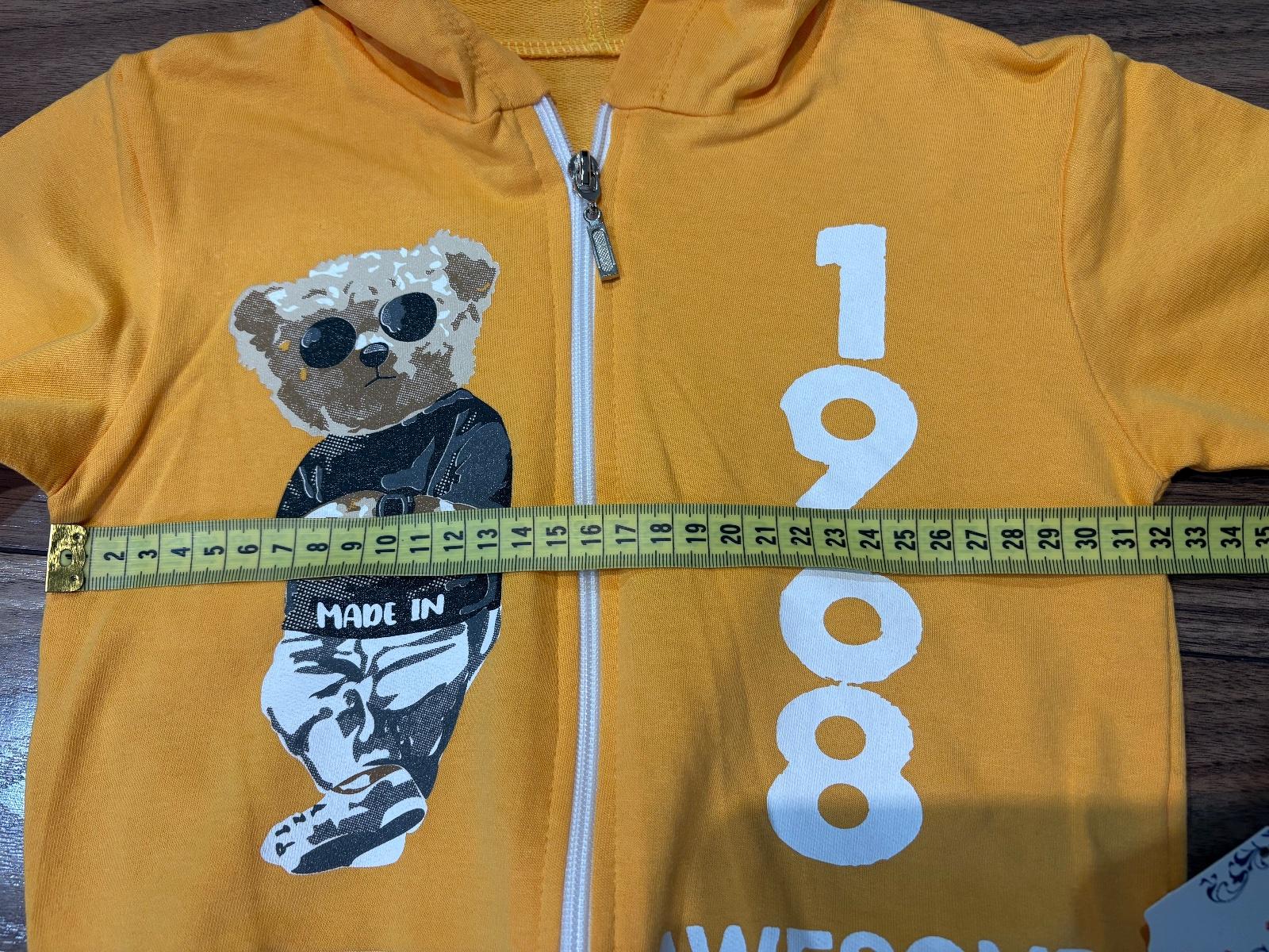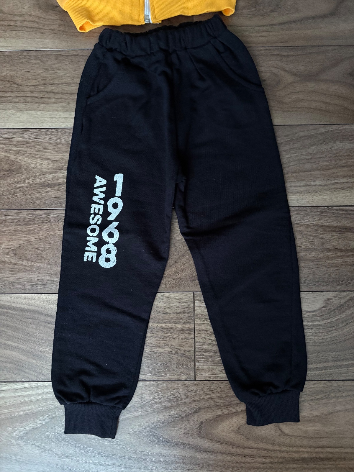 02.Rebel Kids štylova detska suprava,krasnej žlto-čiernej kombinacii vo velkosti 104-110.Dlzka mikiny prednej casti je 49cm,zadnej casti je 55cm,dlzka rukava od krku je 46cm a sirka v podpazusi je ...