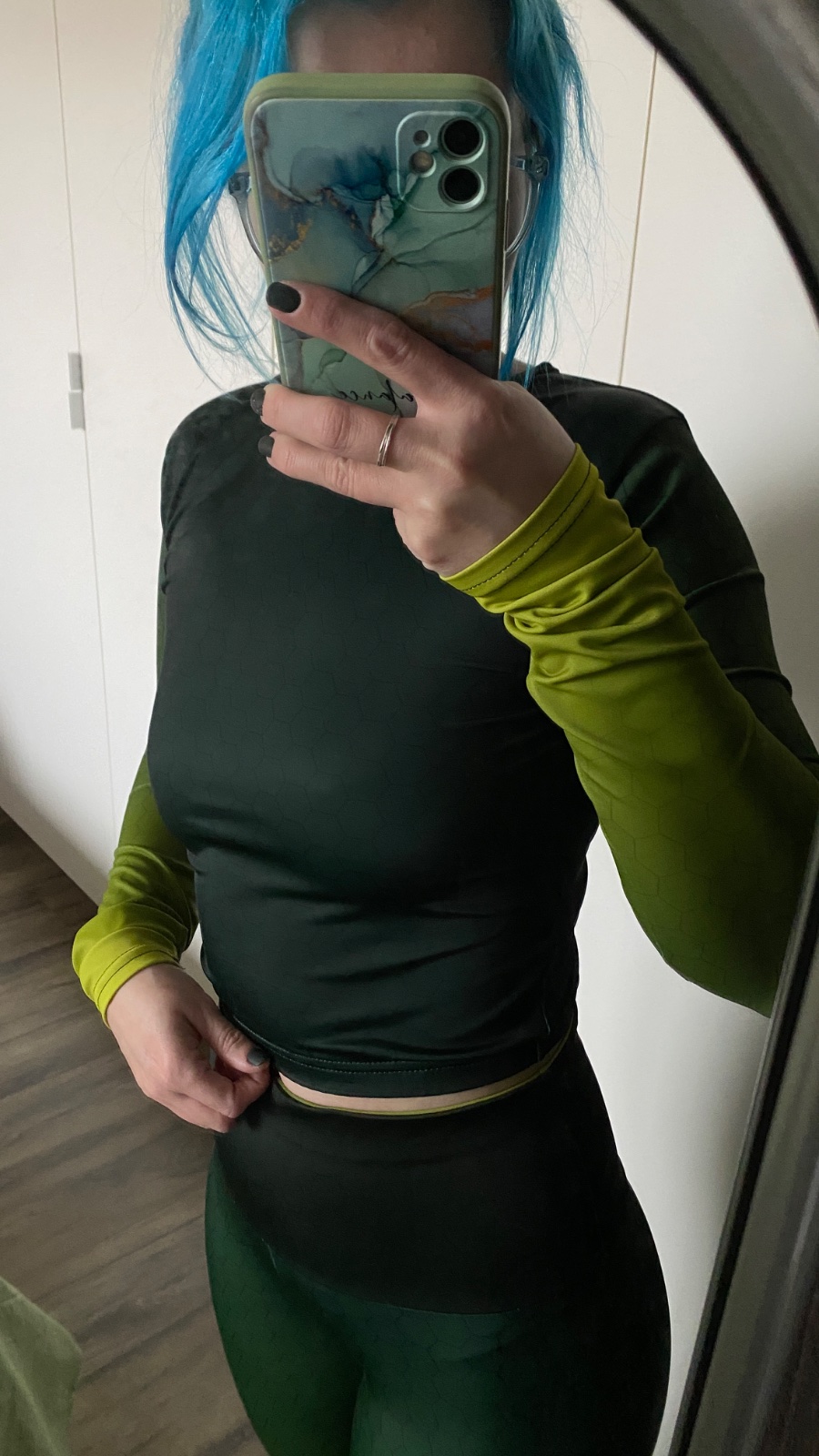 minimálné nosený funkčný set na cvičenie v podobe dlhých legín a crop topu s dlhým rukávom v odtieňoch zelenej farby - army green od slovenkej značky Mexy (pôvodný názov Mellien.design) Veľkosť oboch kúskov XS, fotené na postave výšky 160 cm, čiže vhodnejšie aj pre vyššie, kedže ako môžete vidieť dĺžka rukávov a legín mi je dlhšia