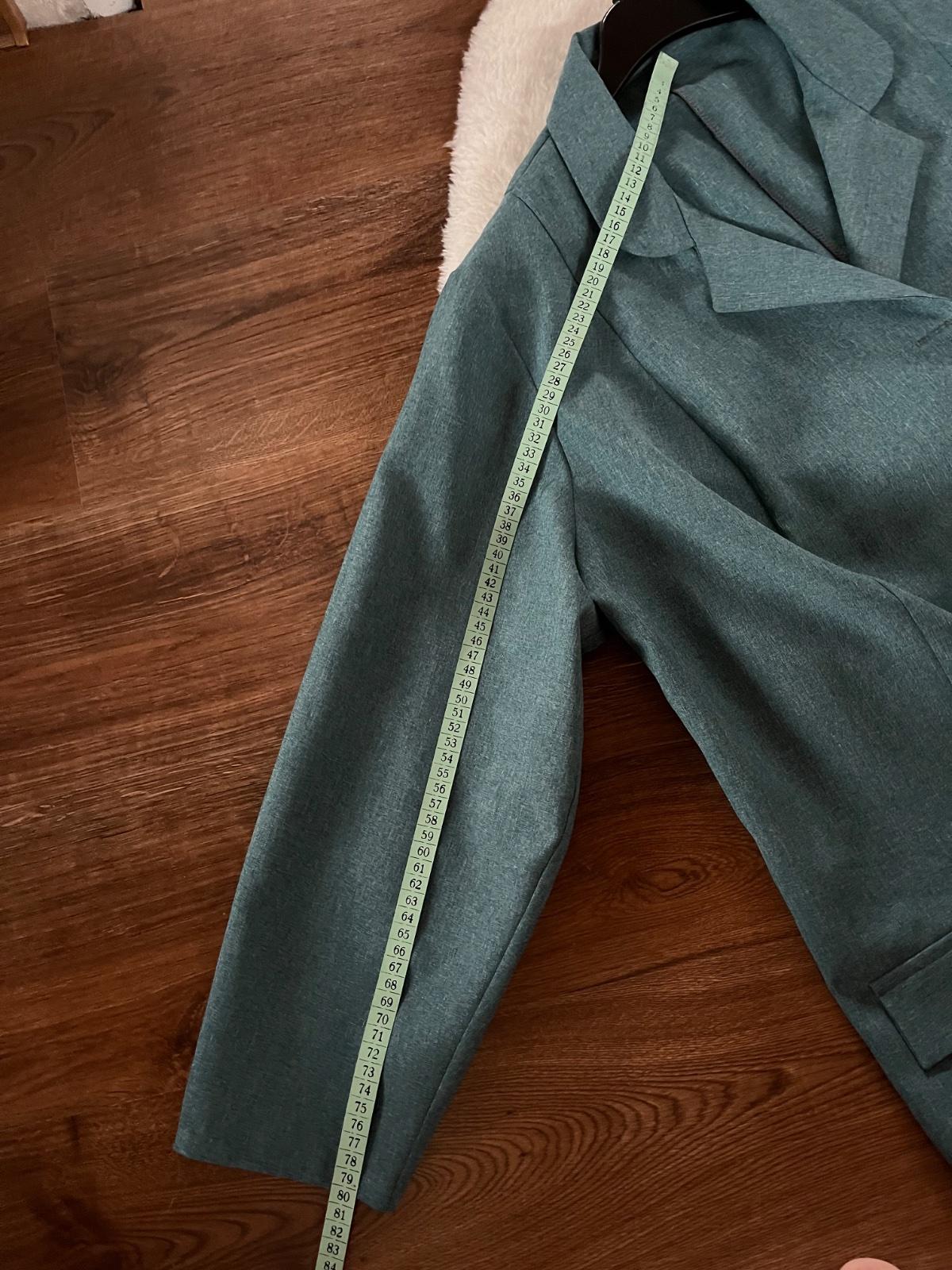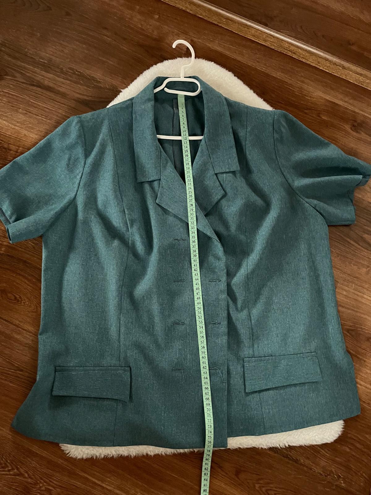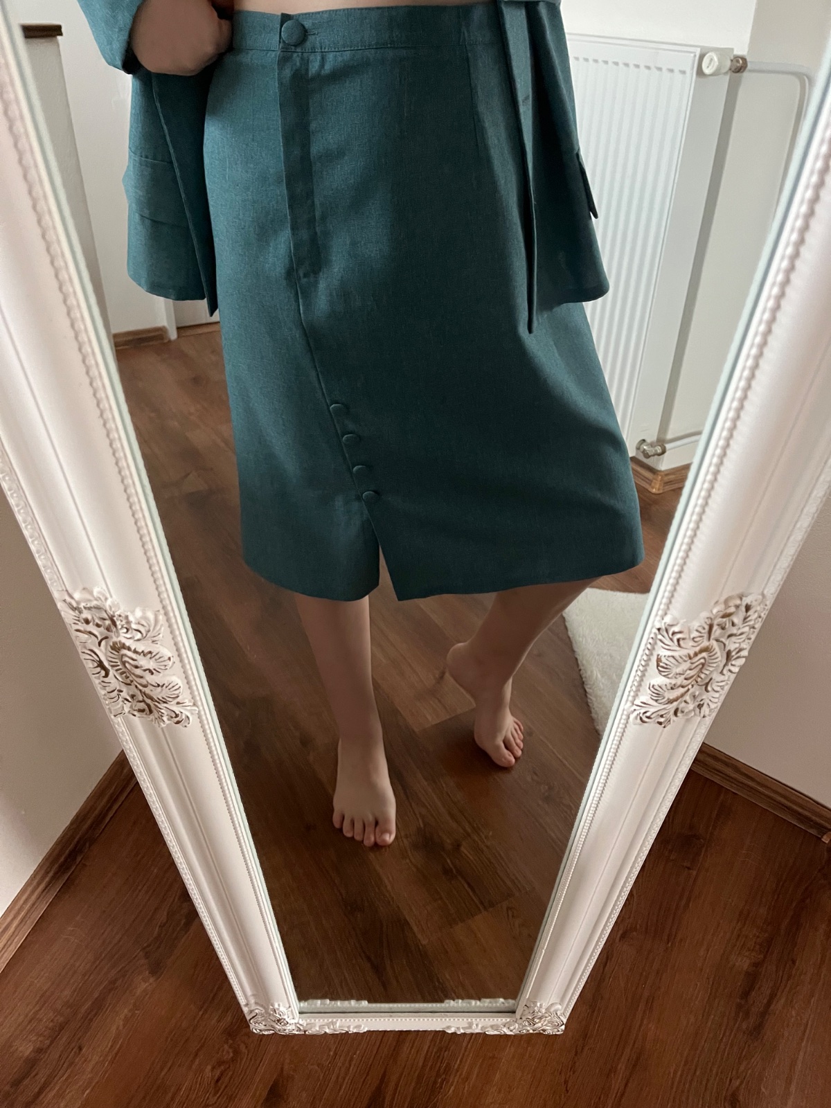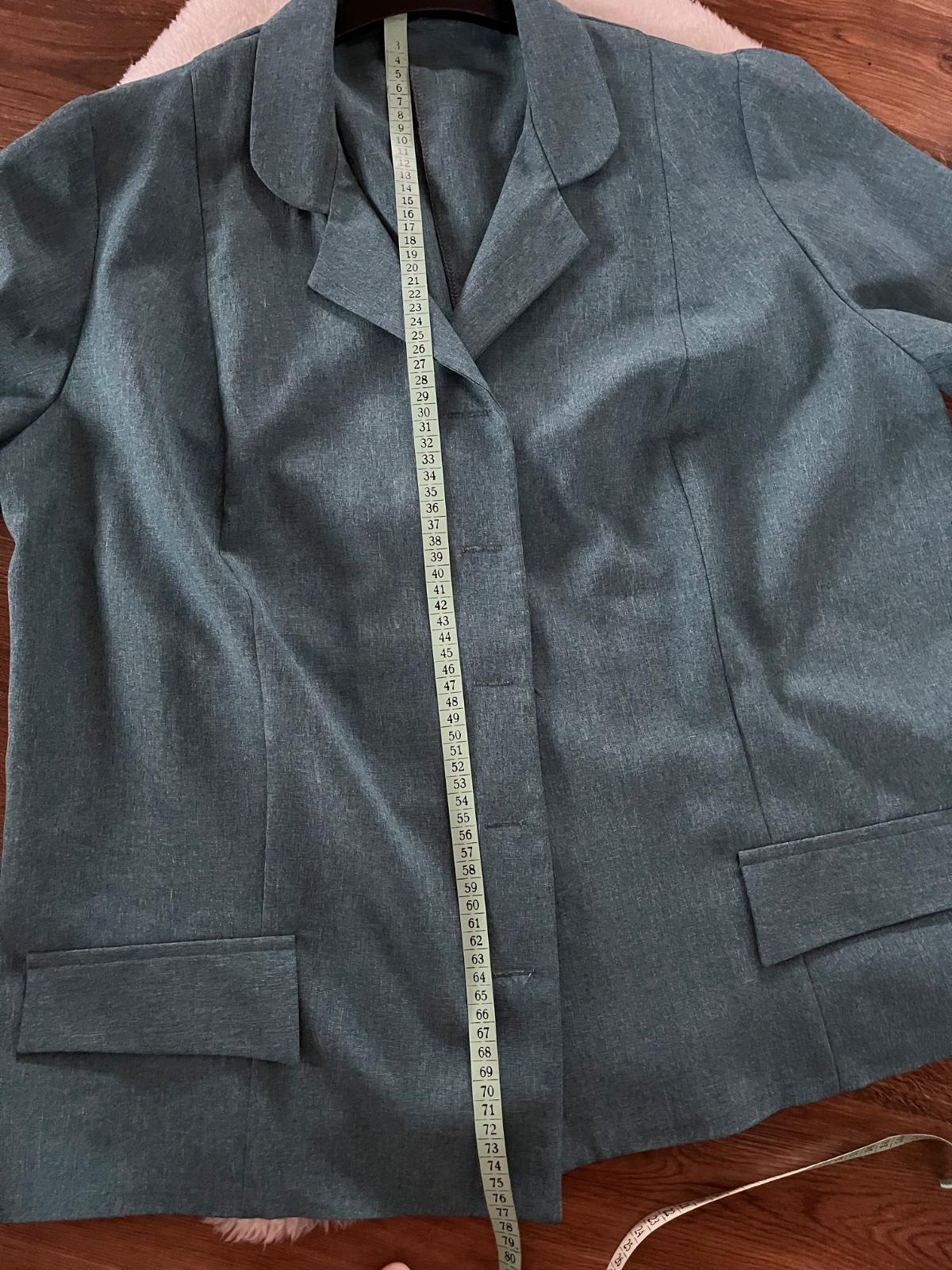 Oblečený len príležitostne, šitý na mieru, tak pripájam miery, ale sedí na veľkosť XXXL. Sako + top + sukňa. Foto na postave o veľkosti L pripájam pre približnú predstavu dĺžky. Farba ako na fotkách, taká príjemná tyrkysová.