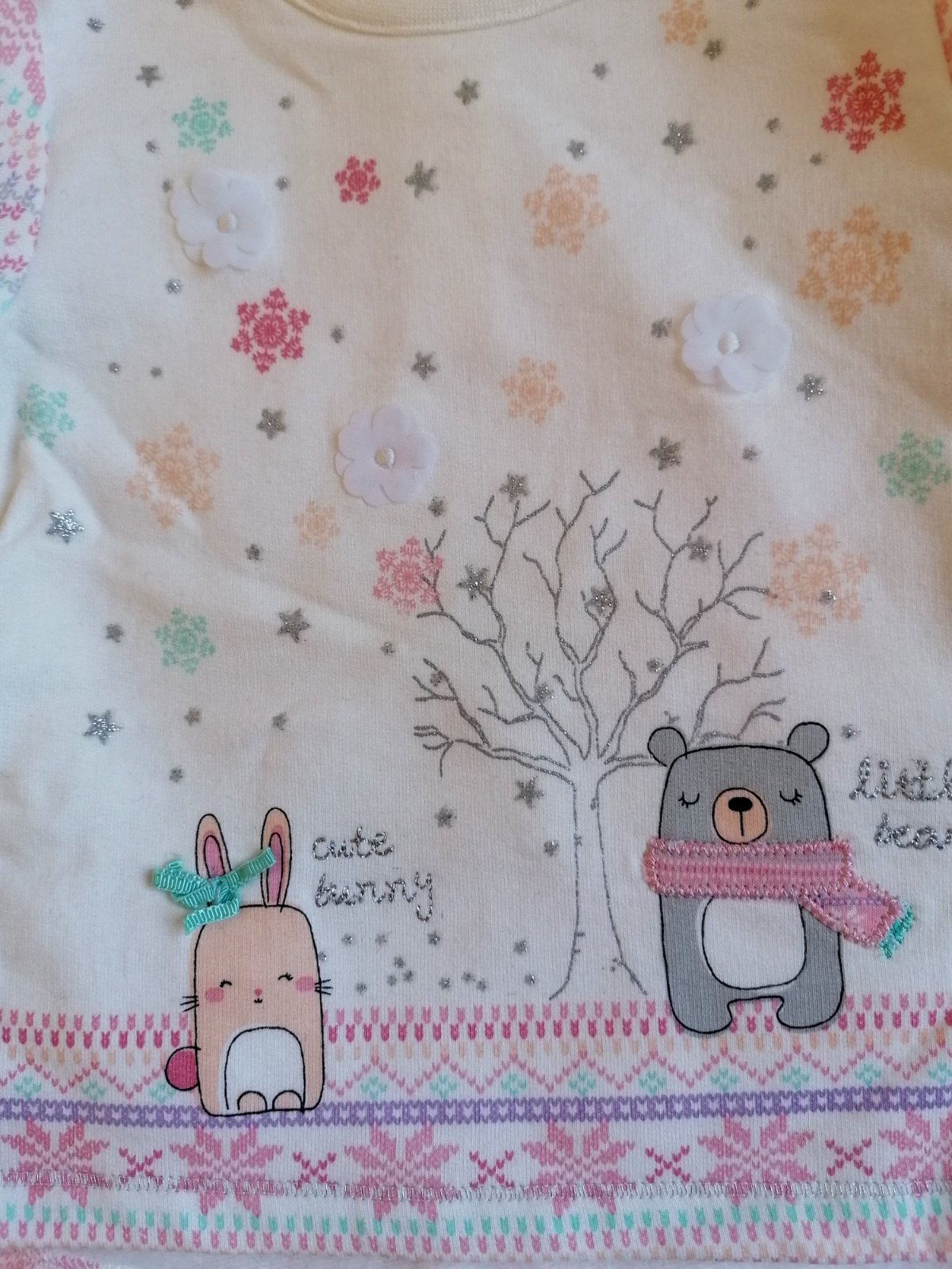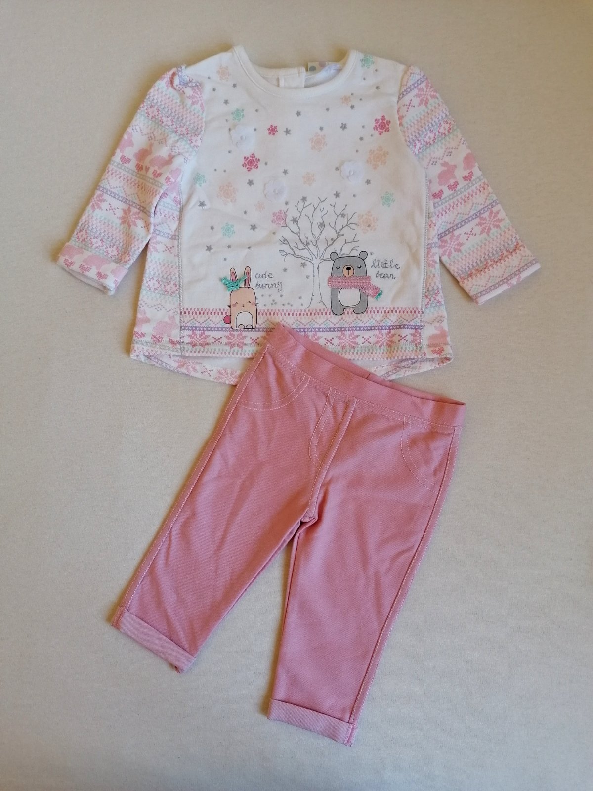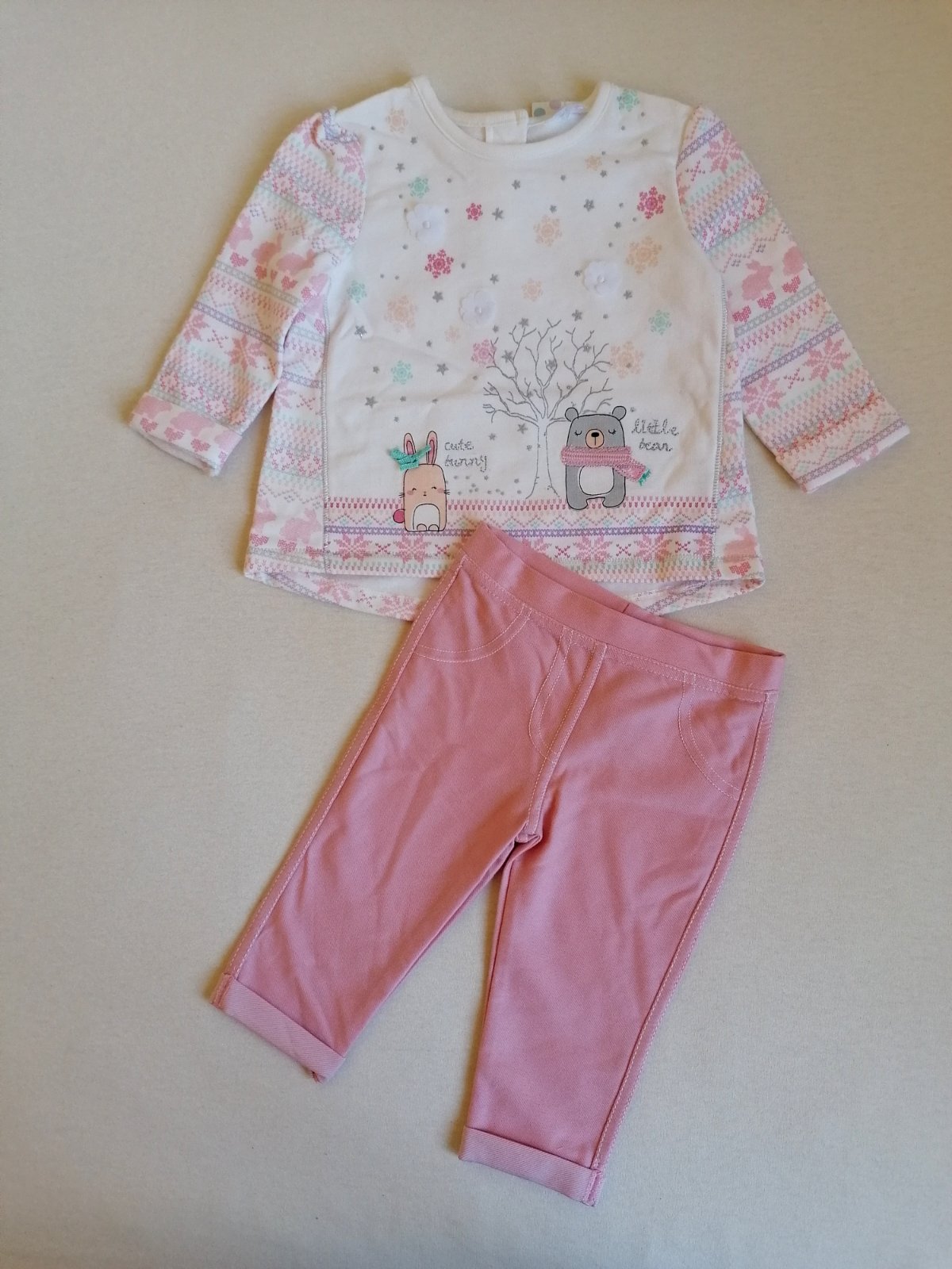 Vhodné aj ako darček. Top stav bez poškodení a známok nosenia. Teplejšia mikinka s aplikáciou na prednom dieli, k tomu legínky v páse do gumy, pekne elastické prispôsobia sa postave.