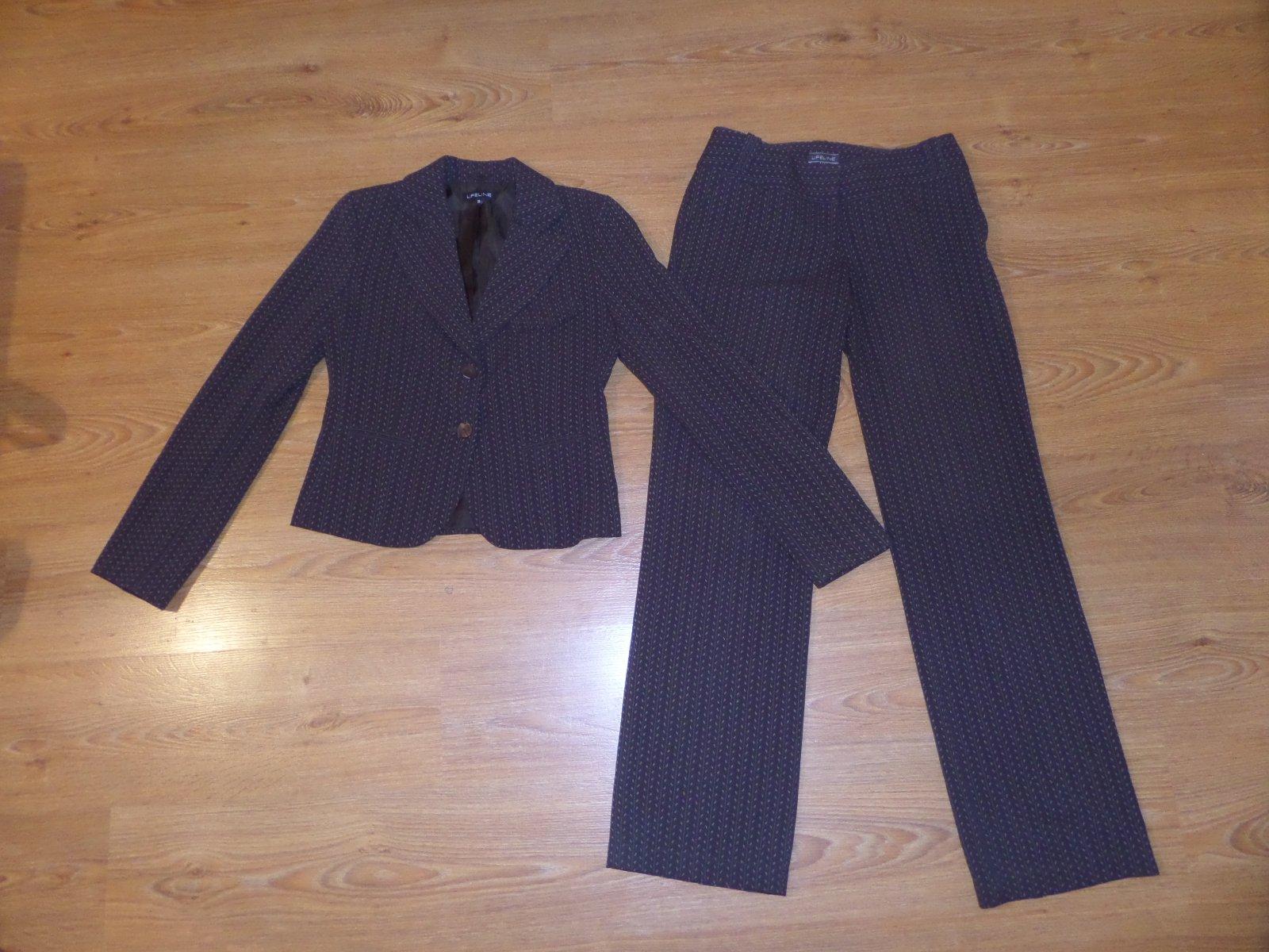 76ja. hnedy tenky kostym, velk. 38cm, 50%polyester, 35%pan, 15%vlna, sukna dlzka 50cm, pas 36x2 plus guma, boky 46x2cm, vrch dlzka 77cm, cez prsia 46x2cm, rukav 57cm