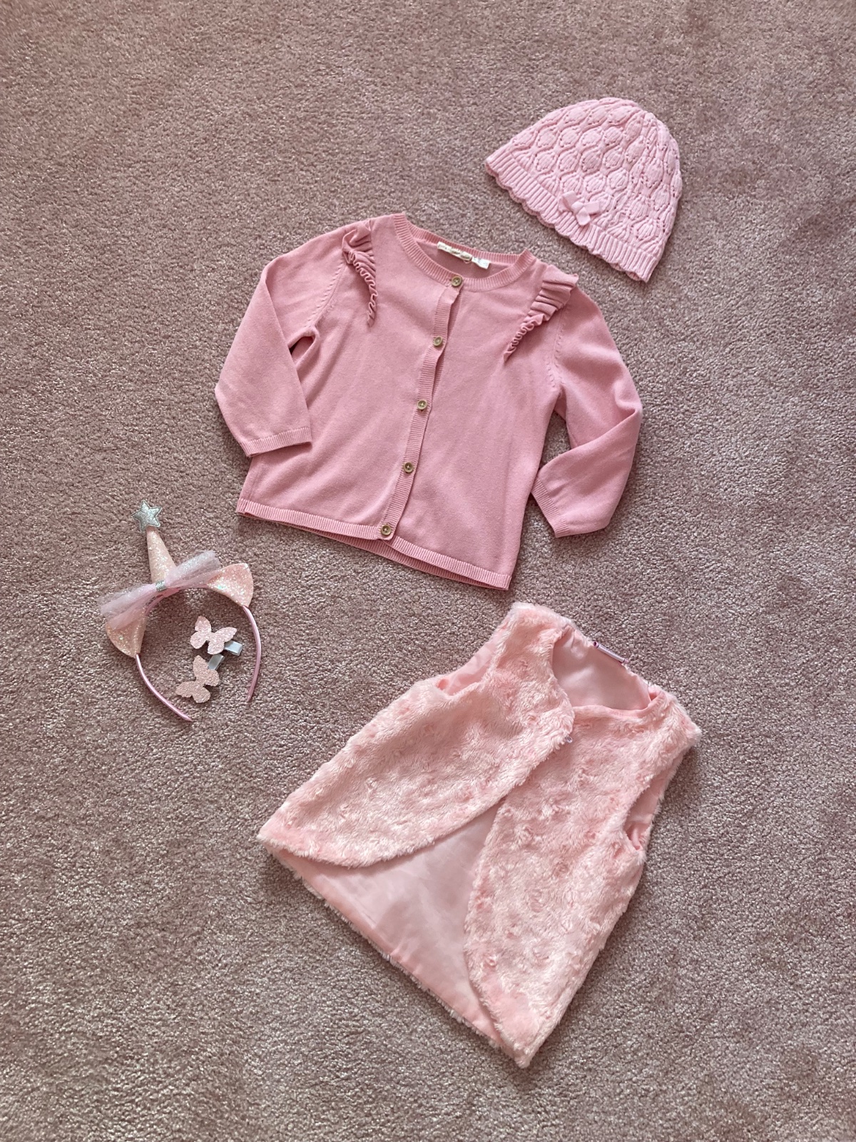 Ružový komplet (vestička, svetrík, čiapka, sponky, čelenka)