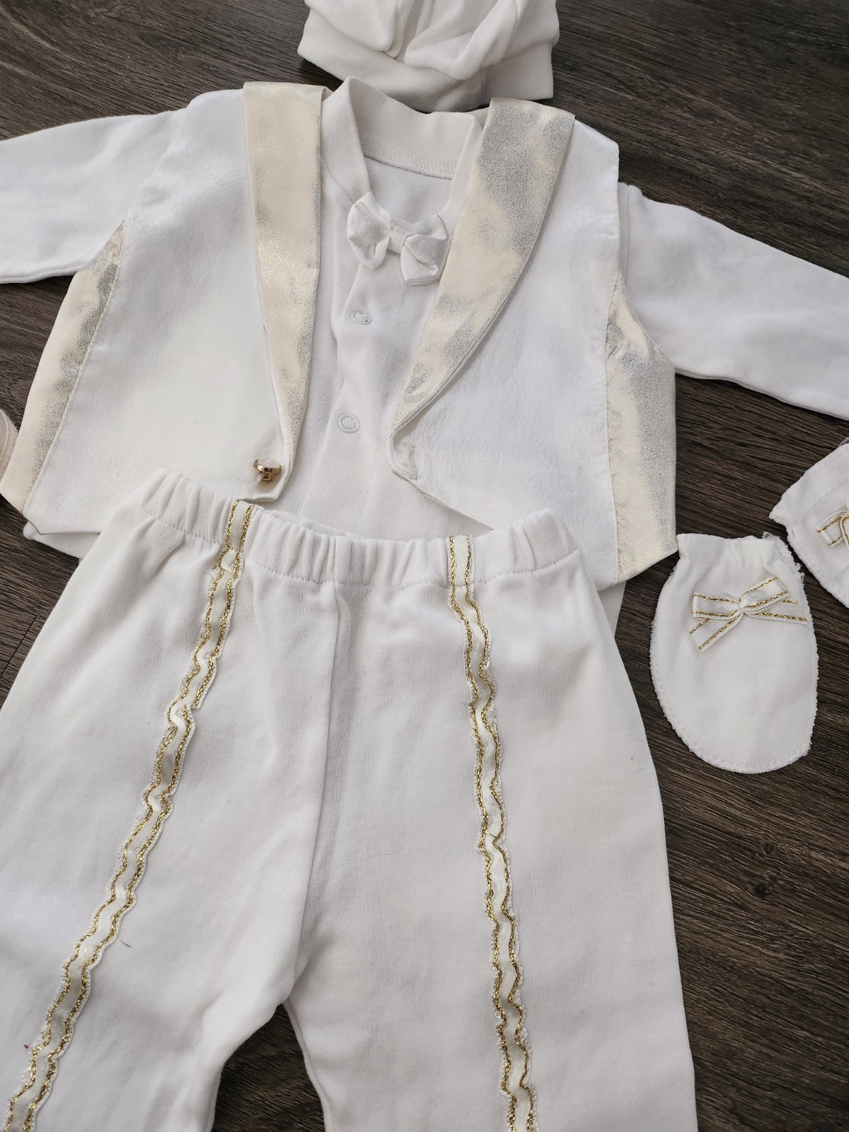 Set obsahuje ciapku, rukavice, topanky, nohavice, koselu a frak. Kosela sa oblieka samostatne a na to frak, nieje to zošite spolu.