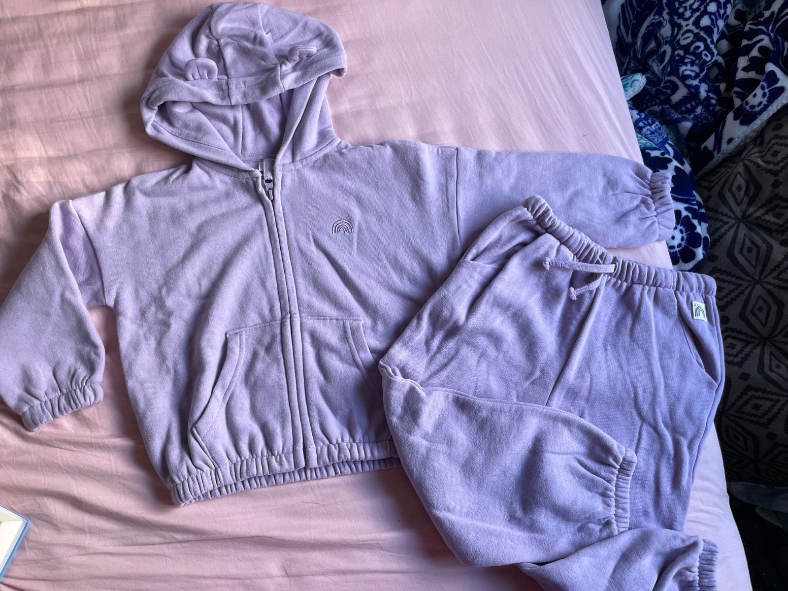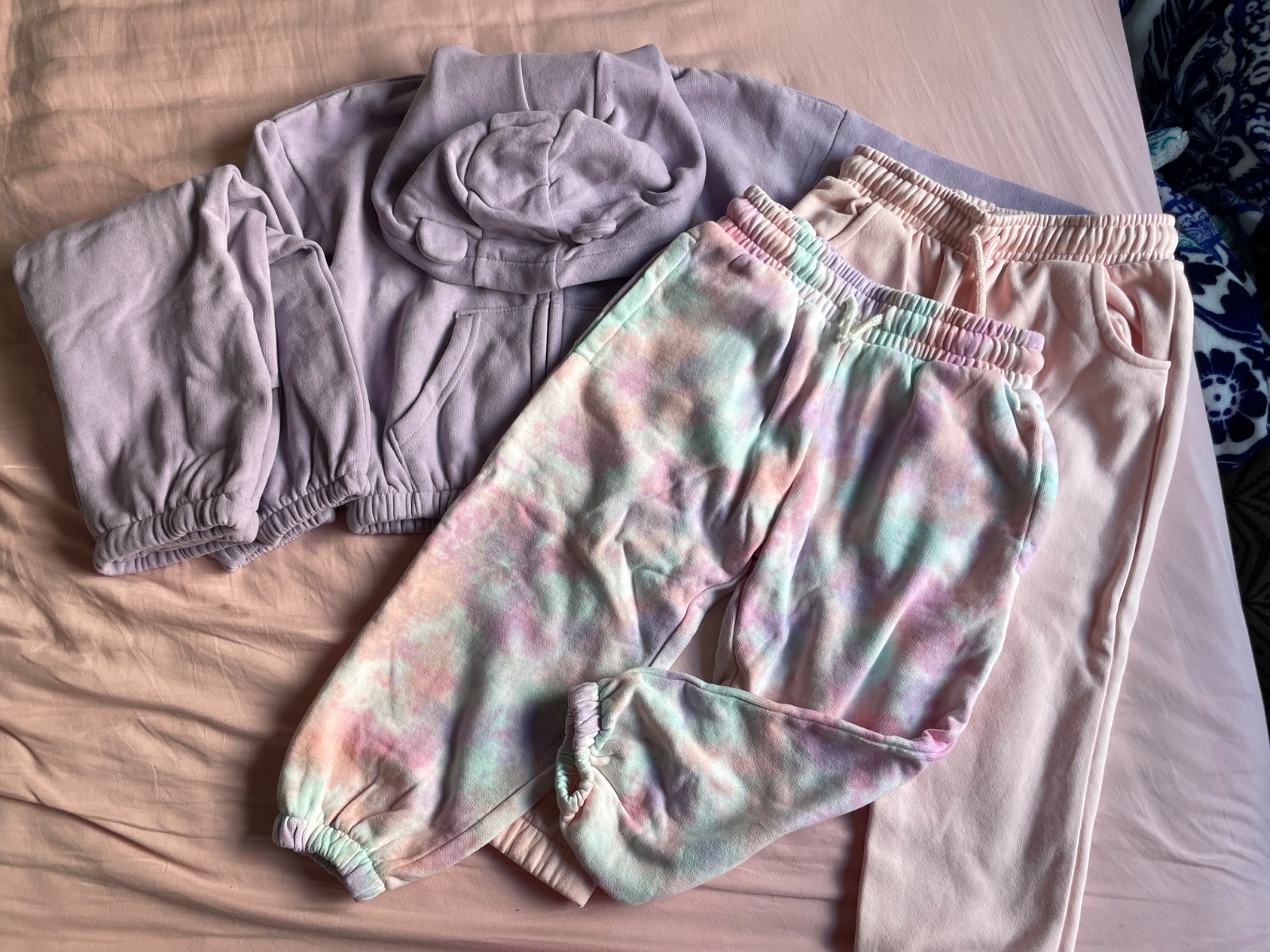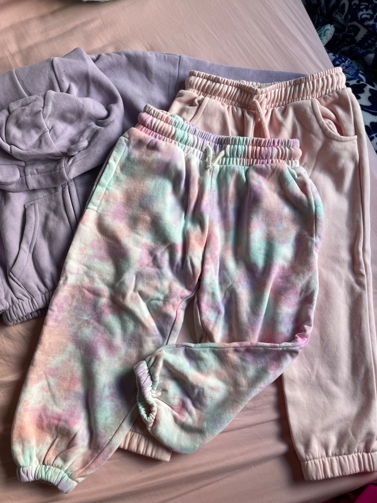 Veci sú úplne NOVÉ. Všetko veľkosť 104. Levanduľová súprava aj farebné tepláky sú značky Next. Bledoružové tepláky sú už predané. Cena za tepláky a mikinu - 4€ za kus. Pri odbere naraz všetko (mikina + 2x tepláky) cena dokopy 11€ + pošta
