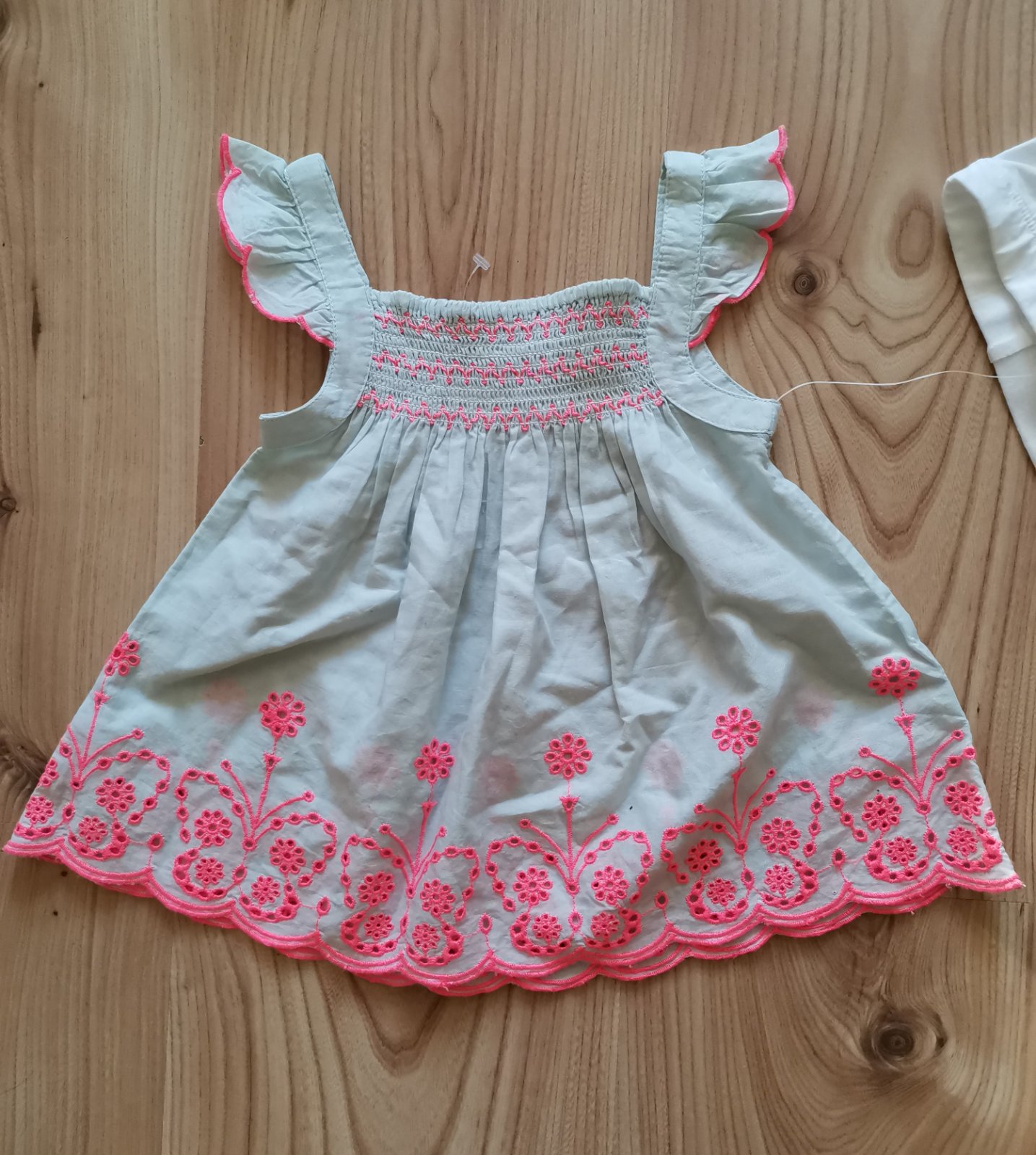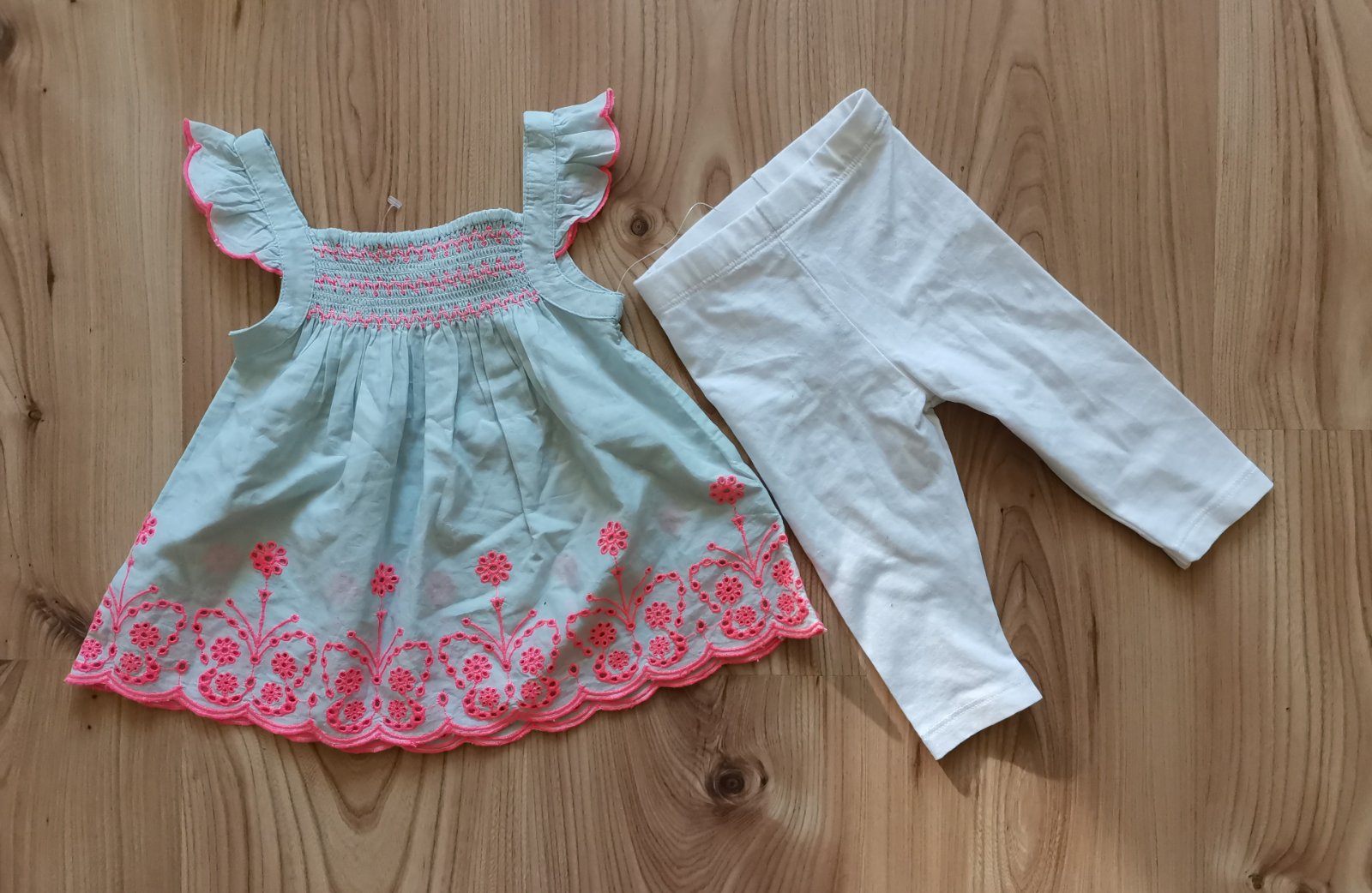Krásne letné šatôčky v jemnej, mentolovo zelenej farbe doplnené neónovo ružovou výšivkou, spolu s bielymi legínkami. Nové, sú ešte spojené plastovou šnúrkou, zabudla som na ne, tak dcéra nenosila. Veľkosť 68, legínky dĺžka 32cm, pás 2x17cm, šaty dĺžka 34cm, šírka cez hruď 2x22cm (sú voľného, A-čkového strihu).