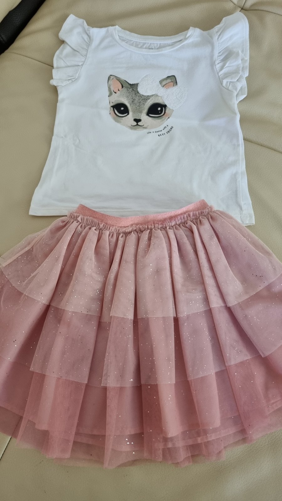 Súprava je ako nová, tričko je krásne biele, veľkosť 110/116.