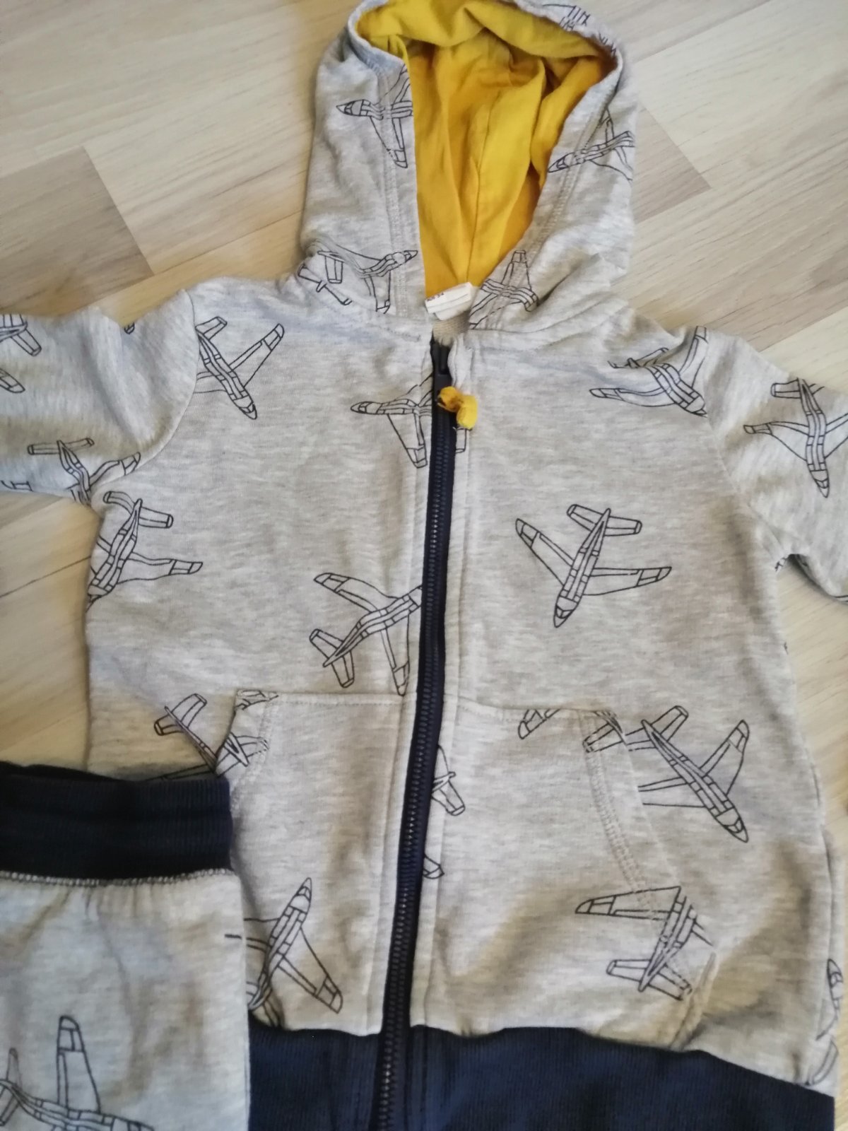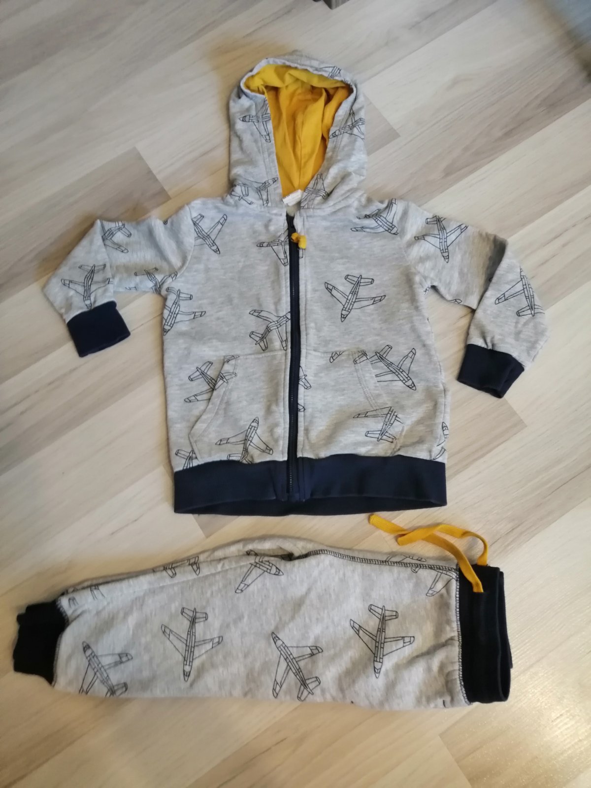 Pekný stav bez poskodeni. Teplaky veľkosť 98, dĺžka 51 cm, Mikina v. 98/104,dĺžka 40 cm, šírka 33 cm, dlzka rukáva od kapucne 42 cm.