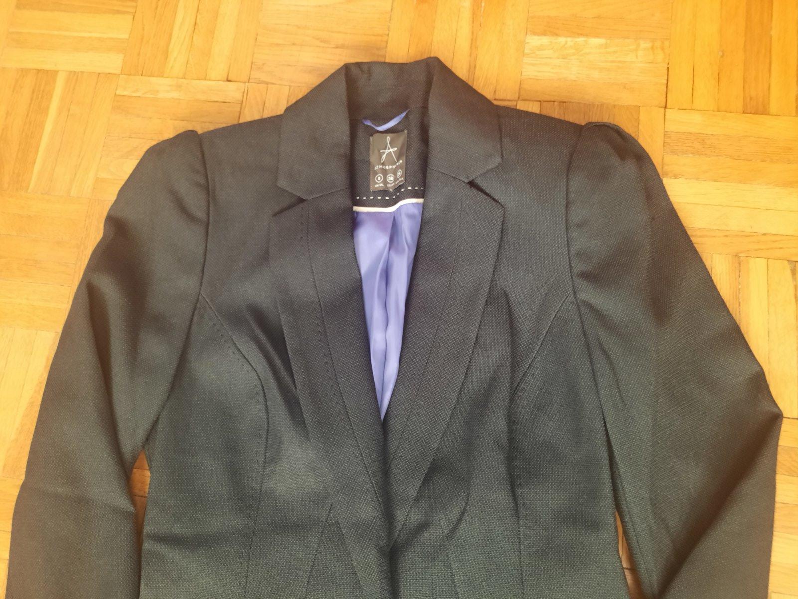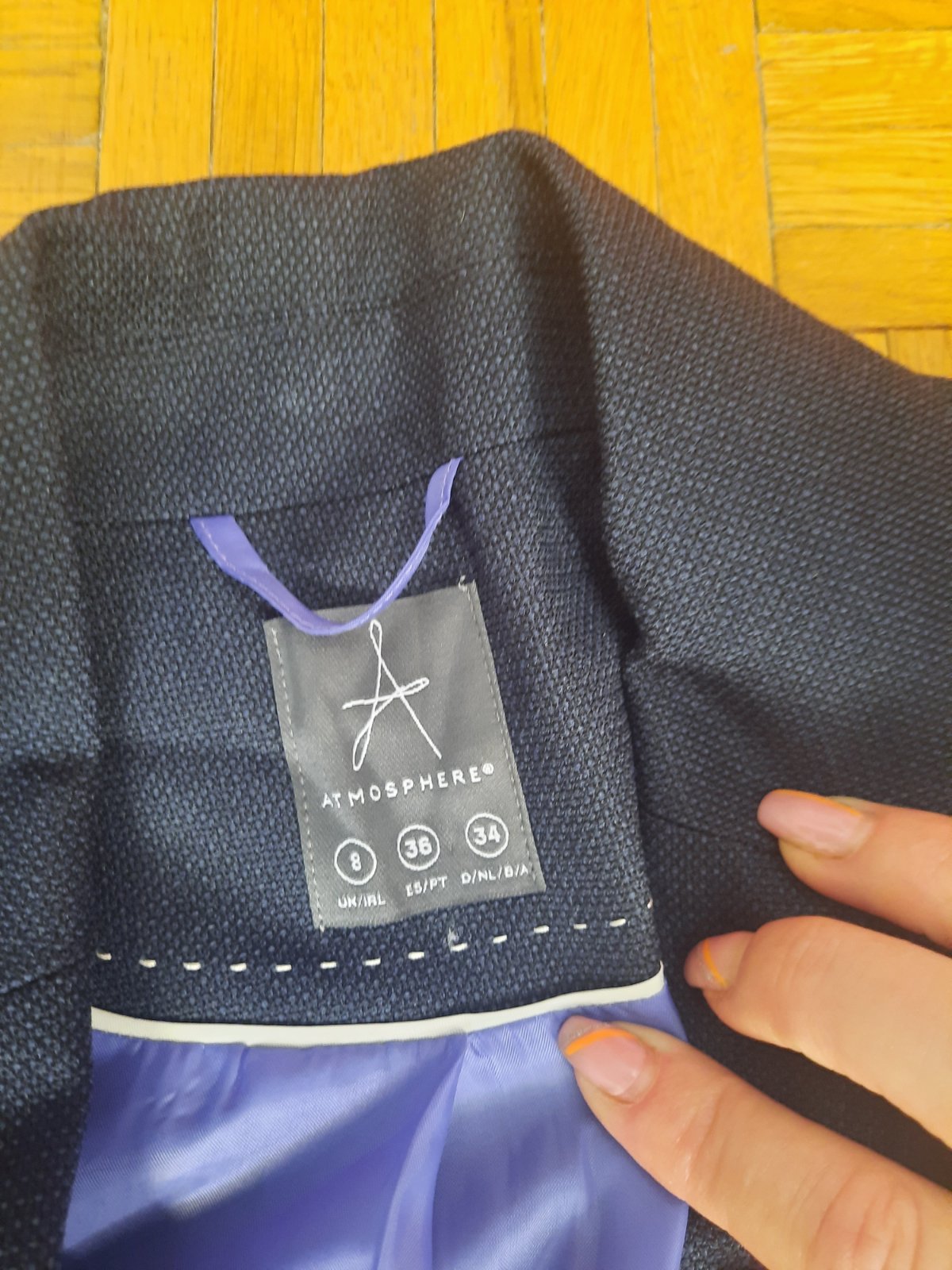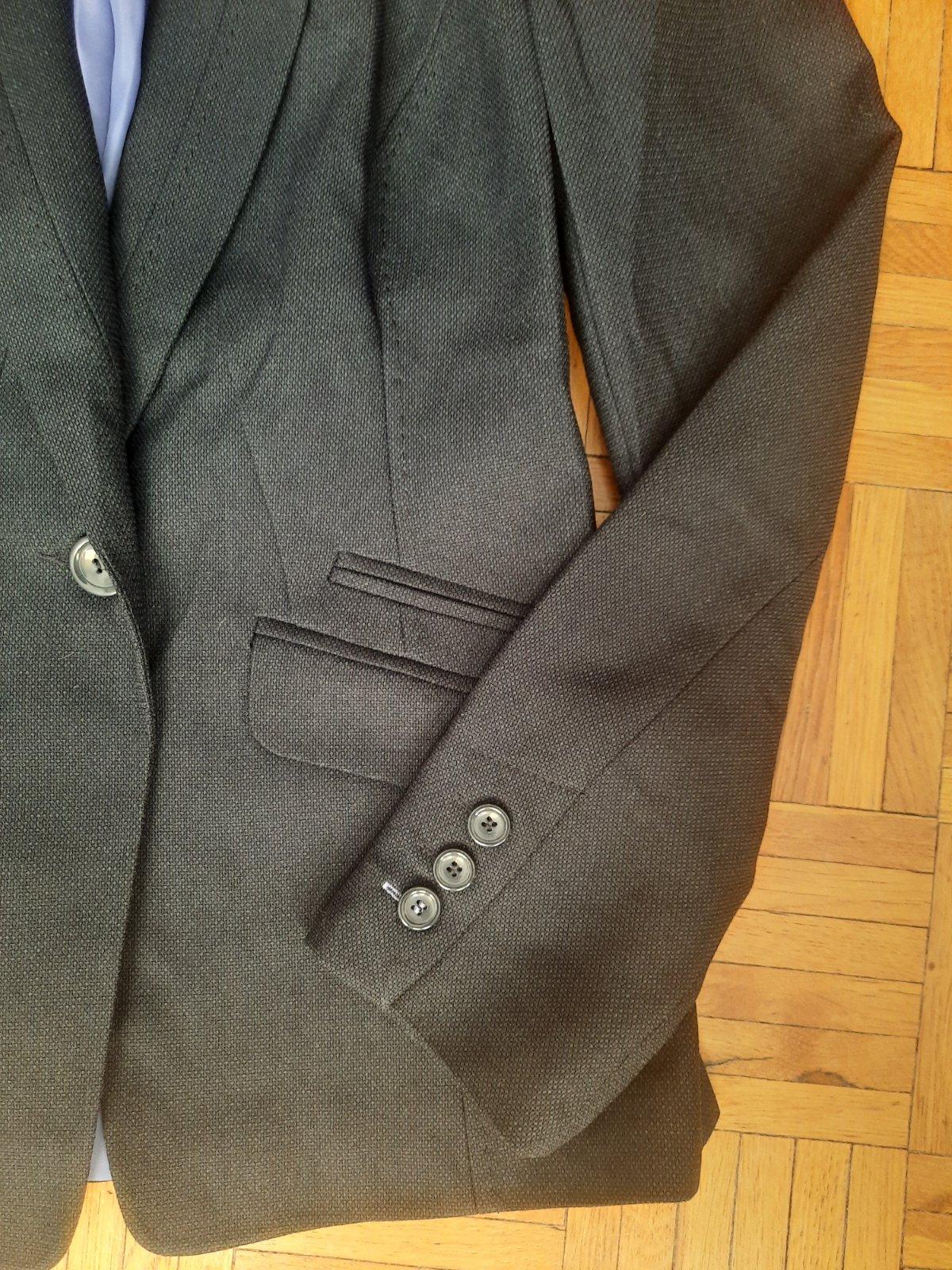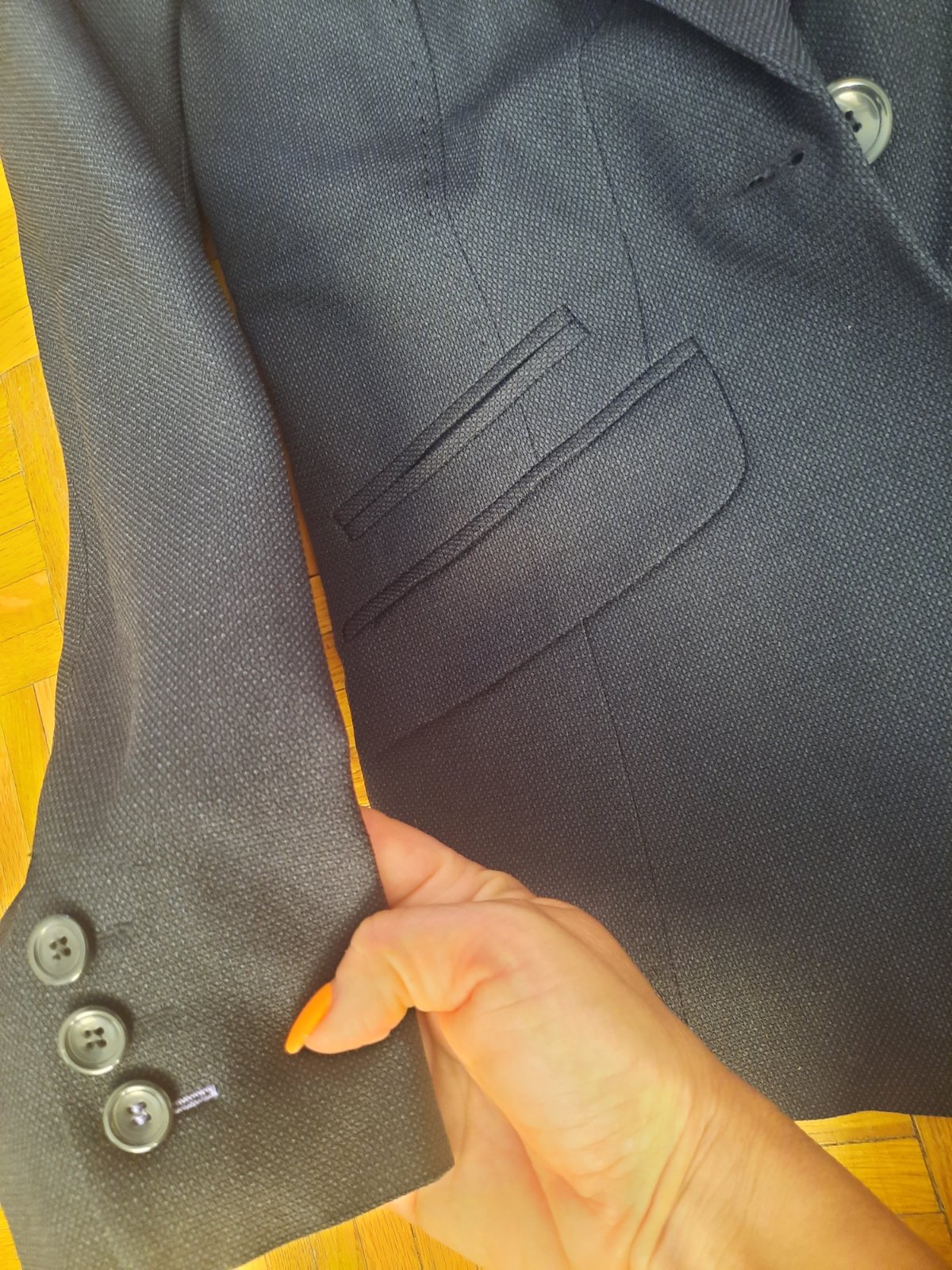 - podšité sako, má zaujímavý vzor v materiály. Farba je tmavá modrá. Zapínanie na 1 gombík.