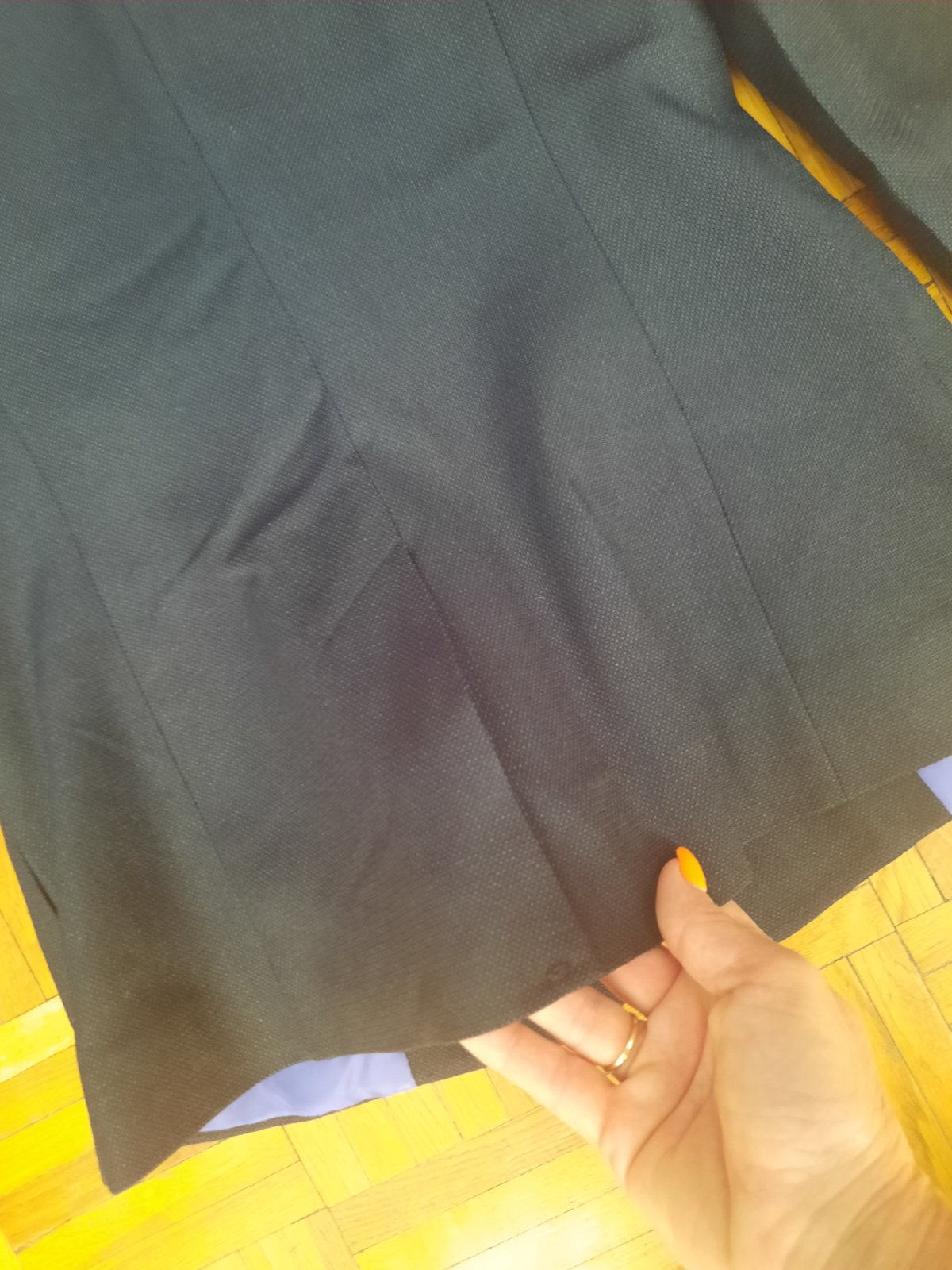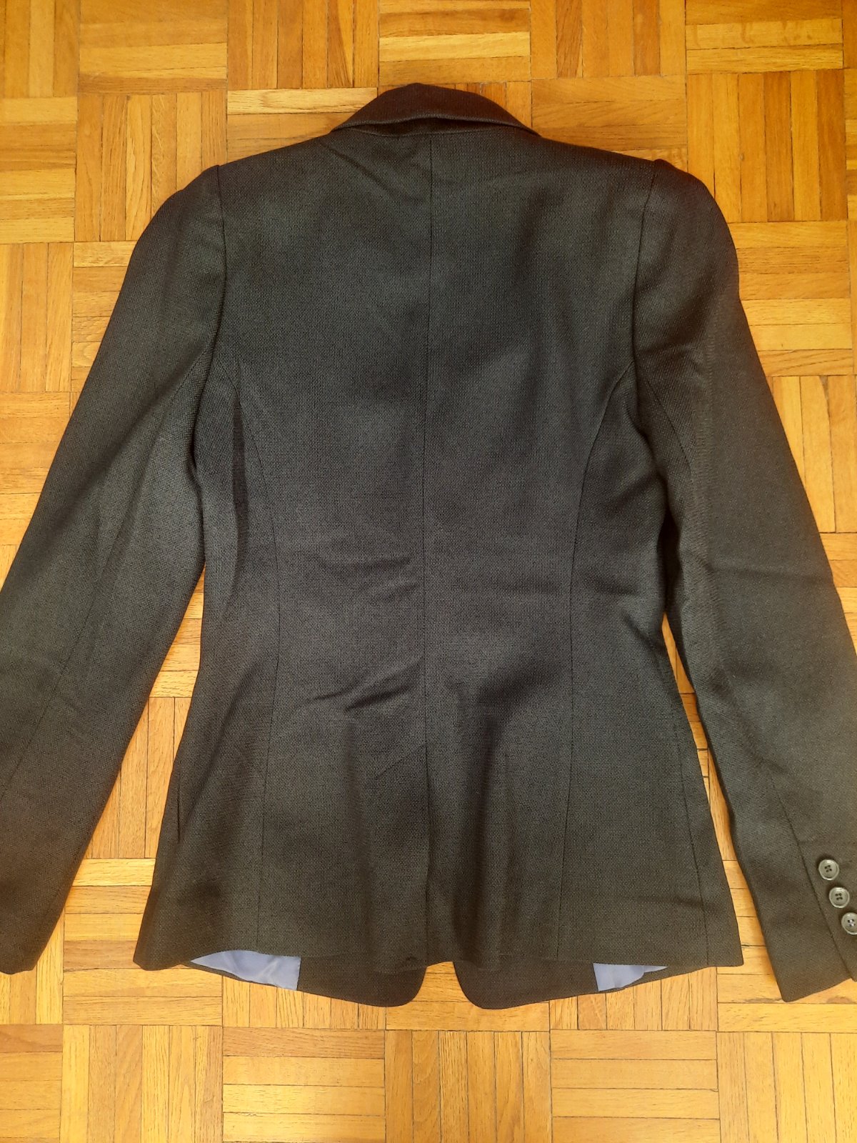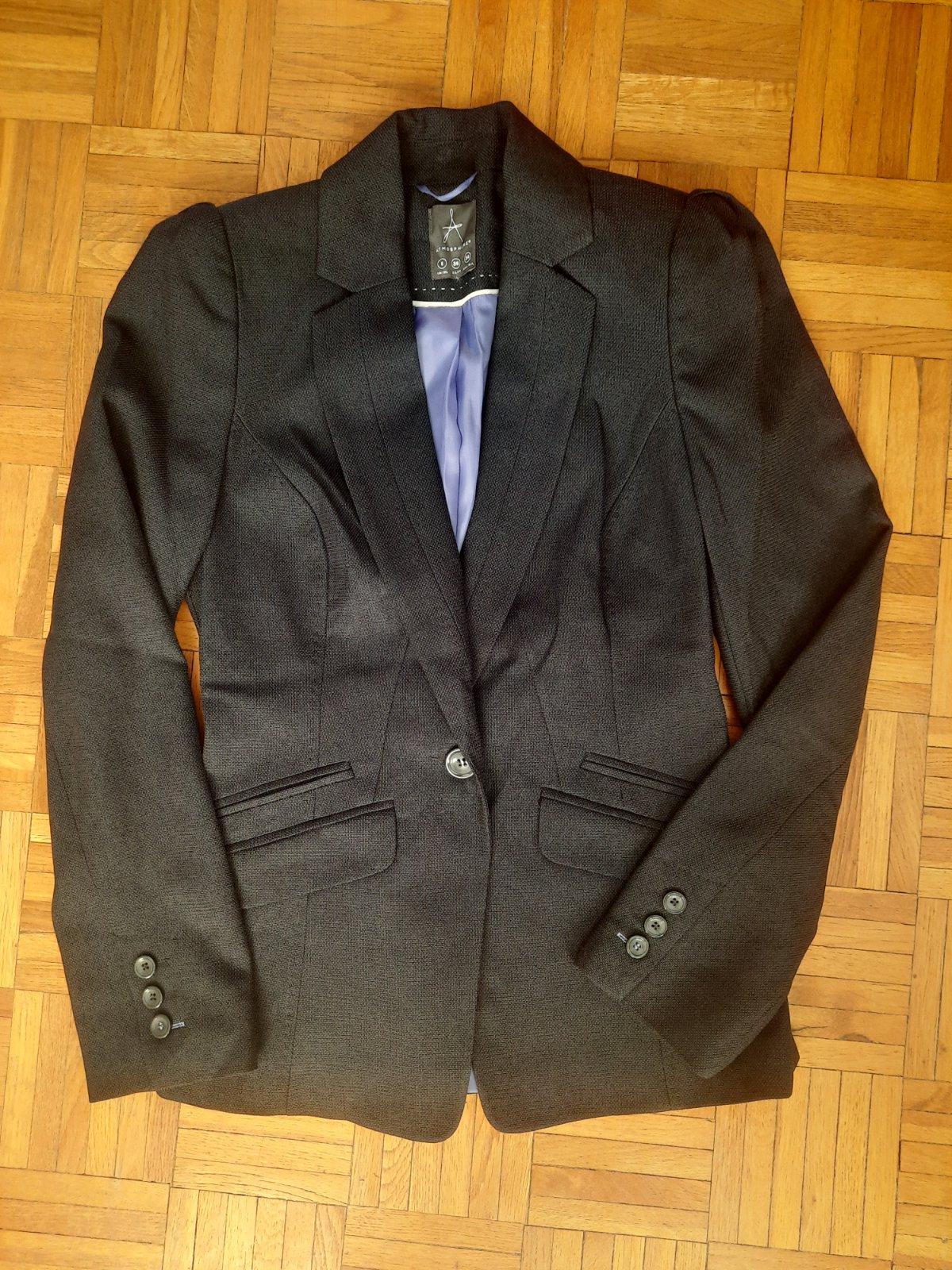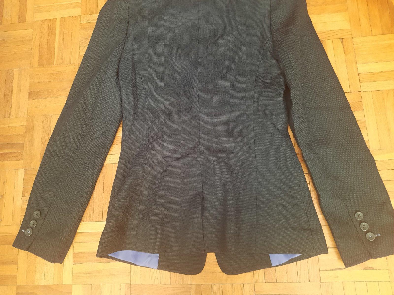 - podšité sako, má zaujímavý vzor v materiály. Farba je tmavá modrá. Zapínanie na 1 gombík.