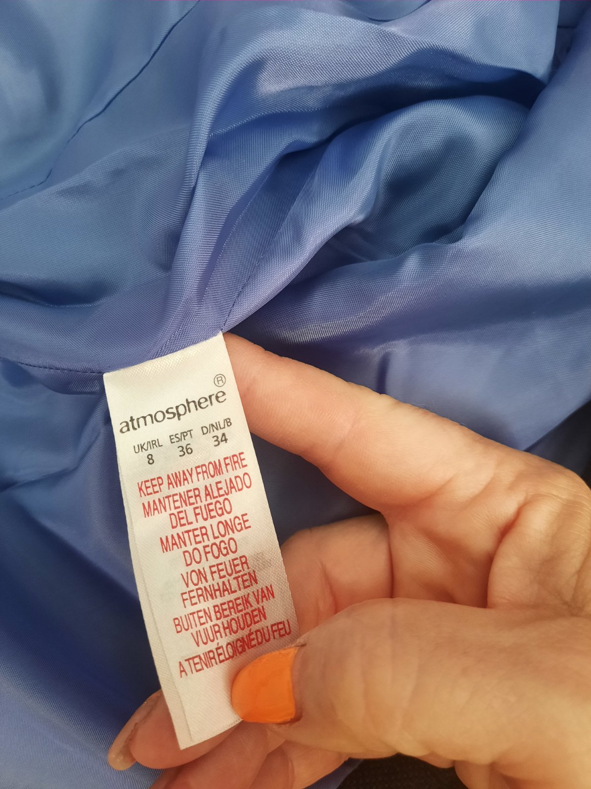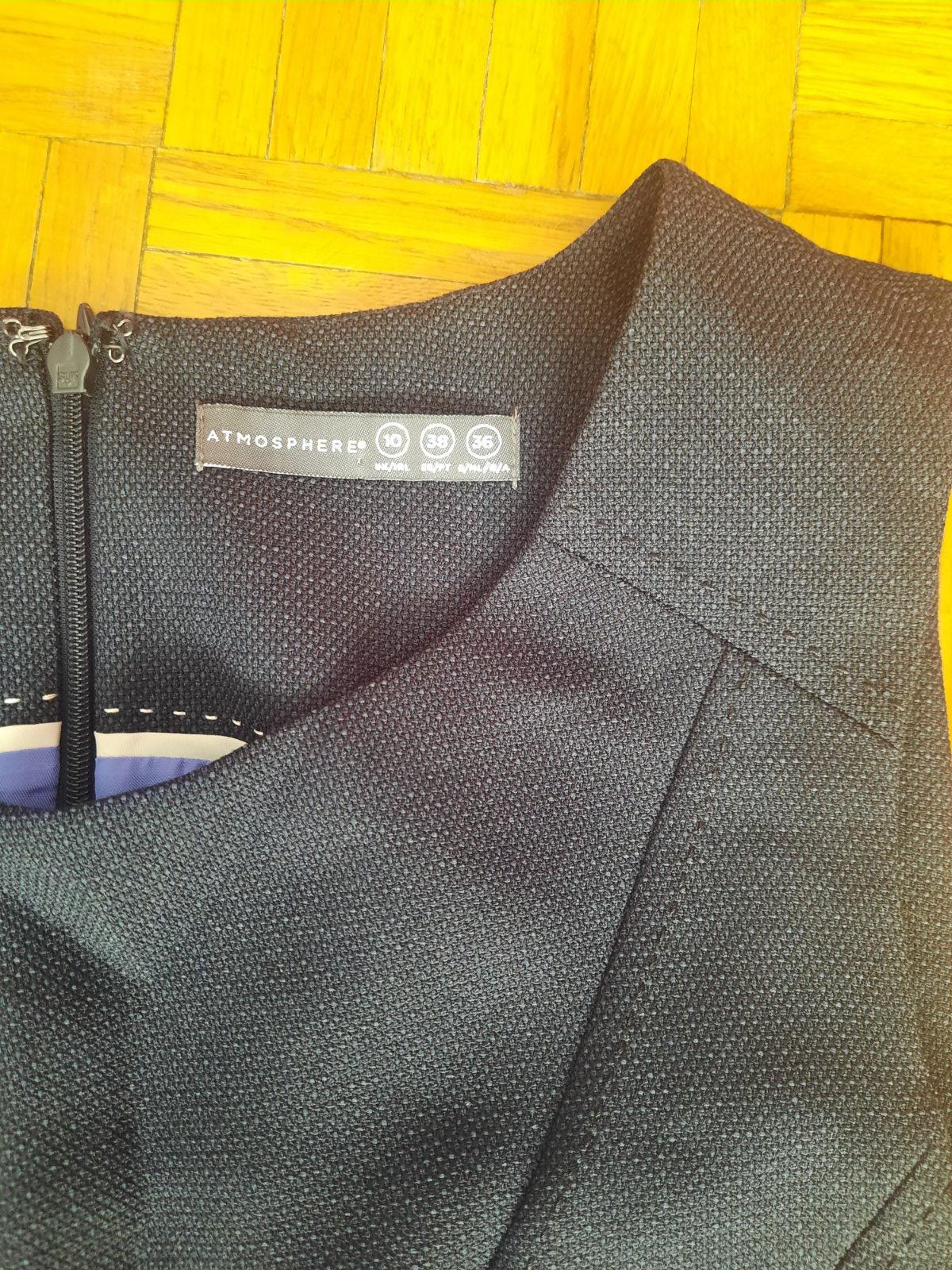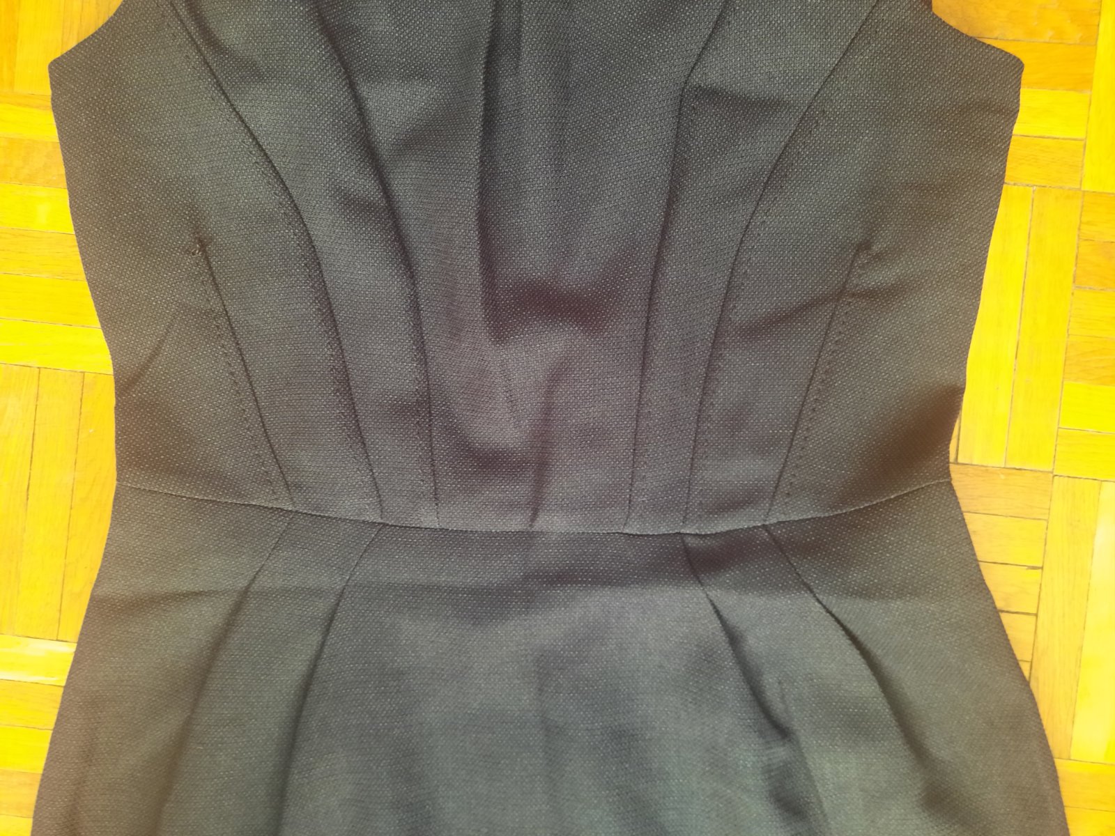 - podšité puzdrové šaty. Vzadu je zips. V páse sú prestrihnuté. Farba je tmavá modrá. Látka má zaujímavú štruktúru.