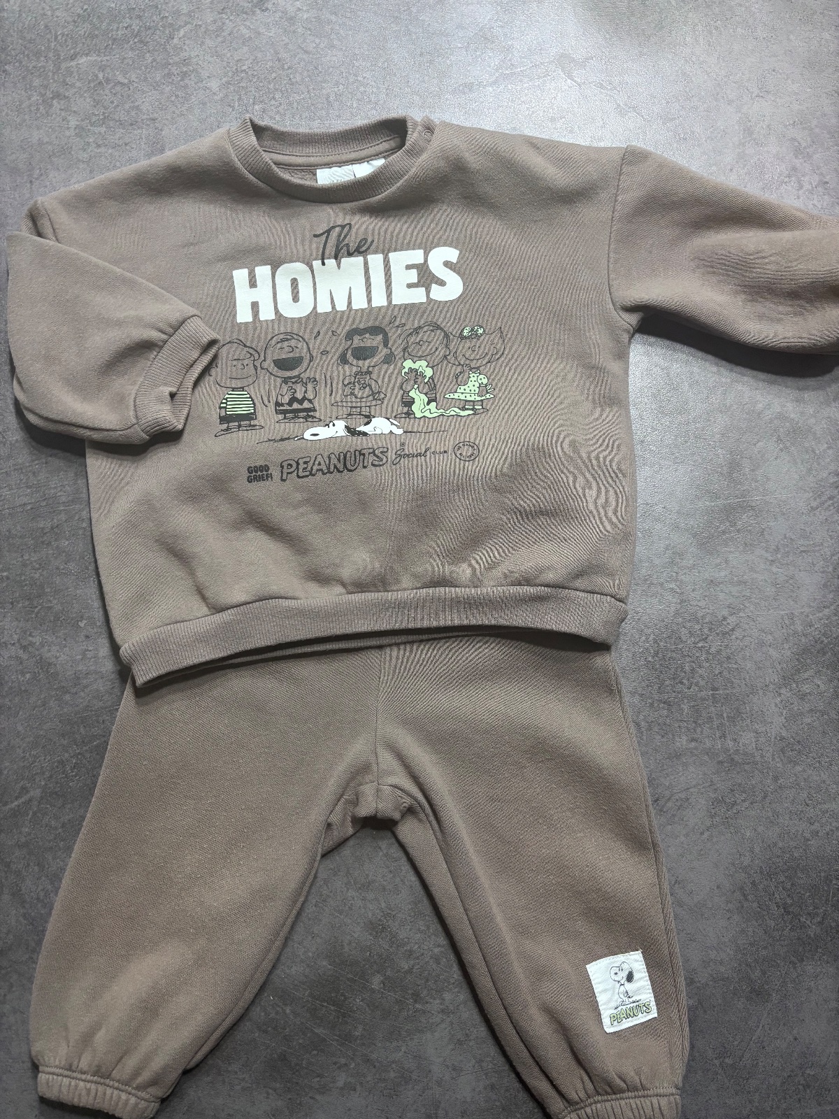 Súprava hnedá je vo výbornom stave, akurát na zelených nohaviciach je malá dierka