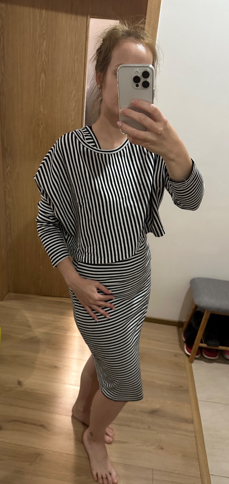 krásny komplet ktorý je veľmi variabilný,kvalitný,raz oblečený,top stav,sukňu možno nosiť i samostatne podobne ako vršok,veľmi netradičný a zaujímavý top model,na boku vrchného dielu zips pre ľahši...