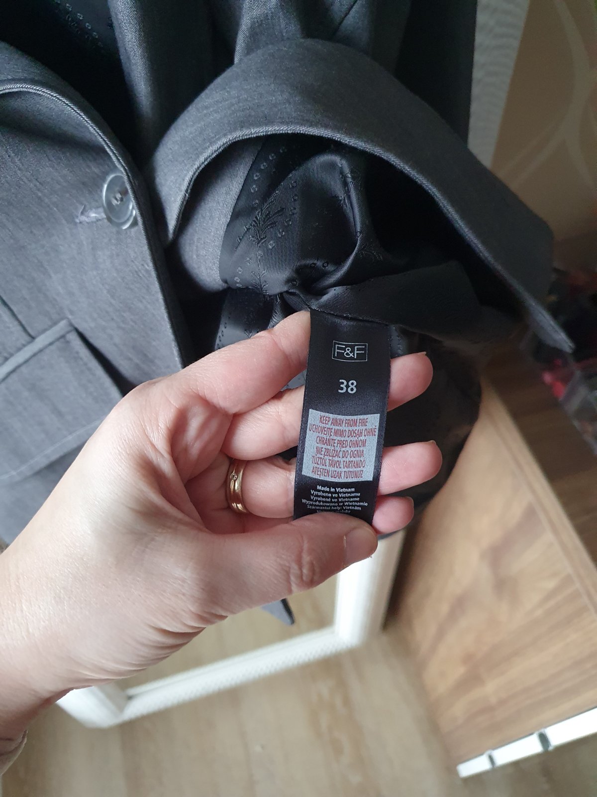 Posúvam 1x oblečený nohavicový dámsky kostým značky Promod, veľkosť 38. Sako má dvojradove zapínanie (nezapína sa), dve vrecká, trochu dlhšie. Nohavice s vyšším pásom (na bruchu trochu nariasene), ...
