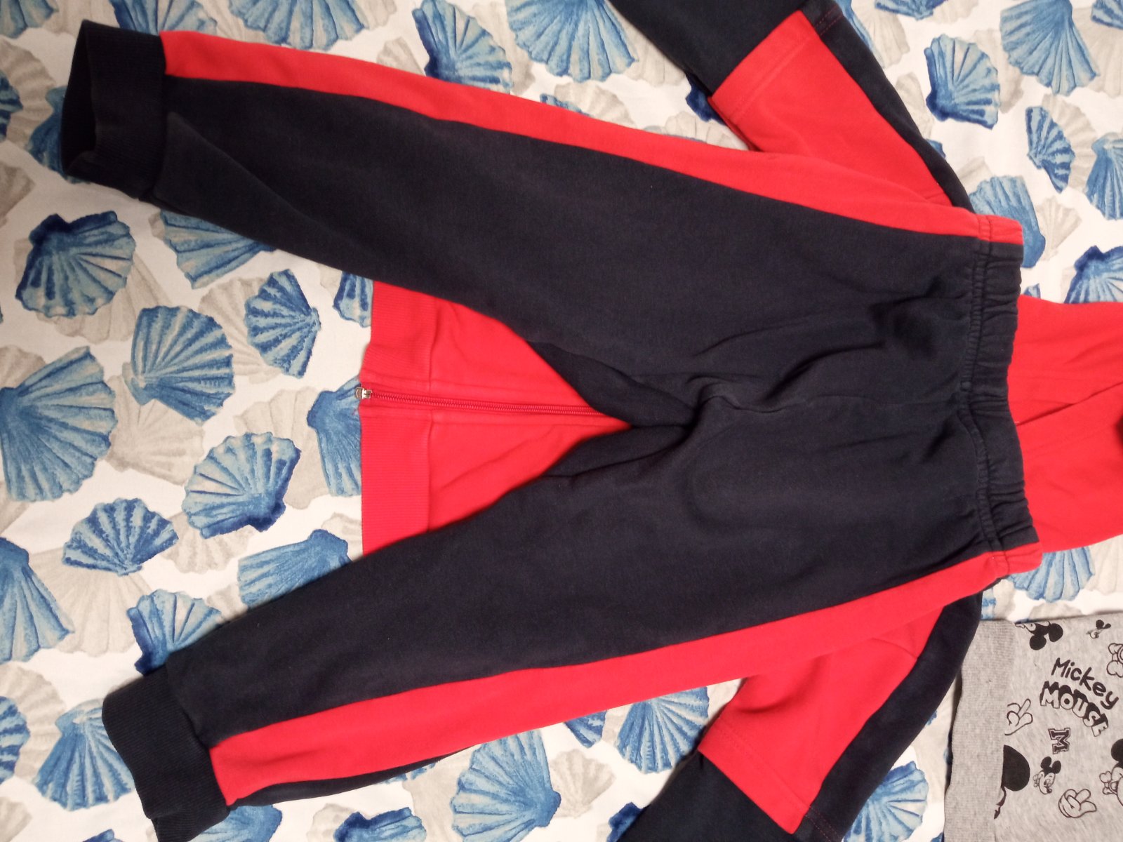 Po synovi 3 teplákové súpravy 18-24m a 2-3roky, veľkostne všetky rovnaké, všetky nosené, modrá súprava má zasivanu dierku na zadku. Červená ma pudlovy strih, a mikina Mickey mouse má aj tepláky (tie sú najviac nosené - nie je zahrnuté v cene, pribalim ako grátis). Určite ešte dobre poslúžia. Cena symbolická. Poštovné ako balík na pobočku pošty 3.90€.