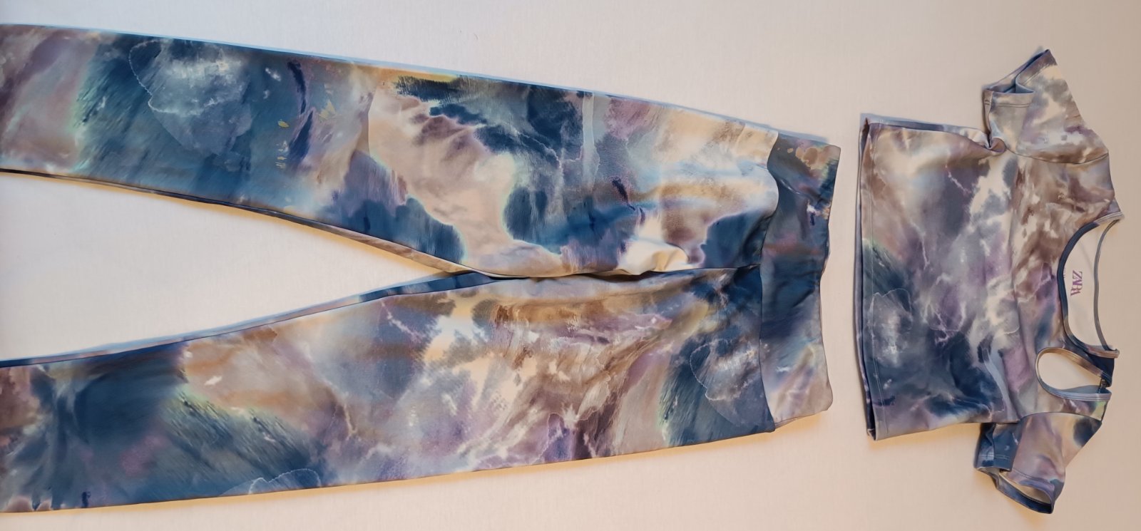 Komplet acid 2 x oblečený, je elastický. Obvod pásu legín ia 56 cm, dĺžka legín 83 cm dĺžka crop topu 37 cm