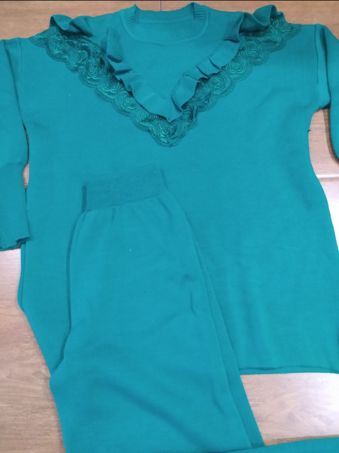 Komplet sa skladá z dlhšieho sveta zdobené ho krajkou a nohavíc v páse guma.Farba ako na 1foto