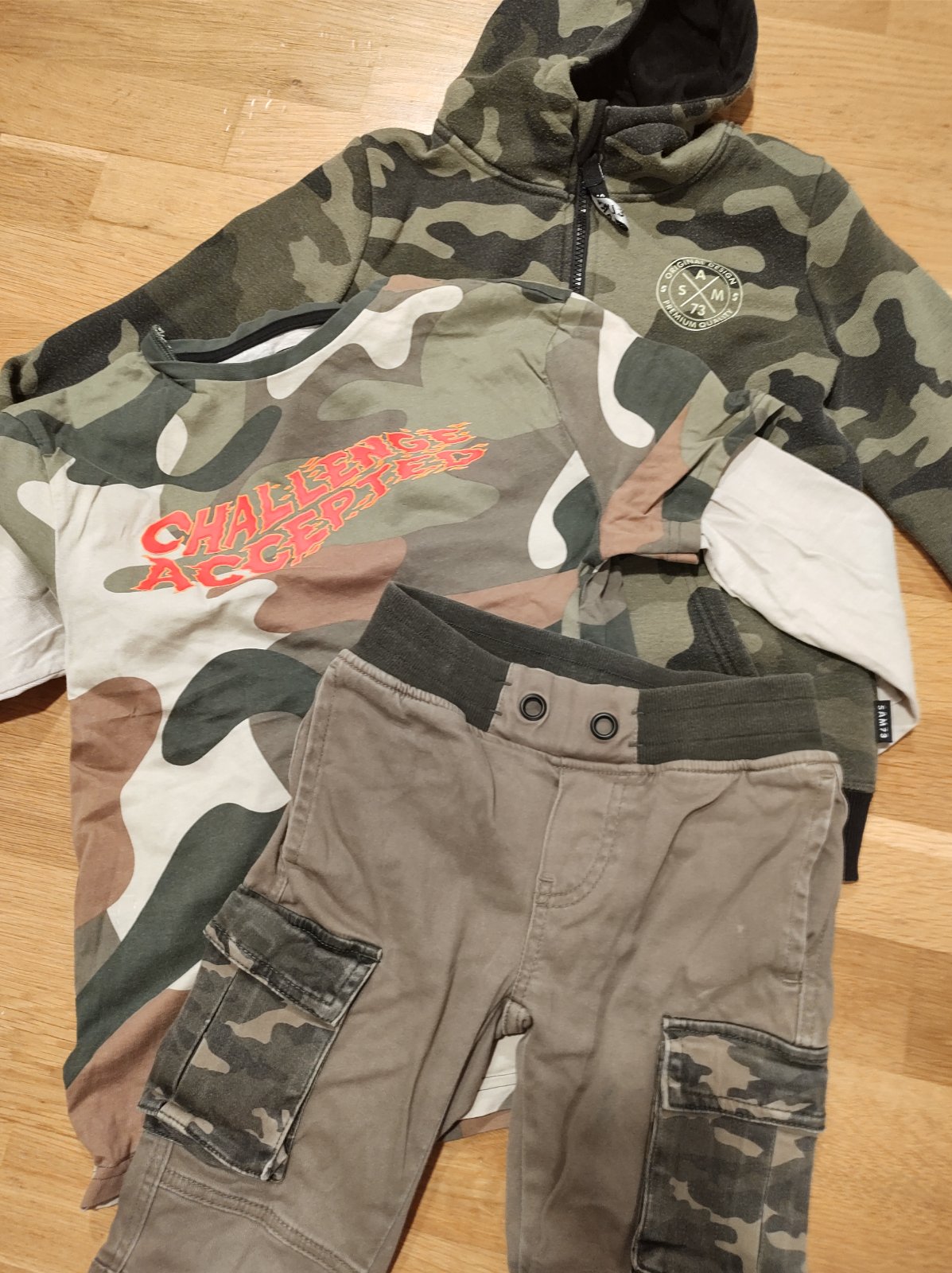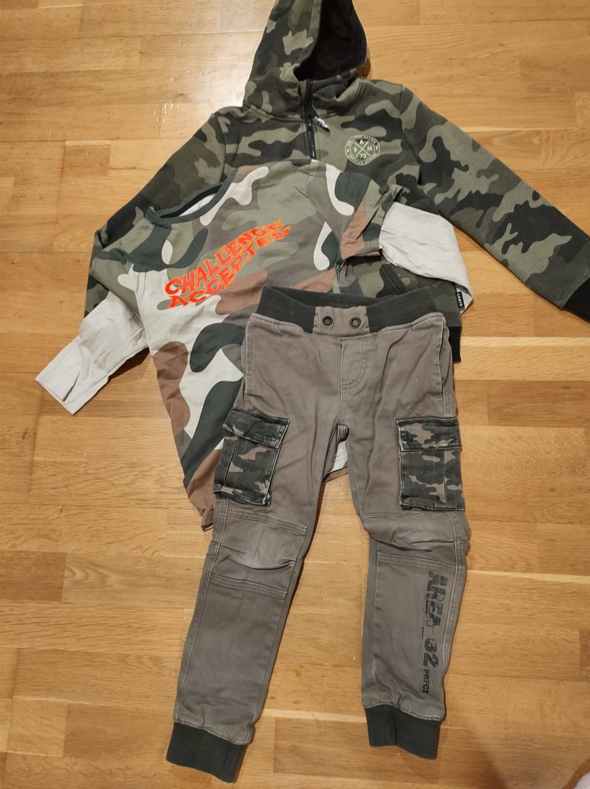 Tričko s dlhým rukávom bez chýb, mikina so žmolkami, nohavice ťažko nosené.