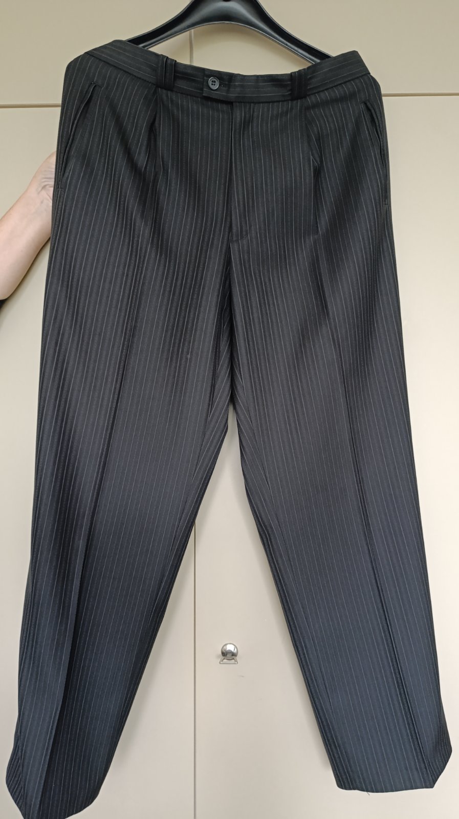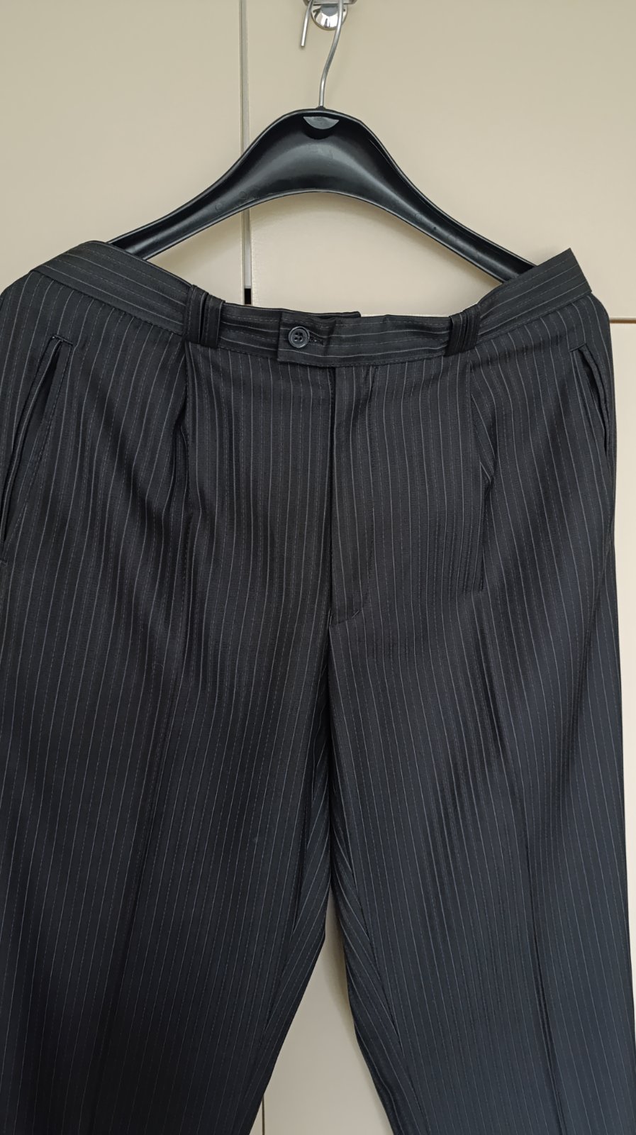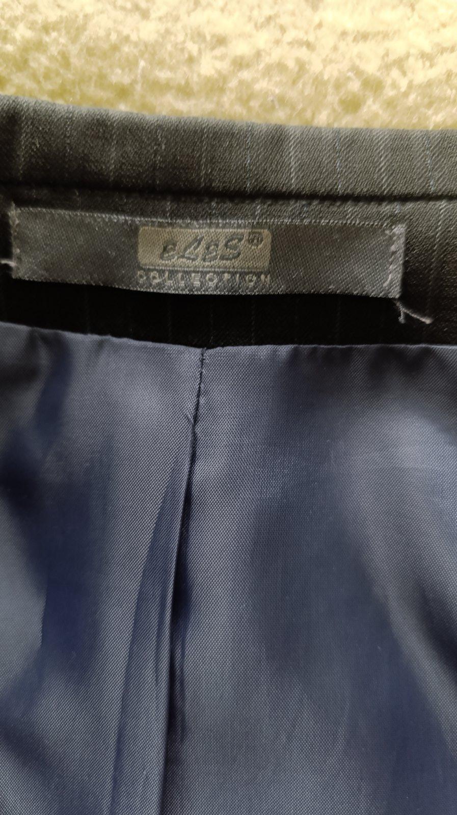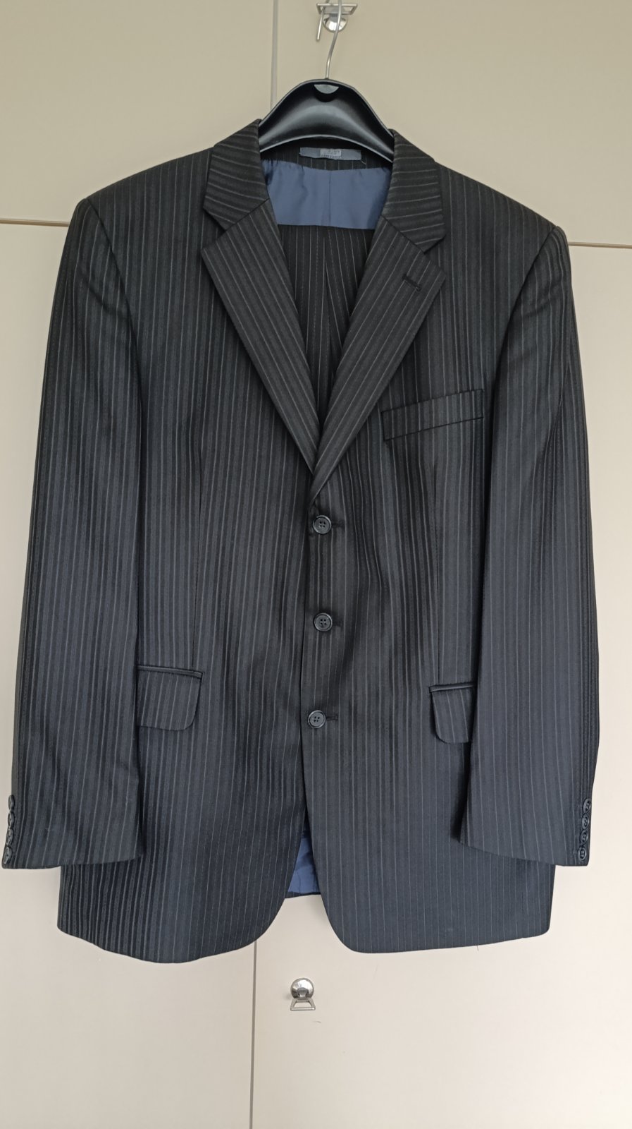 Pruhovany oblek s pasikmi,vrecka,velmi dobry stav,,,material 60% polyester,40% vlna