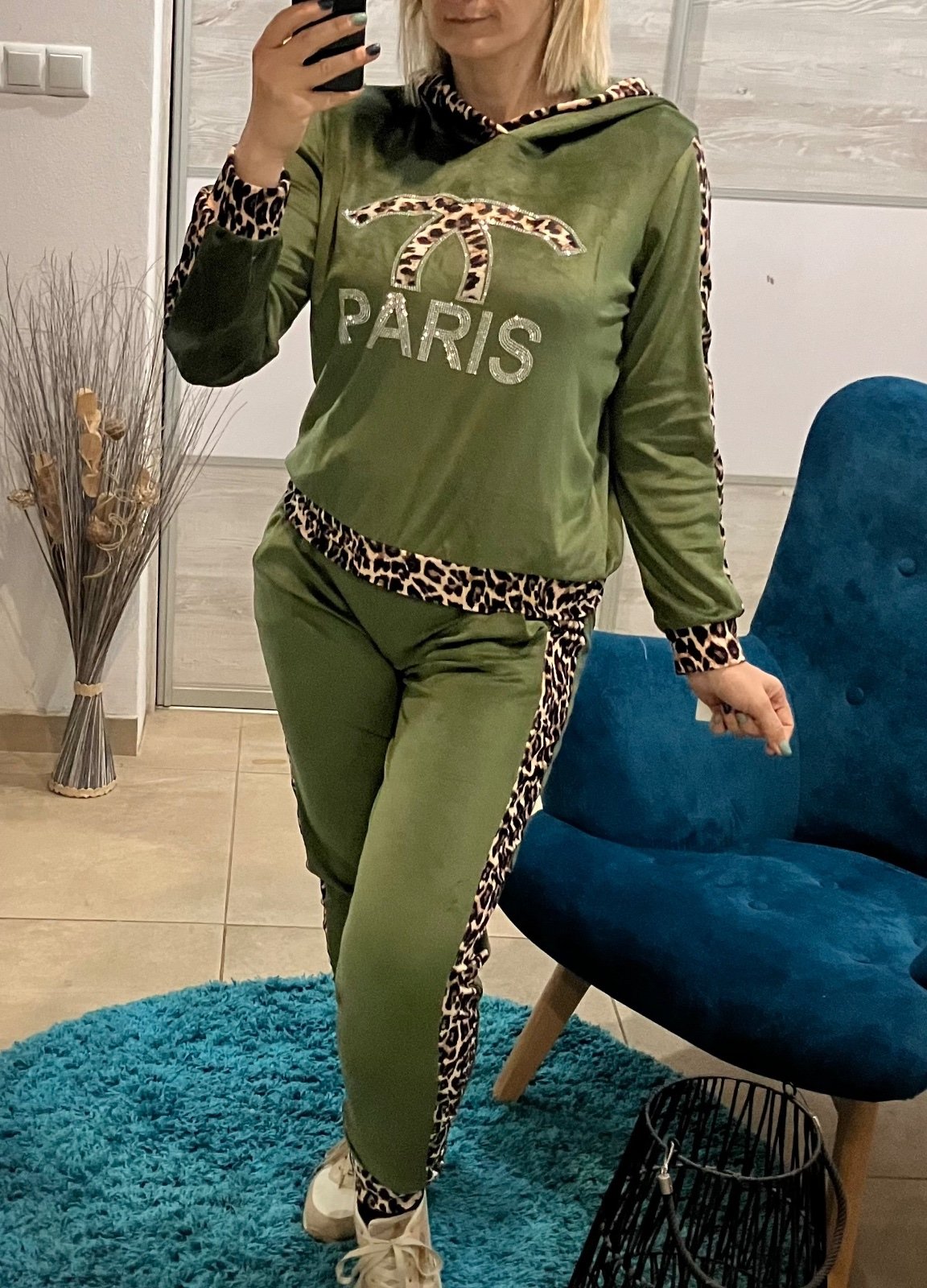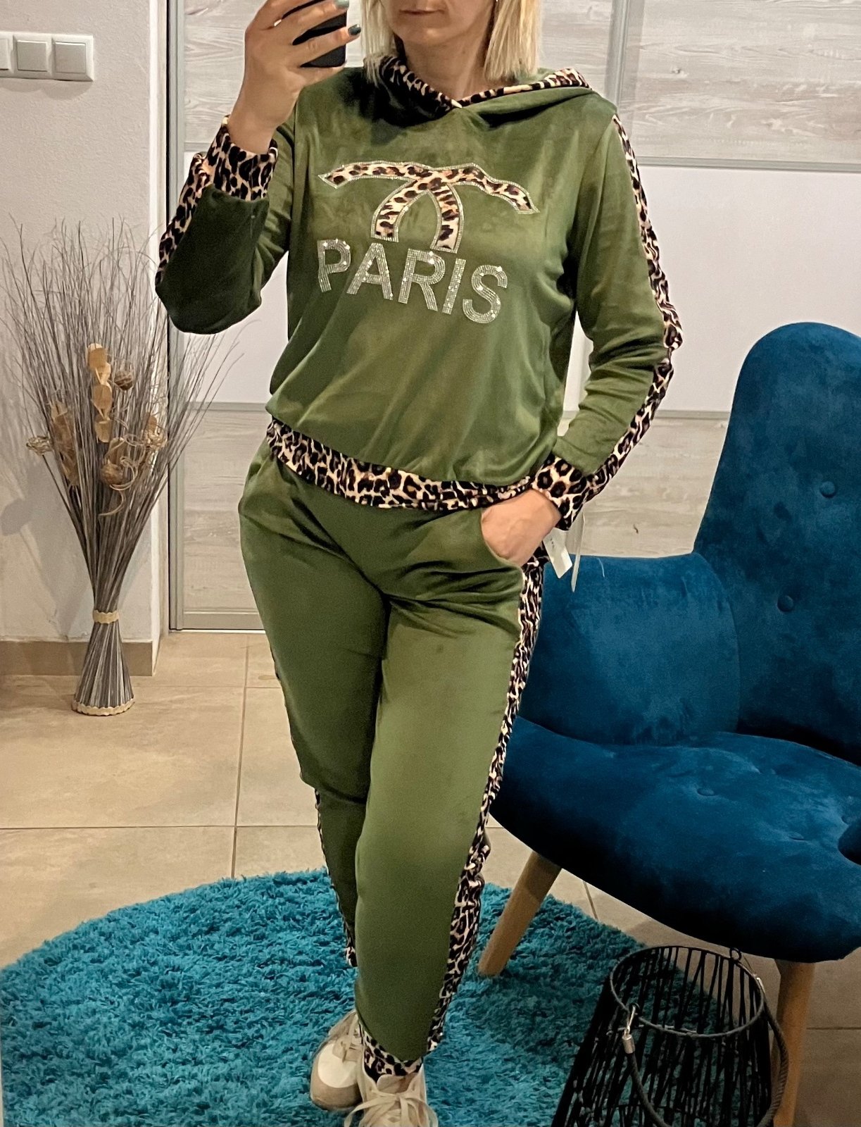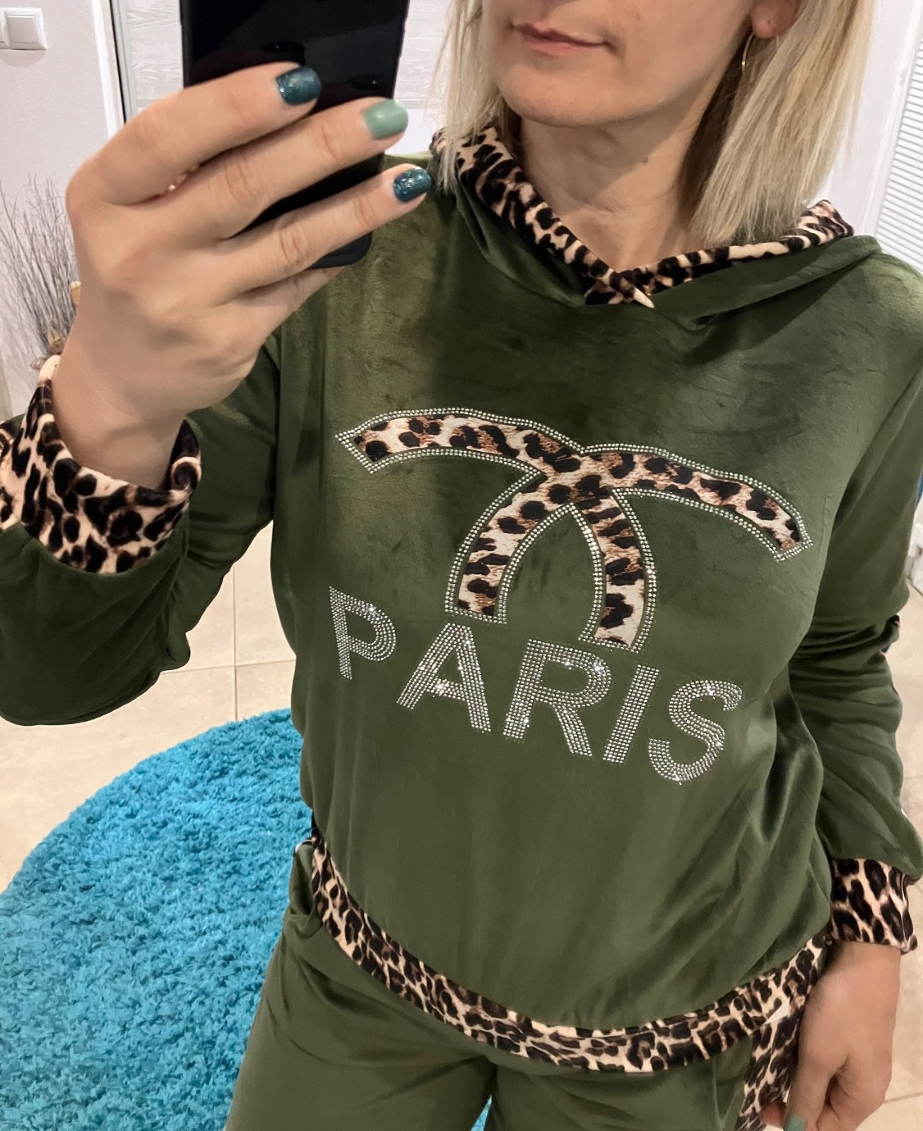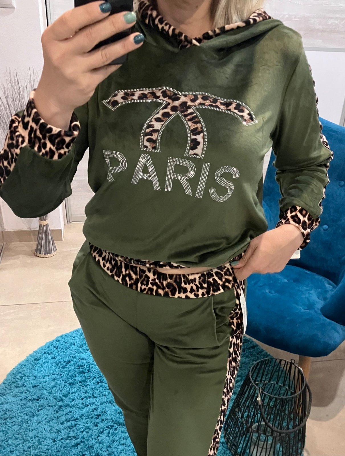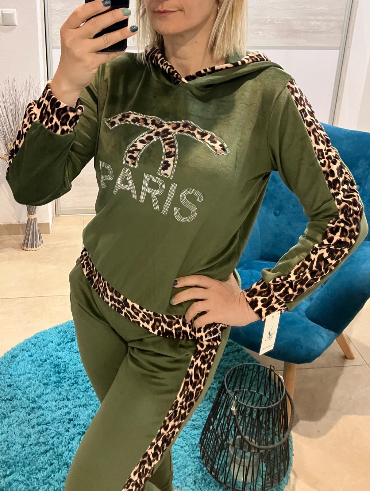 SkladomDámska khaki zamatová súprava s leopardím vzorom na manžetách, bokoch nohavíc a na kapucni. Vrchná časť zdobená leopardím vzorom a nápisom Paris s kamienkami. Elastická. Nohavice pás na gumu. Patent na spodku.
