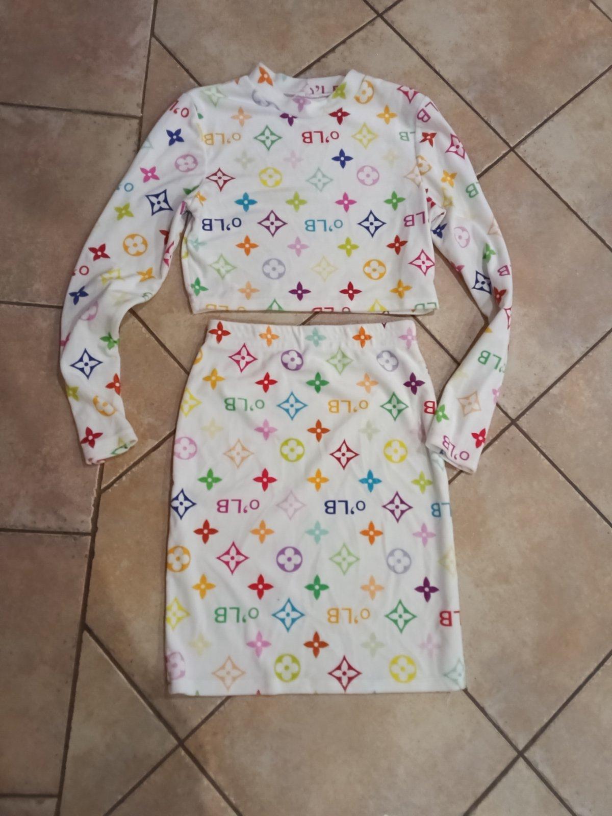 Sadne na veľkosť S/M. Krásny setik na mikine strapce na rukách aj na chrbte. Sukňa lambada. Riaďte sa mierami. Mikina Dlzka 65cm Šírka cez prsia 2x57cm Rukáv od krku 62,5cm Sukňa Dlzka 41cm Pás 2...