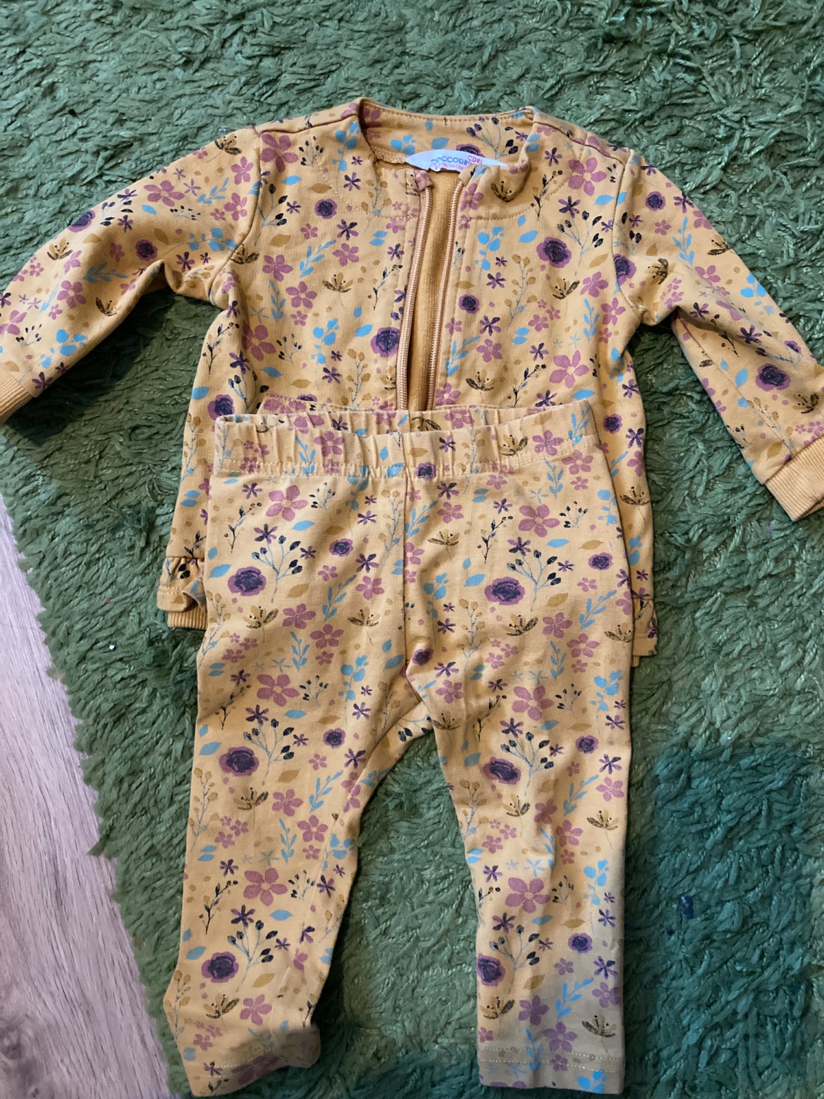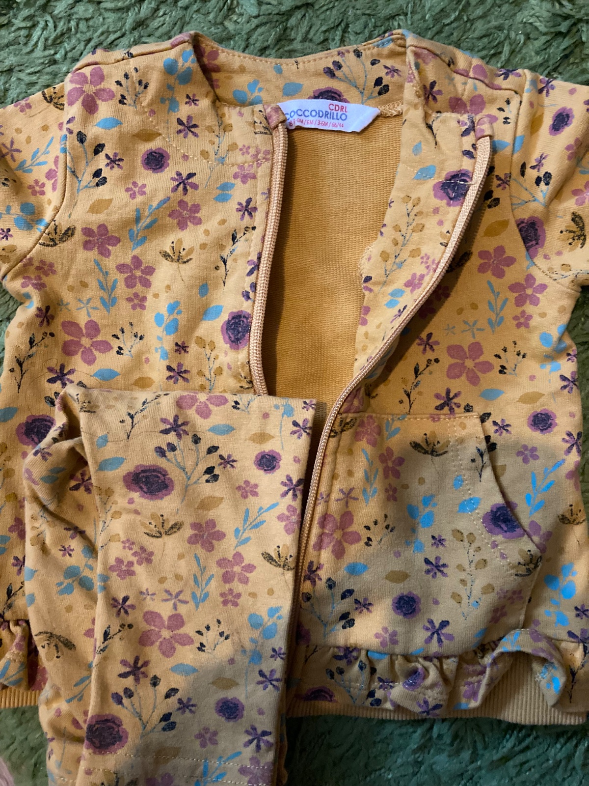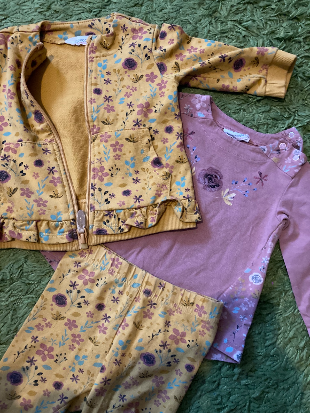 Coccodrillo súprava. Legíny veľkosť 74 6-9 mesiacov, rovnako ak tričko . Mikina je veľkosť 3-6 mesiacov ale nosili sme do 8 mesiacov. Zips je ošuchaný ako aj gombík na tričku. Viď foto ale funkčnosť ostáva.