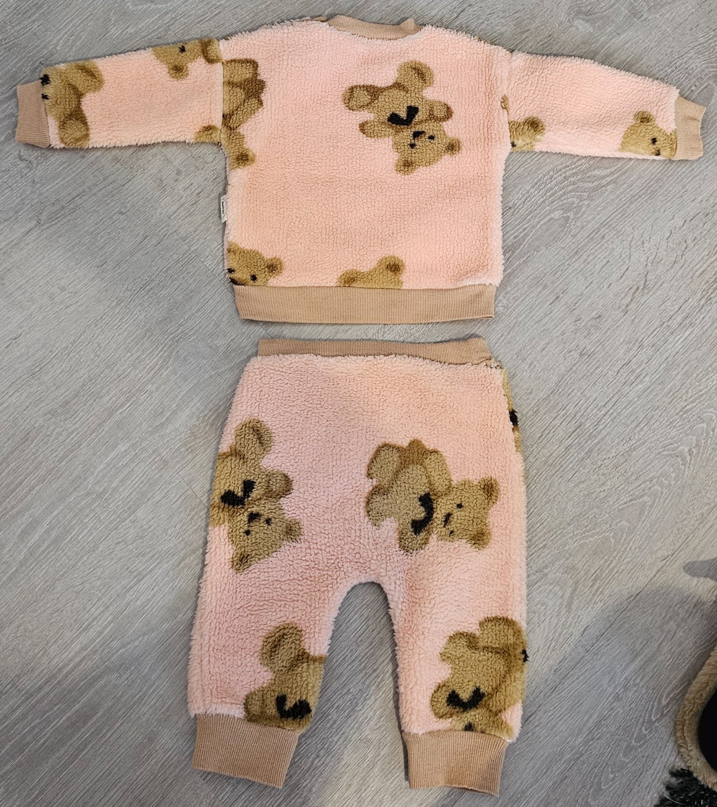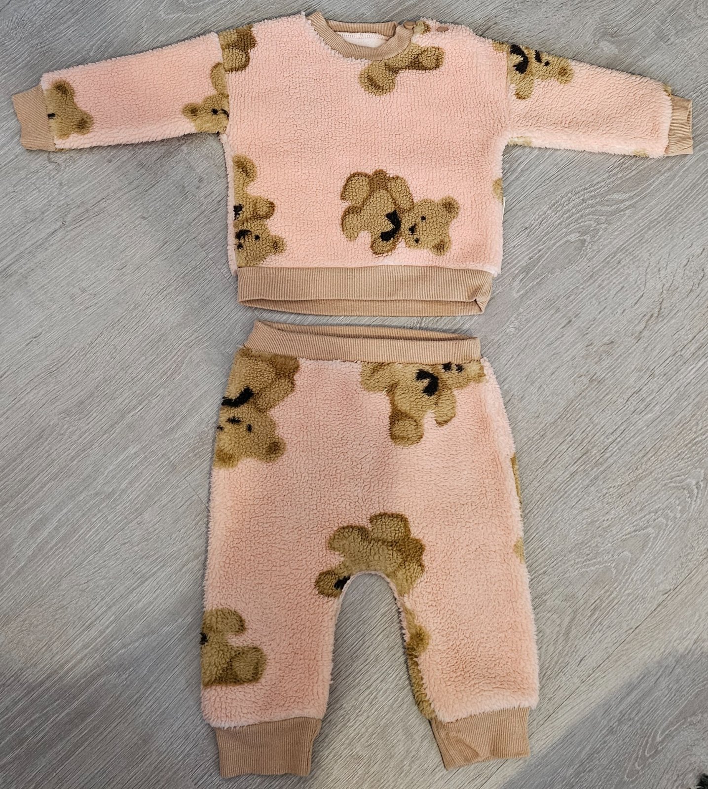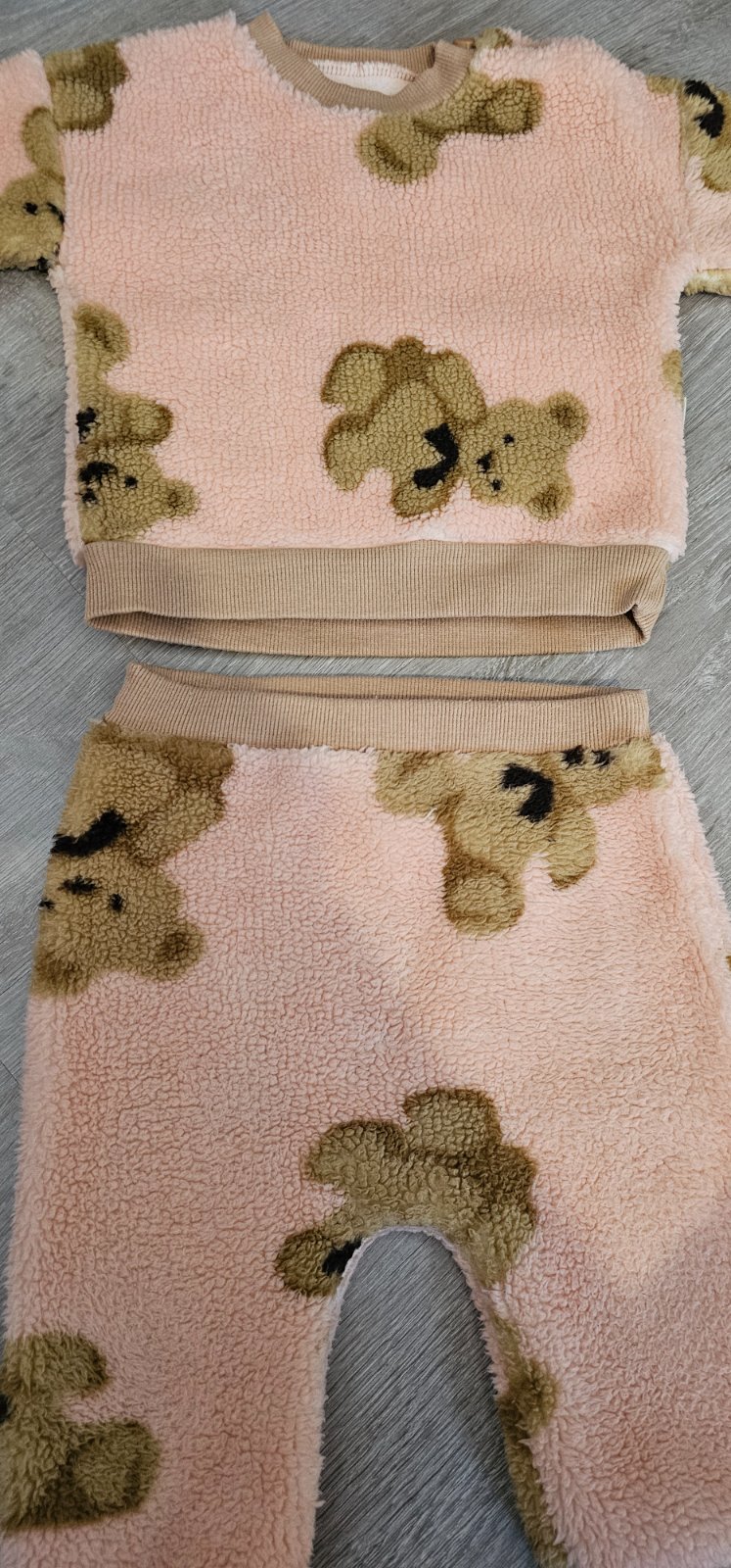 2-dielny dievčensky set na chladnejšie dni. Set sa skladá z teplého plyšového pulóvrika pri krku na patenty, ktorý je ozdobený s obrázkami macíka a z plyšových nohavíc.