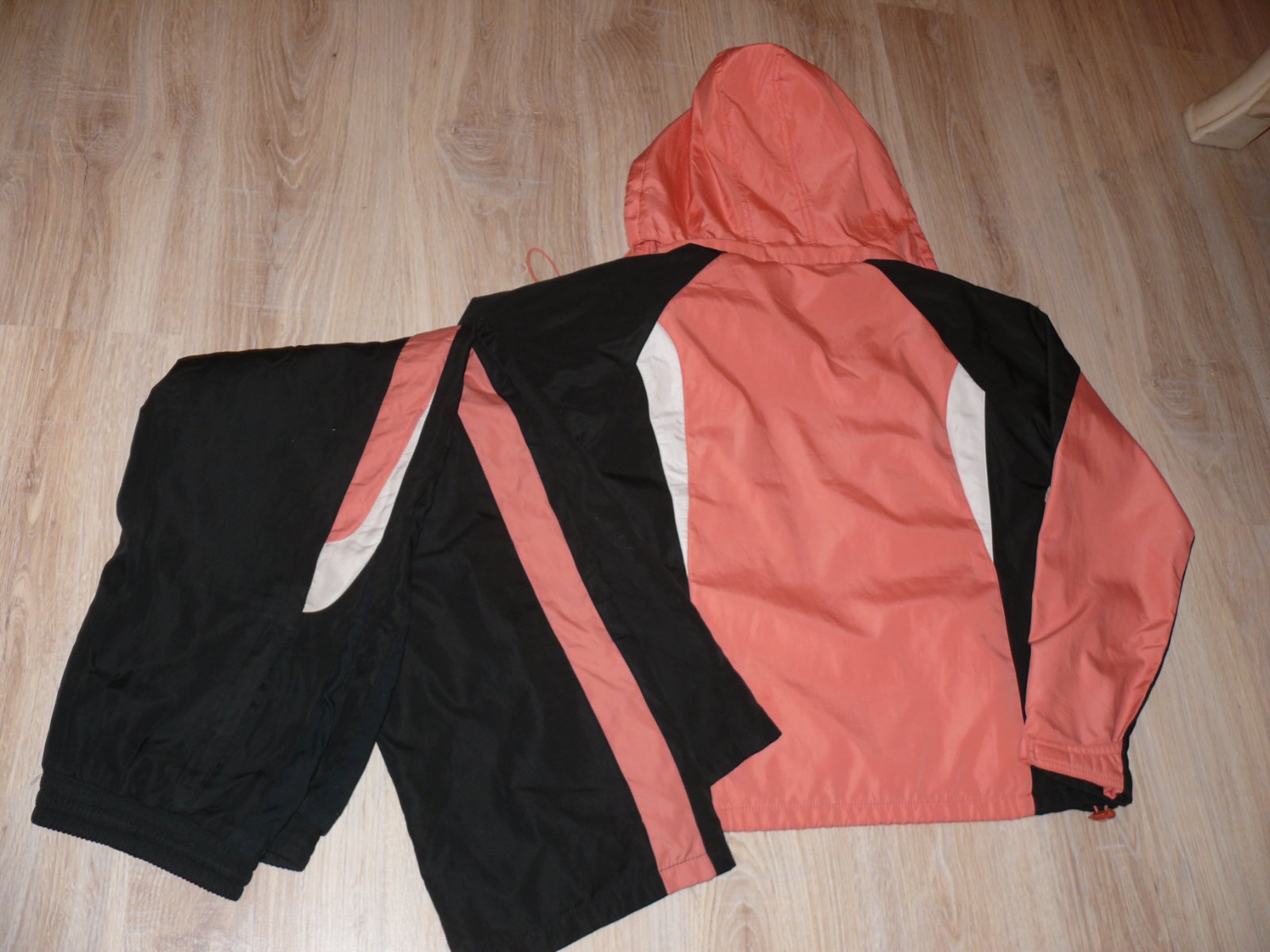 Je zachovalá, sadne na M-ko. Kapucnu sa dá odzispovať. Kabátik-dl.60, śírka v podpaz.2x48-do 50 cm, rukávy od krku 72 cm. Nohavice-dl.104, v rozkroku 76 cm, v páse je guma+śnúrky. Postovné 4€.