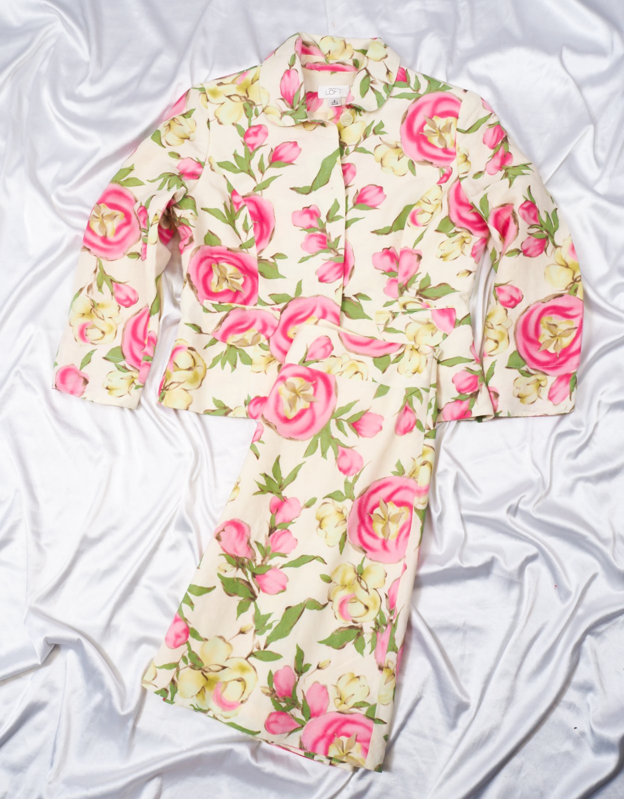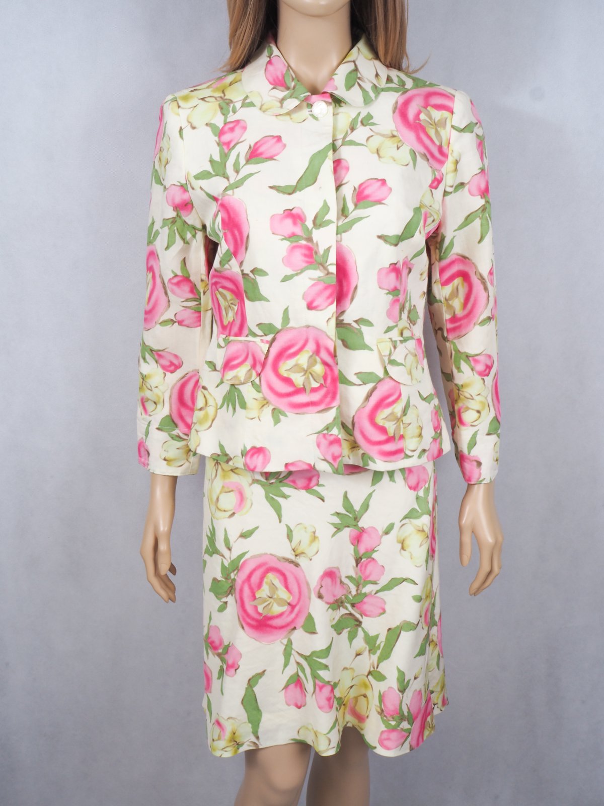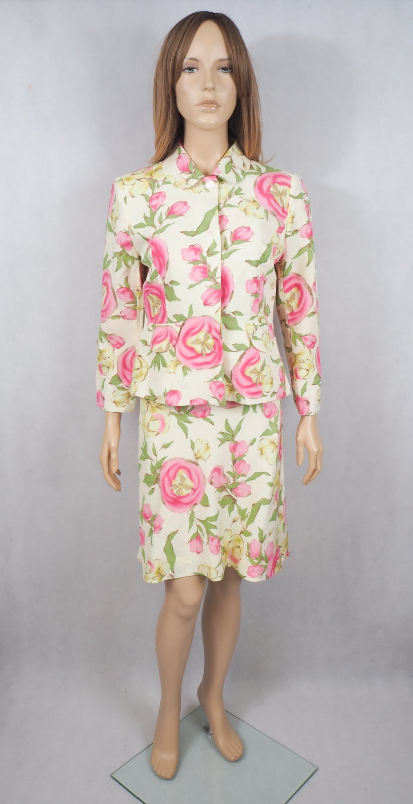 Luxusné ľanový kostým, bledožltej farby, s krásnou kvetinkovou potlačou, zapínanie na gombíky, sukňa na zips, materiál 100% ľan, super stav.