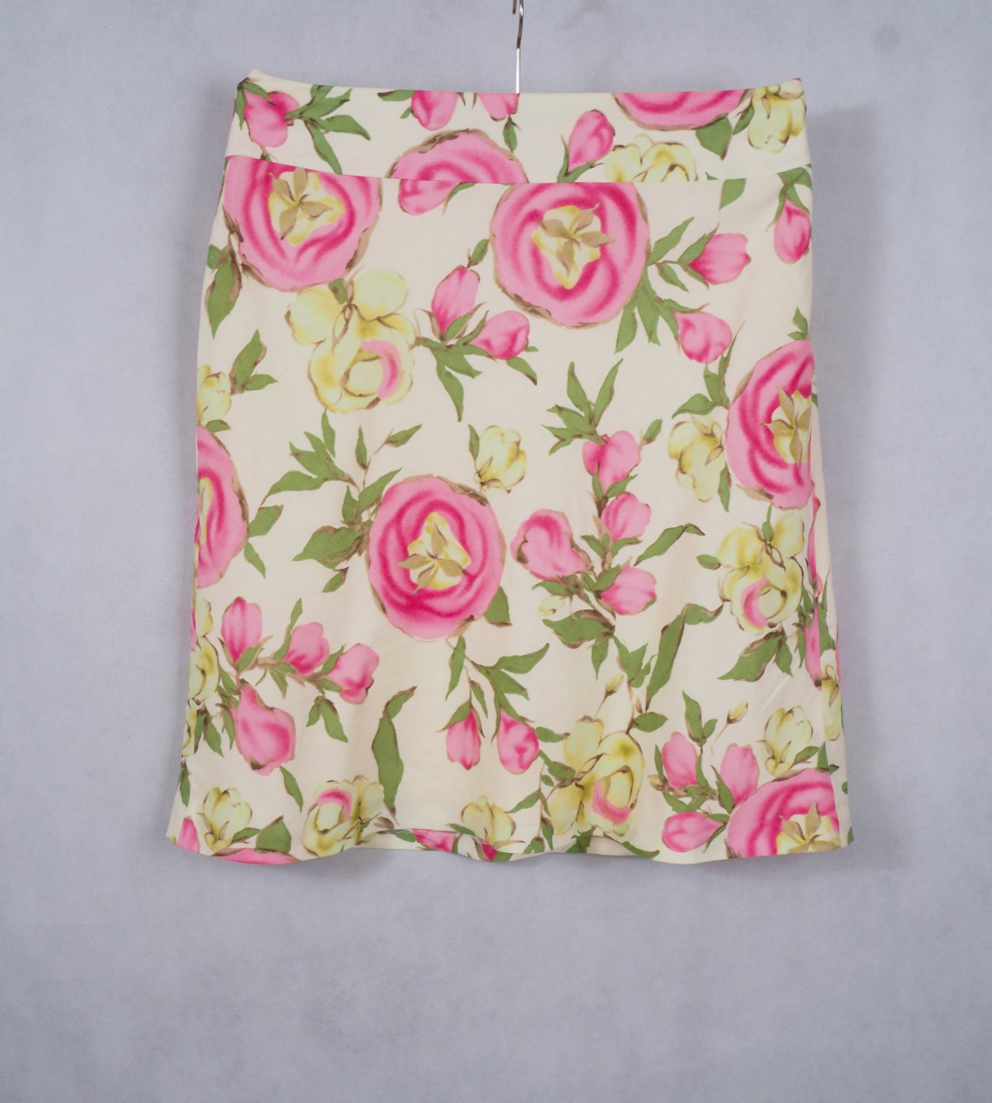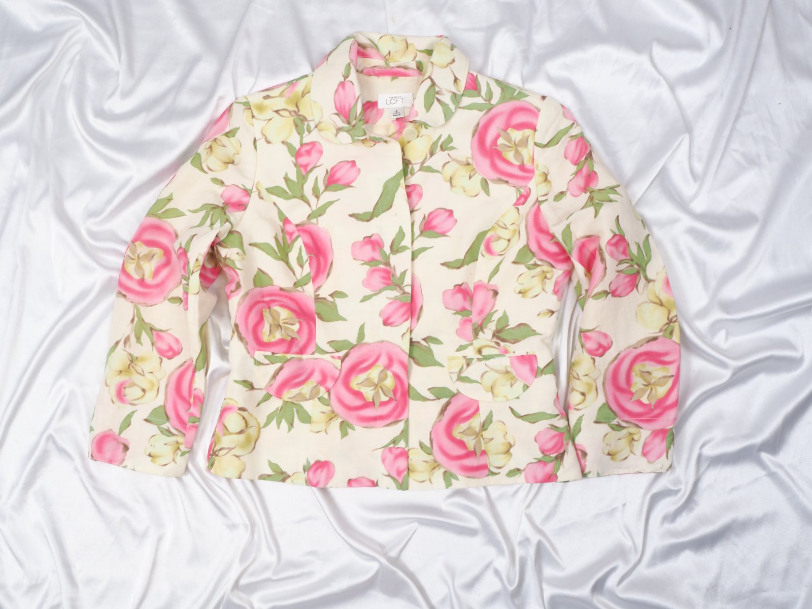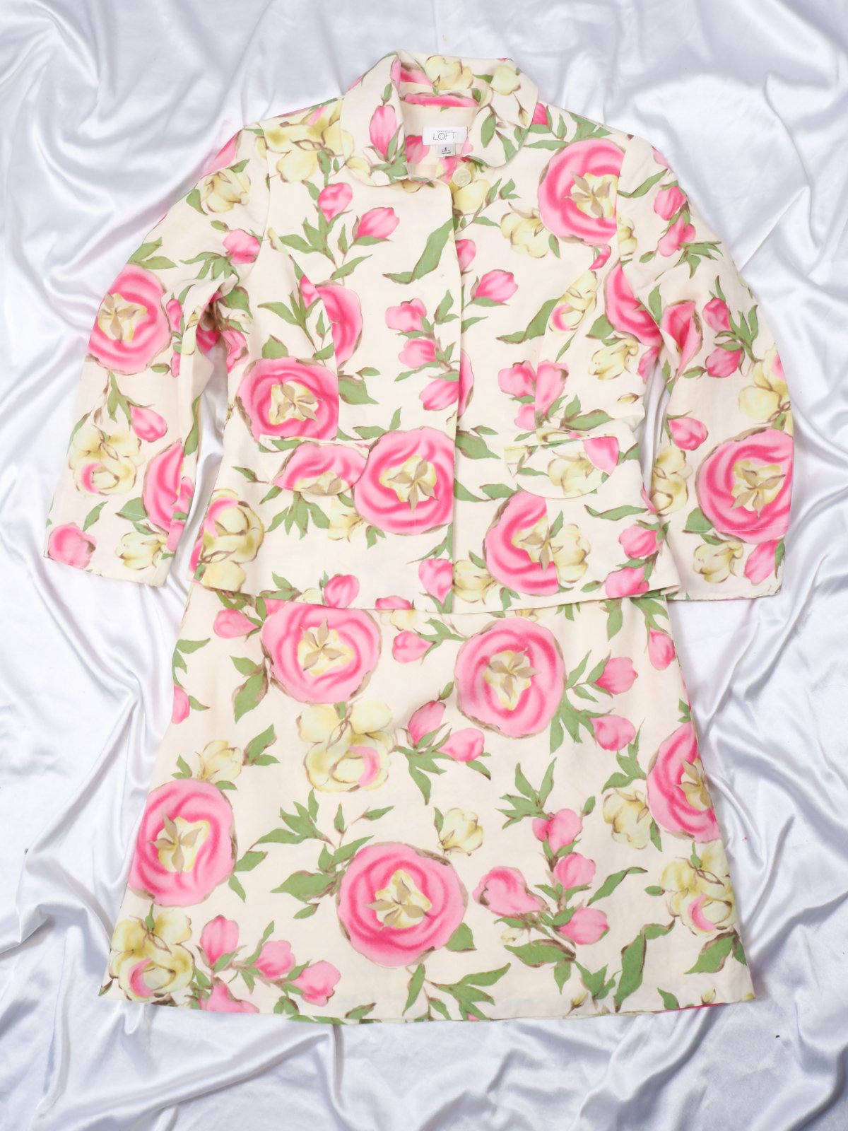 Luxusné ľanový kostým, bledožltej farby, s krásnou kvetinkovou potlačou, zapínanie na gombíky, sukňa na zips, materiál 100% ľan, super stav.
