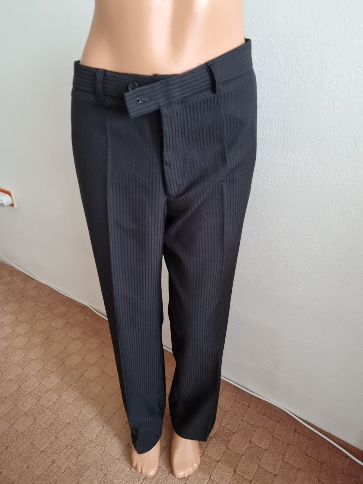 nohavice: bočná dlžka 105, pás 100, šírka stehna v časti rozkroku 34x2, šíra nohavice dole 24x2, predný/zadný sed - 28/43