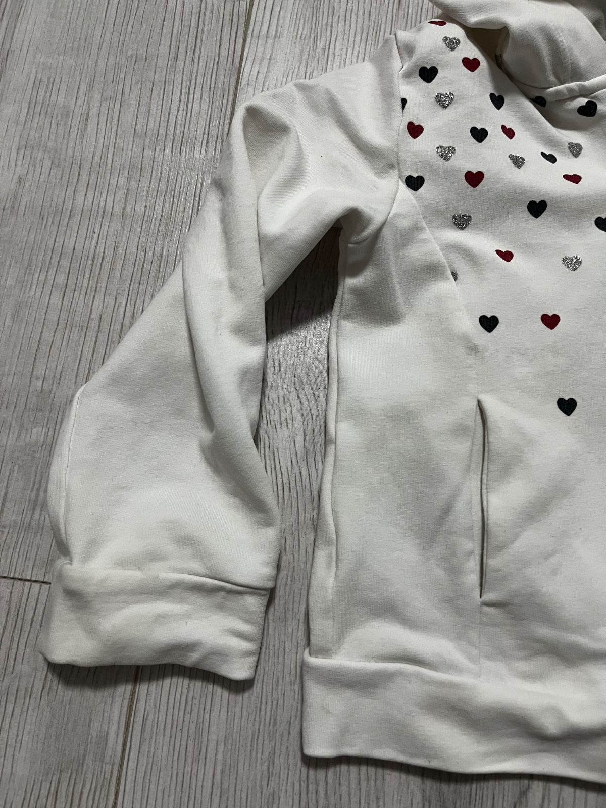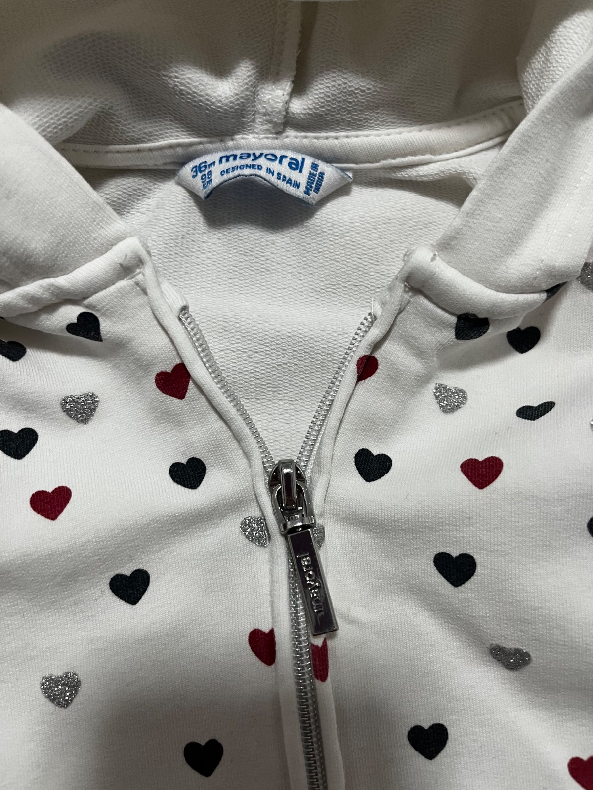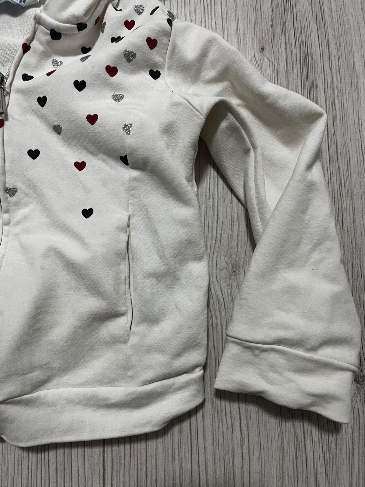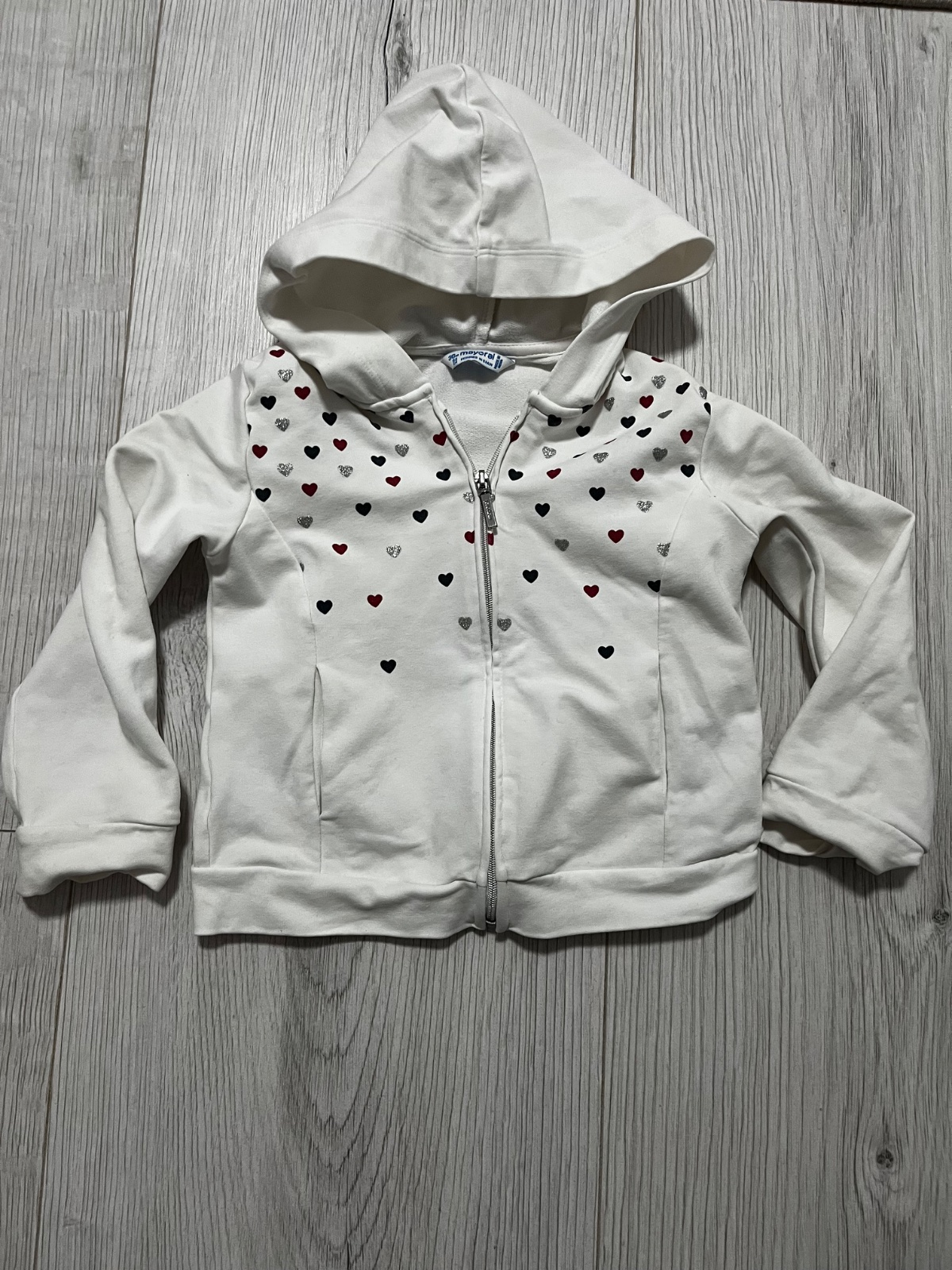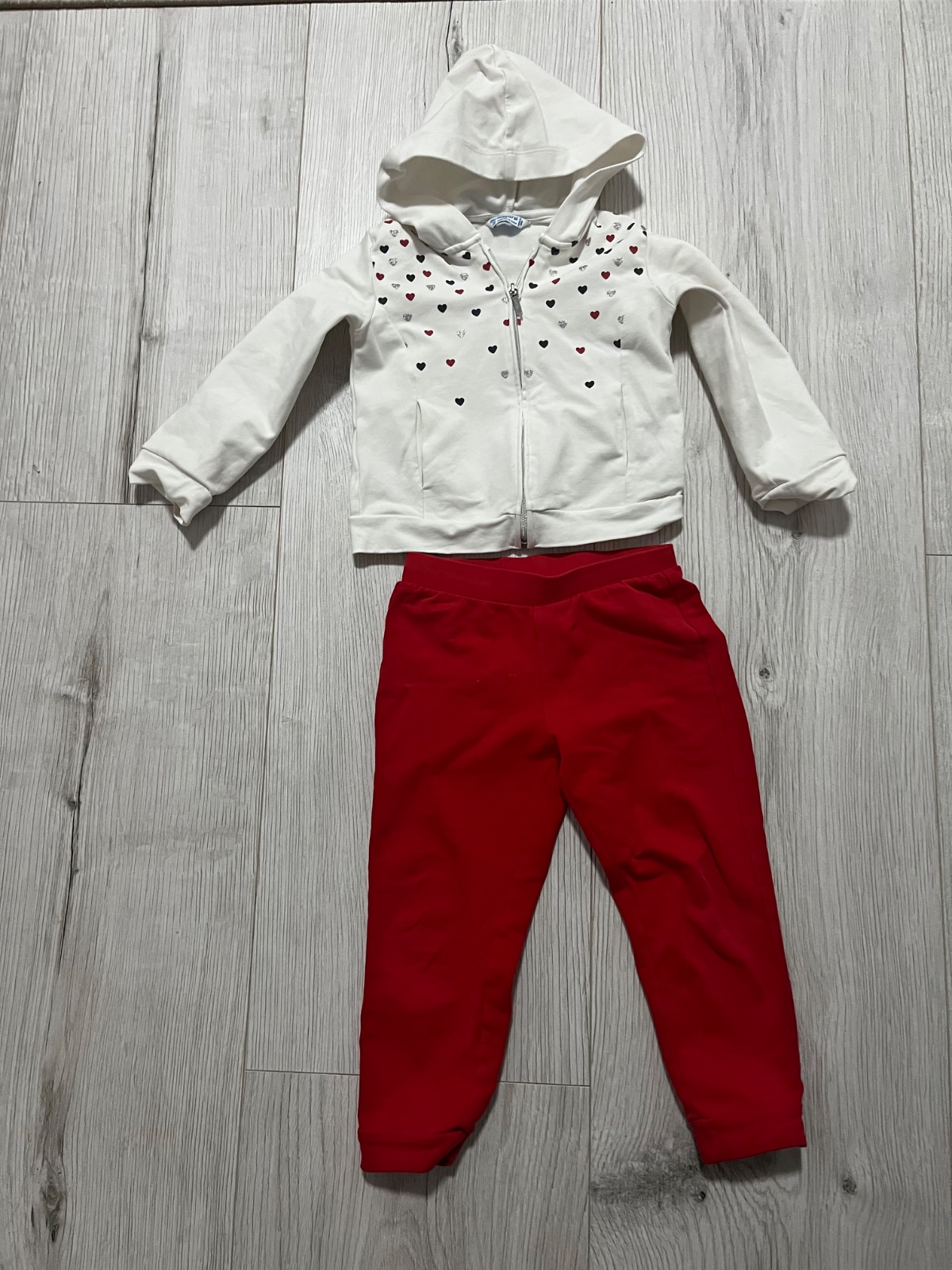 Predám teplákovú súpravu značky Mayoral, veľkosť: 98. Biela mikina sa zapína na zips, ma kapucňu a je ozdobená červenými, striebornými a tmavomodrymi srdiečkami. Červené tepláky sú v páse na gumičku.