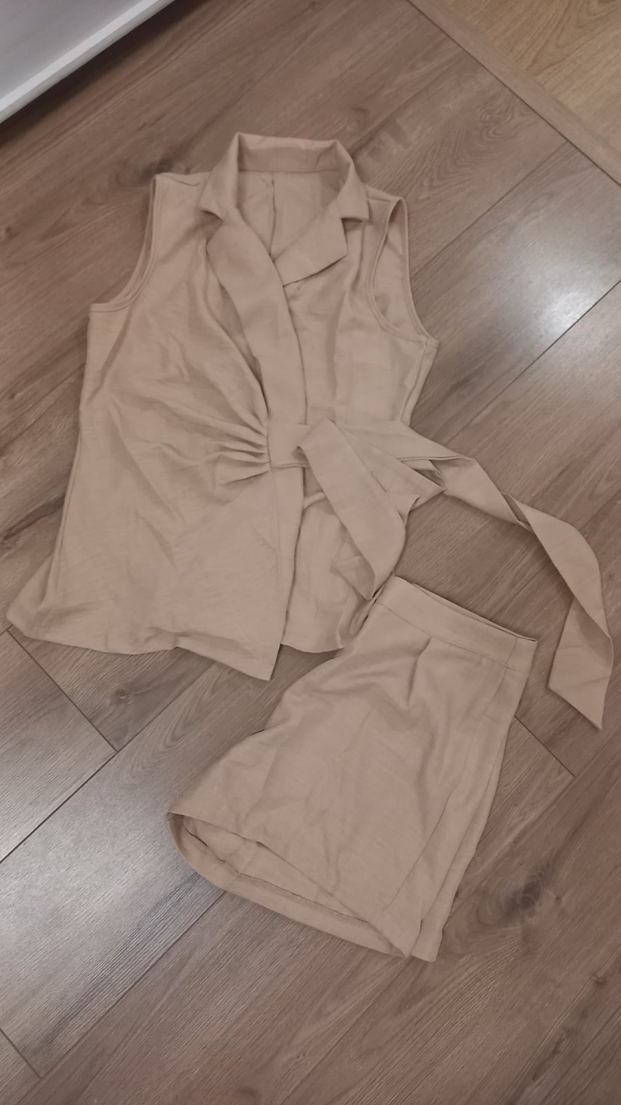 Pásikavý béžový elegantný kostým na leto. Môže sa nosiť aj s topom alebo bez. sako je dlhšie. všetko je bez poškodenia.