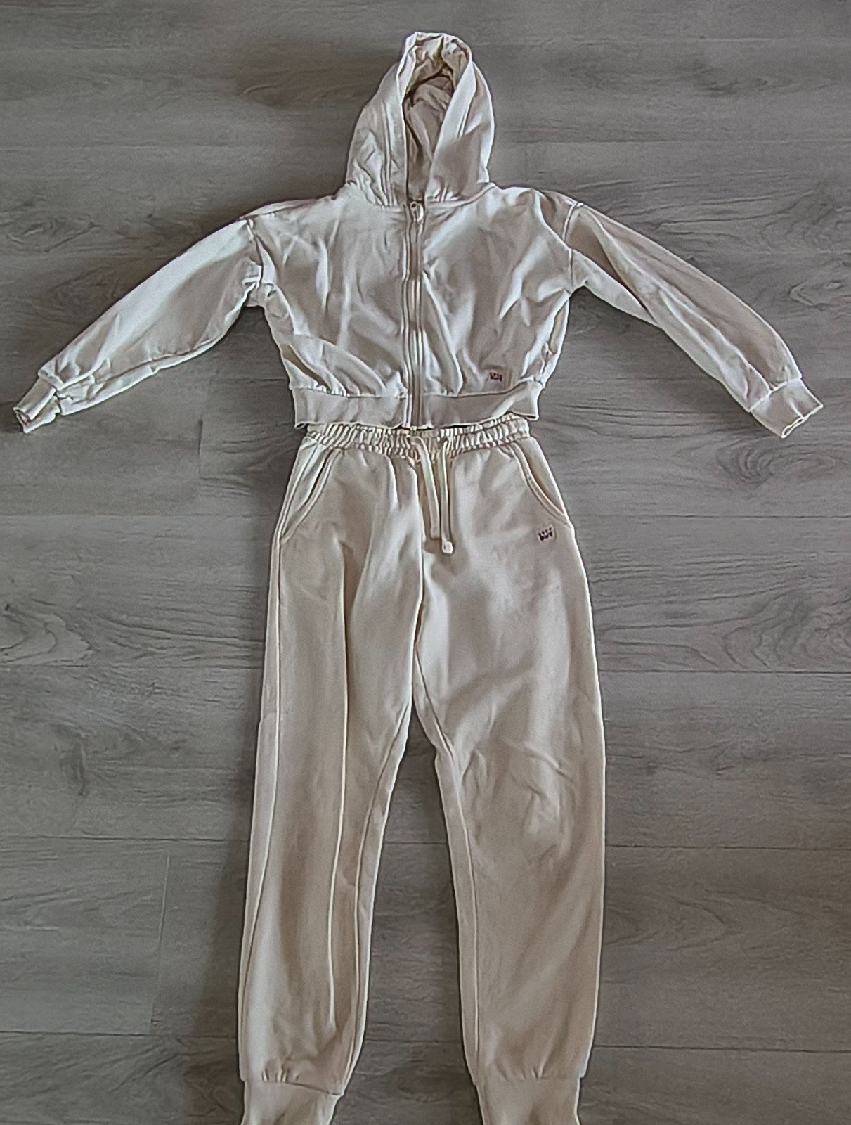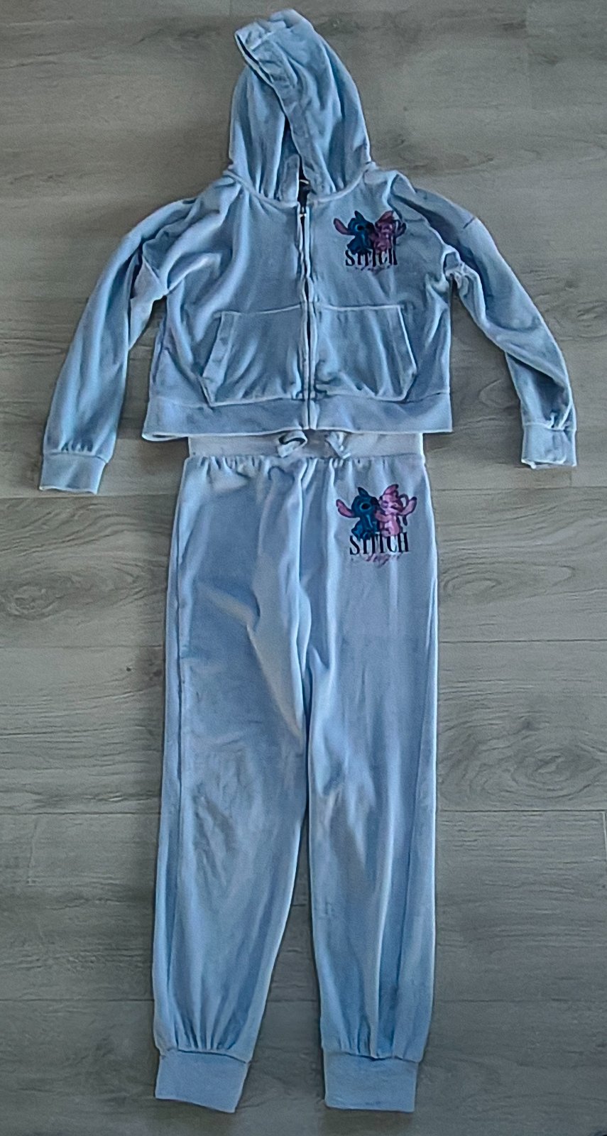 Predám pekné teplákové súpravy, veľkosť odhadujem 128/134. Modrá Stitch materiál plyš. Bežné známky nosenia. Dĺžka nohavíc s patentom 77 cm, dĺžka od rozkroku s patentom 53 cm, pás 2 x 39cm, dá sa stiahnuť šnúrkou. Vrchný diel s kapucňou 41 cm, dĺžka rukáva od ramena s patentom 37 cm, šírka pod pazuchami 45 cm. Cena spolu.
