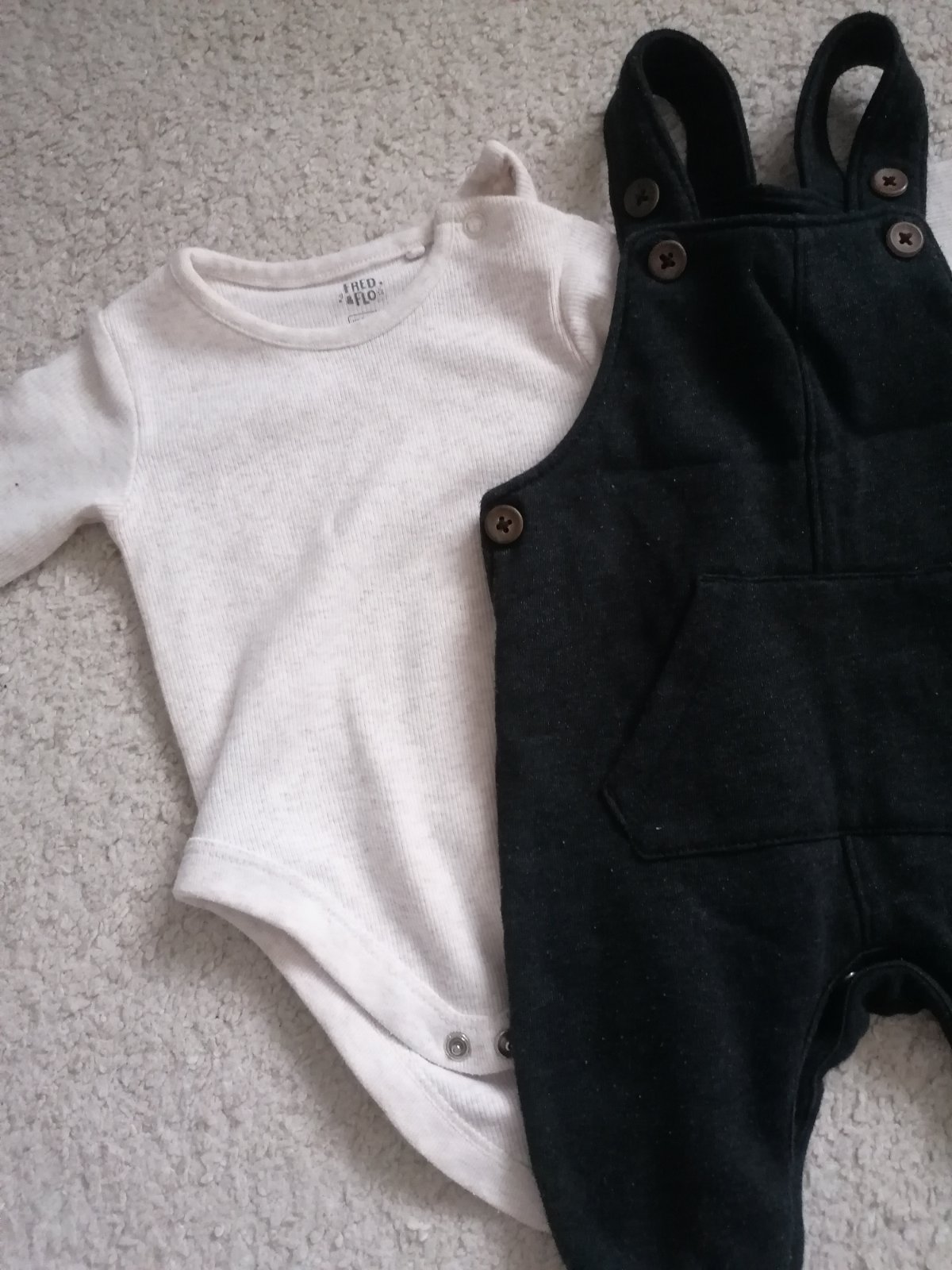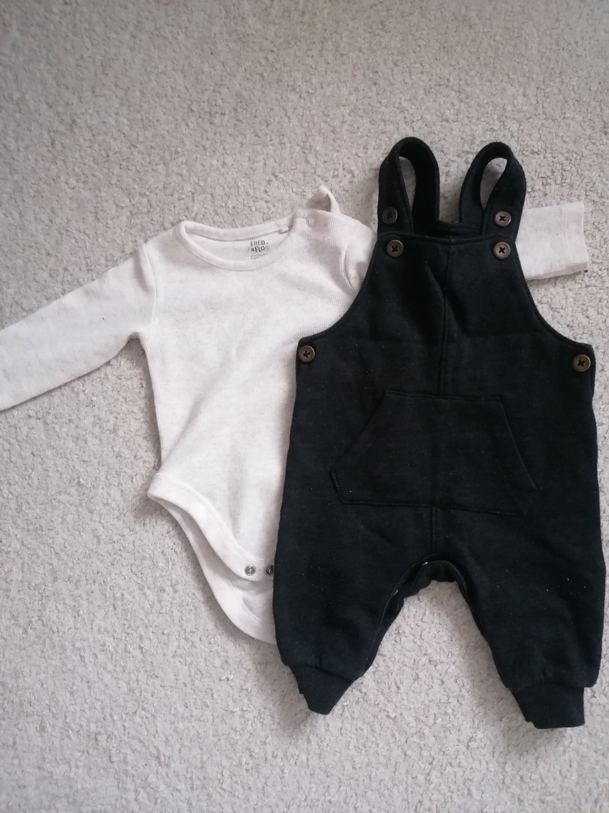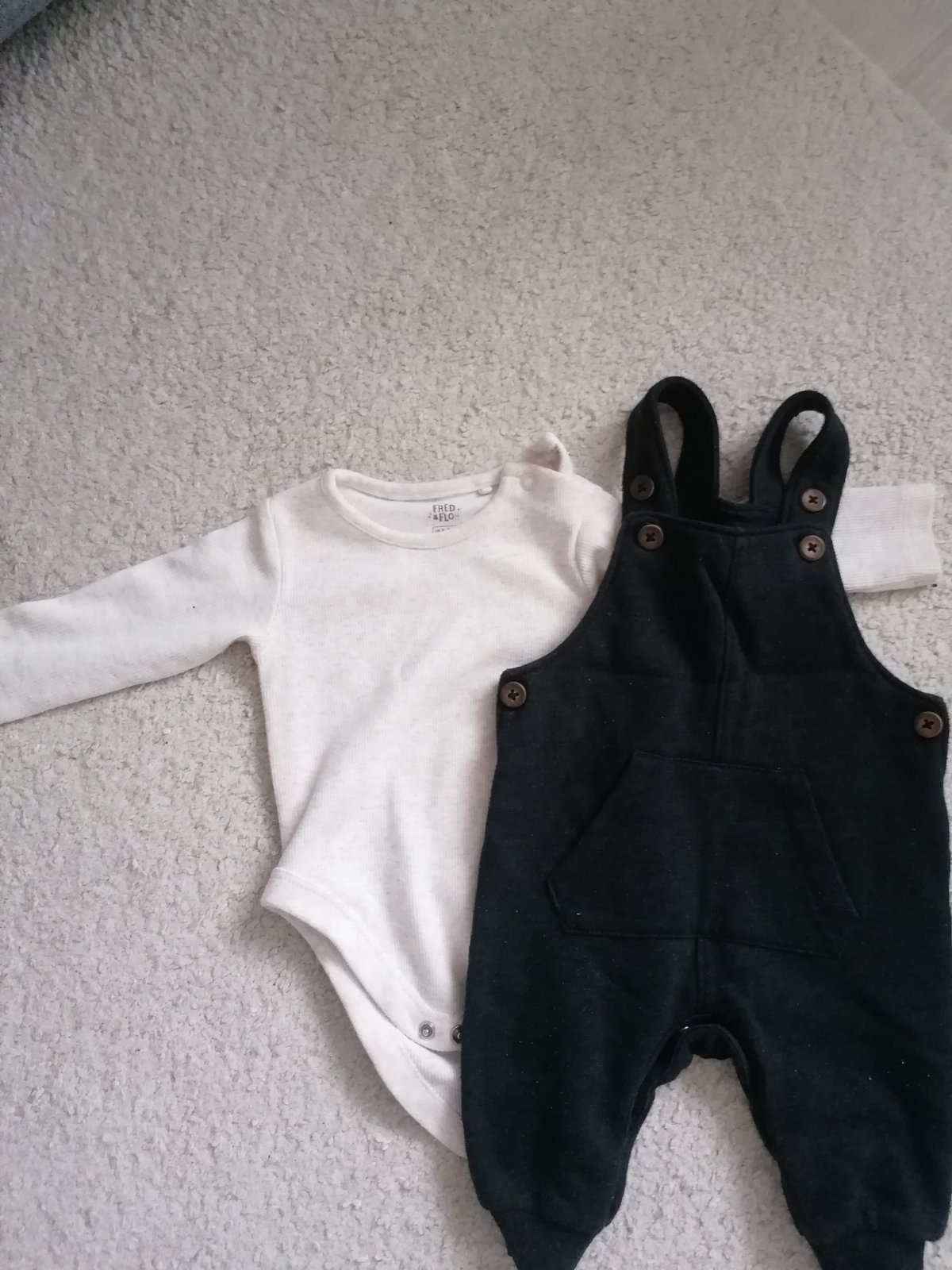 Krásny nový kompletík (nohavice na traky + tričko). V zime nám v ňom bolo chladno a teraz nám je malý. Veľkosť do 3 mesiacov.