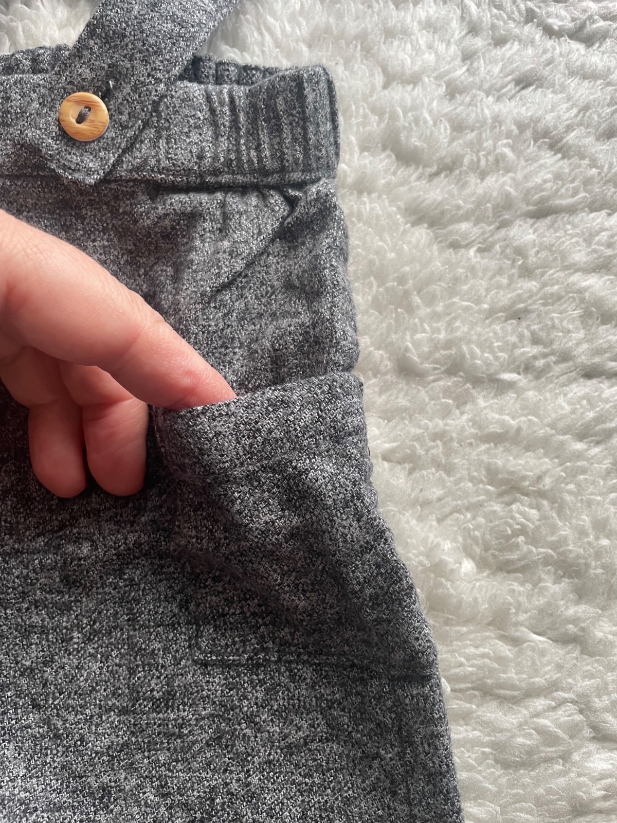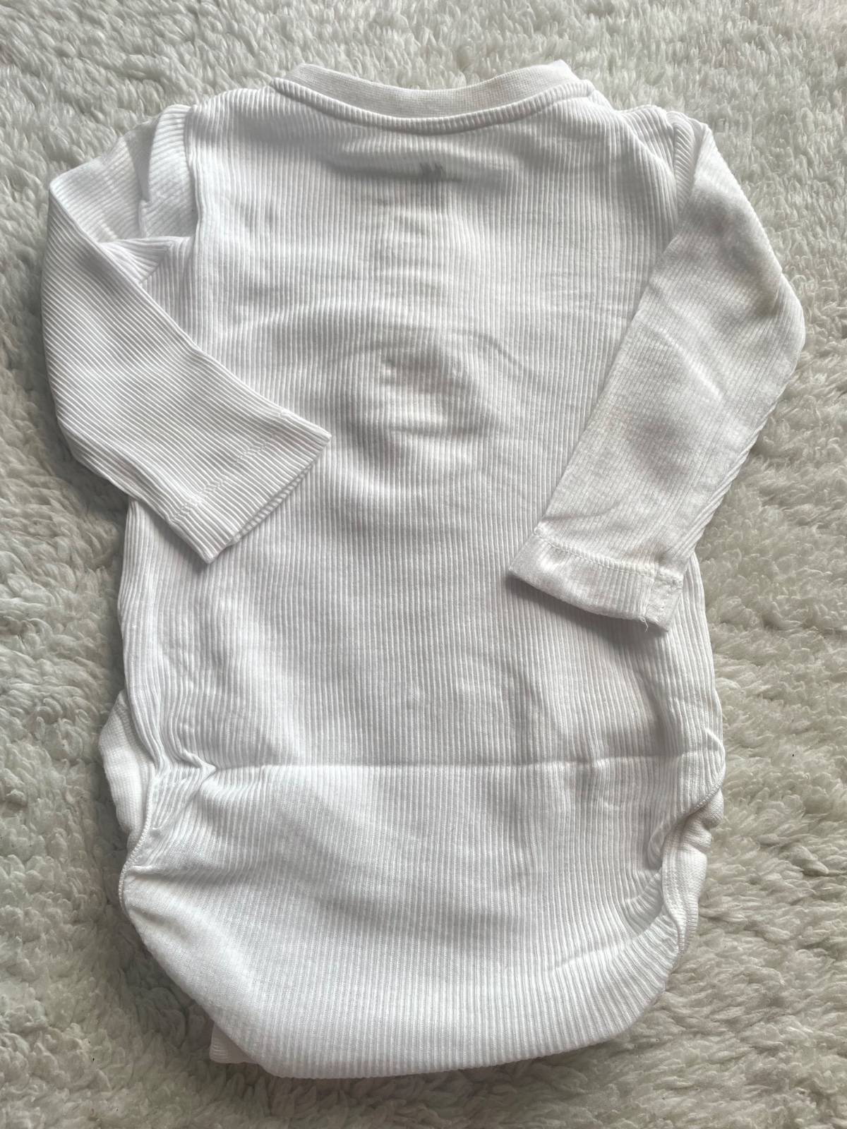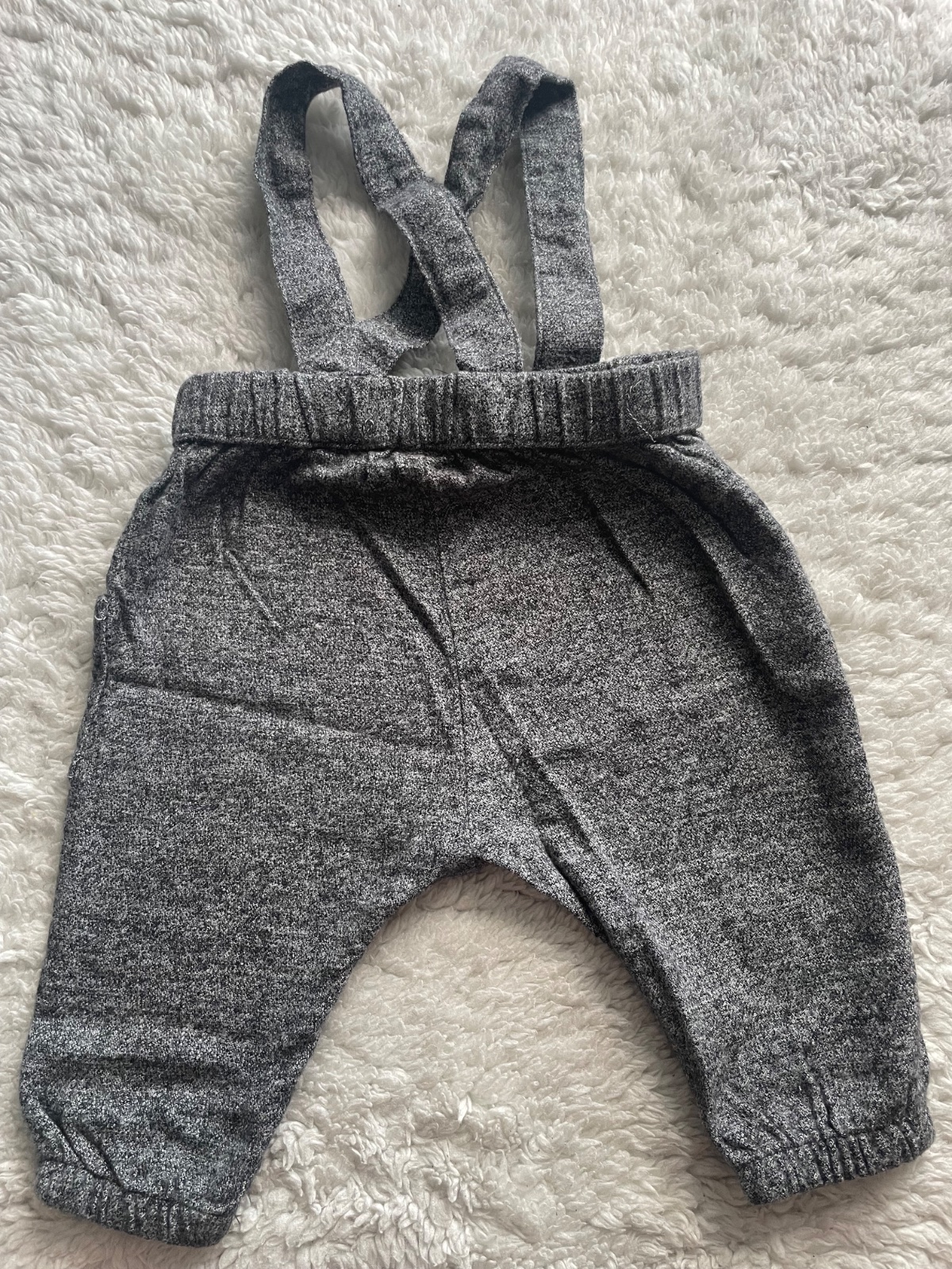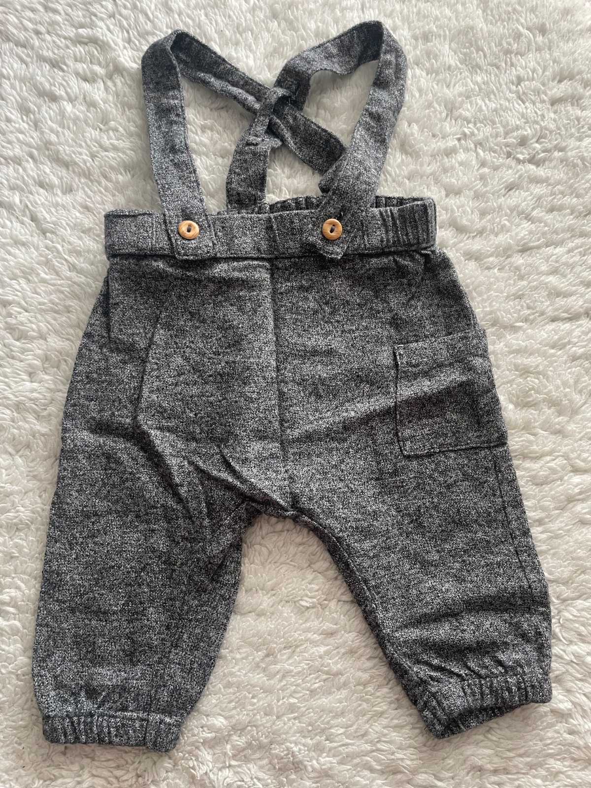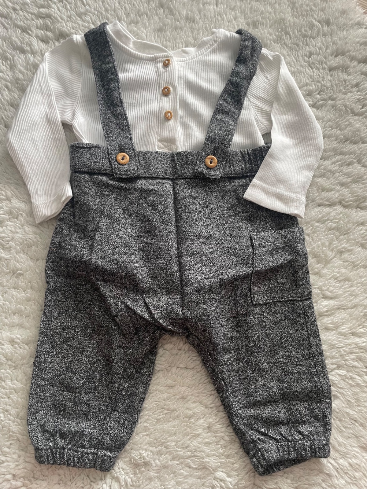 Stramacka suprava tmavosedych nohavic na traky a rebrovaneho bieleho bodycka s hnedymi gombickami, detaily nafotene, body ma mini fliacik, temer neviditelny, velkost 68