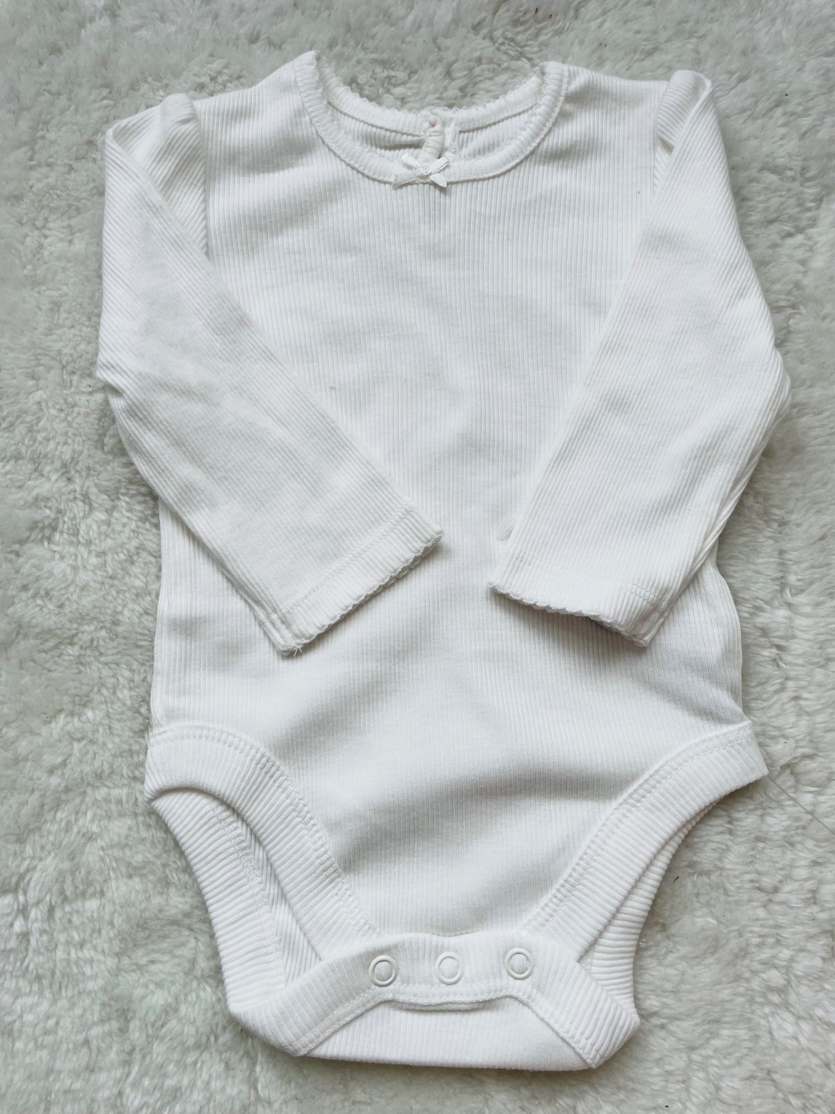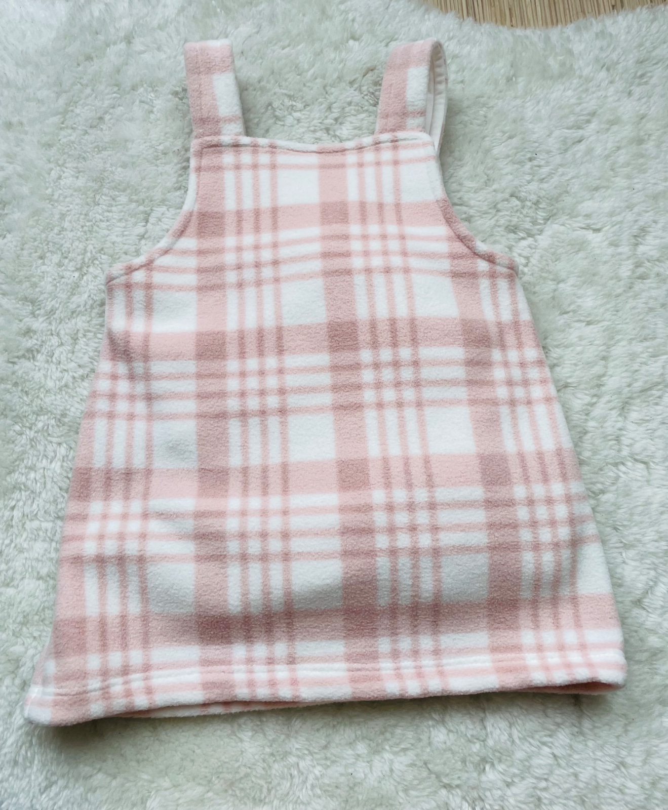 Suprava kremoveho bodynka so zapinanim na gombik, ruzovo kremove saty na traky s prednym vreckom. Bodynko ma jeden fliacik, mozno pojde vyprat. Velkost 3-6 m