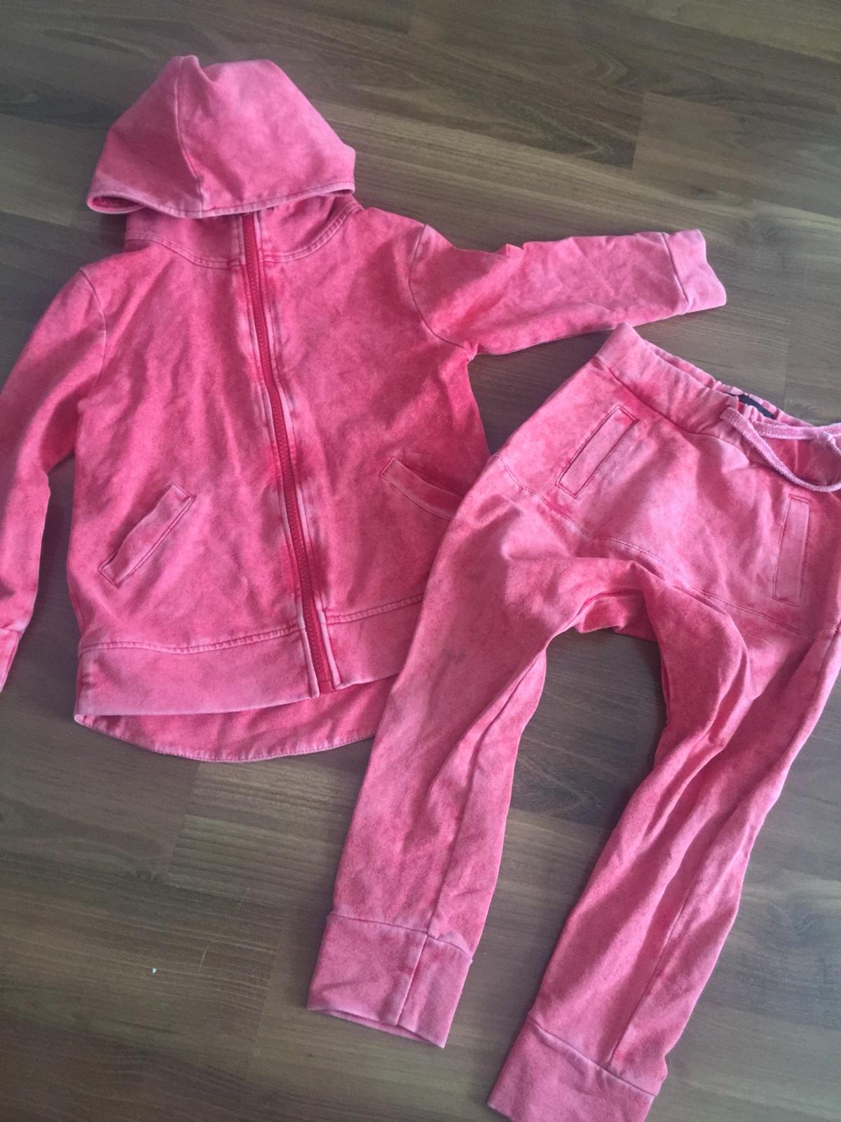Mikina krasna, teplaky medzi nohami nite uvoľnene, treba zošit podla mna , mikina 12€, nohavíce 8€