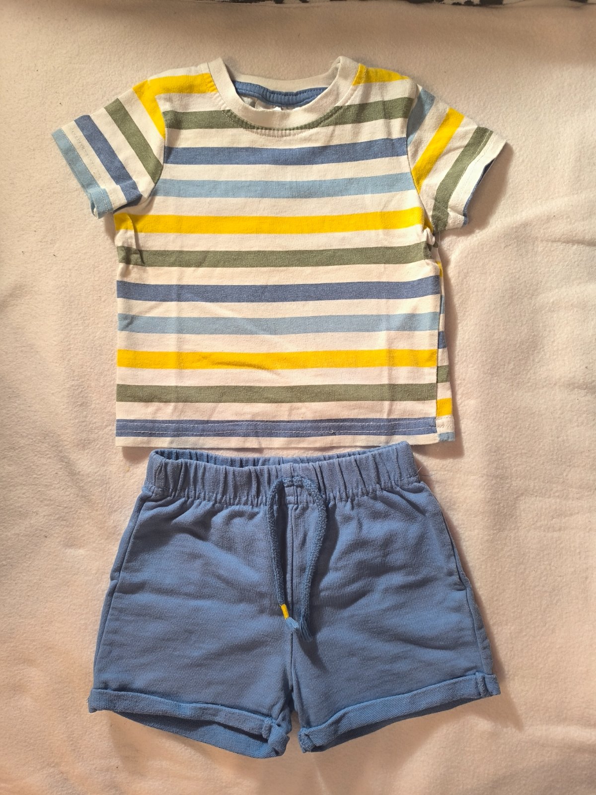 Krátky set v peknom nosenom stave, chýba nitka na jednej šňúrke z nohavíc tak pri konci trošku roztrapkané, ale nieje závadou dá sa to znovu spraviť. A tričko je trošku vyblednuté z prania.