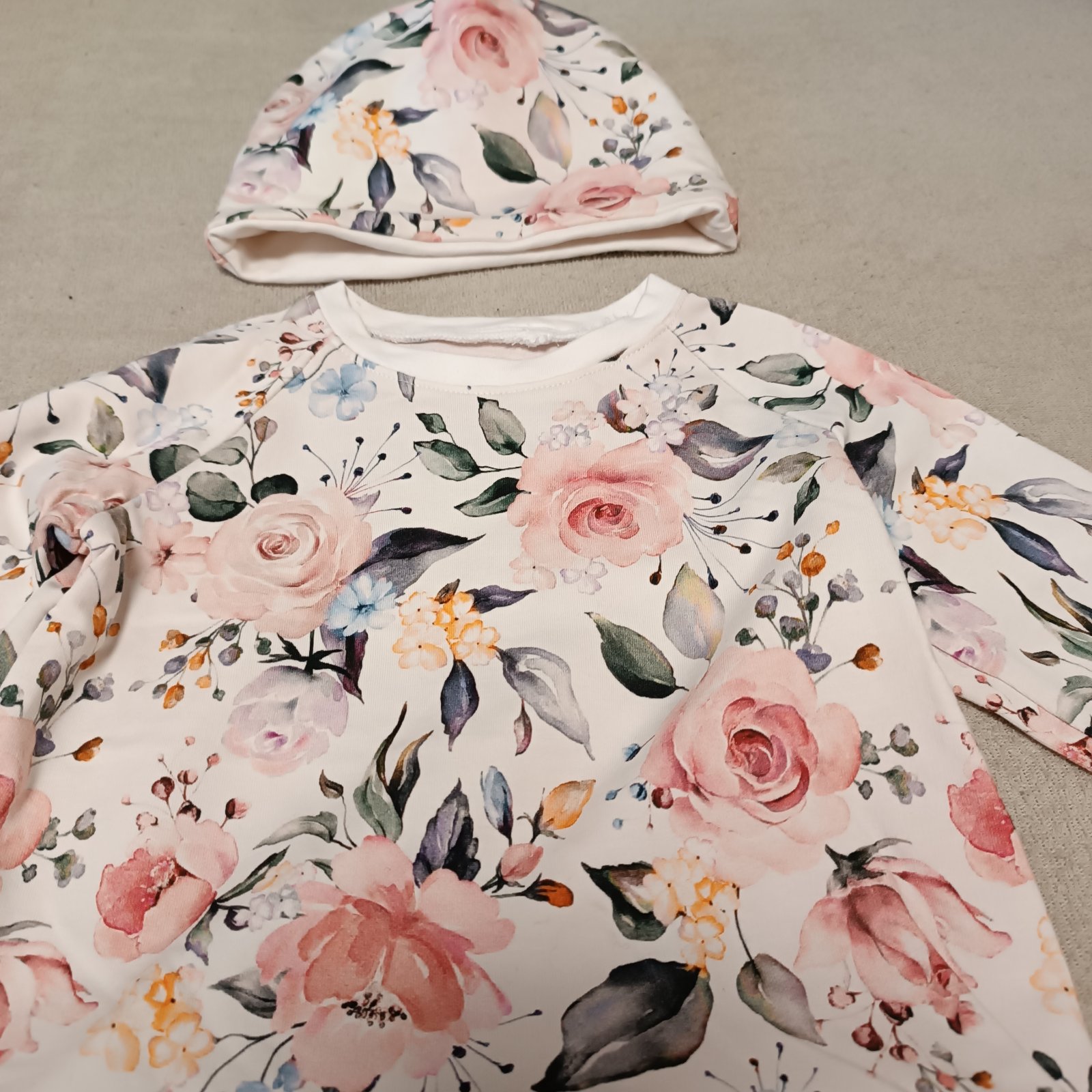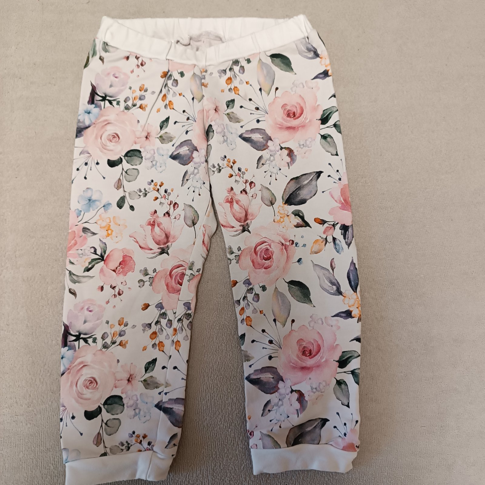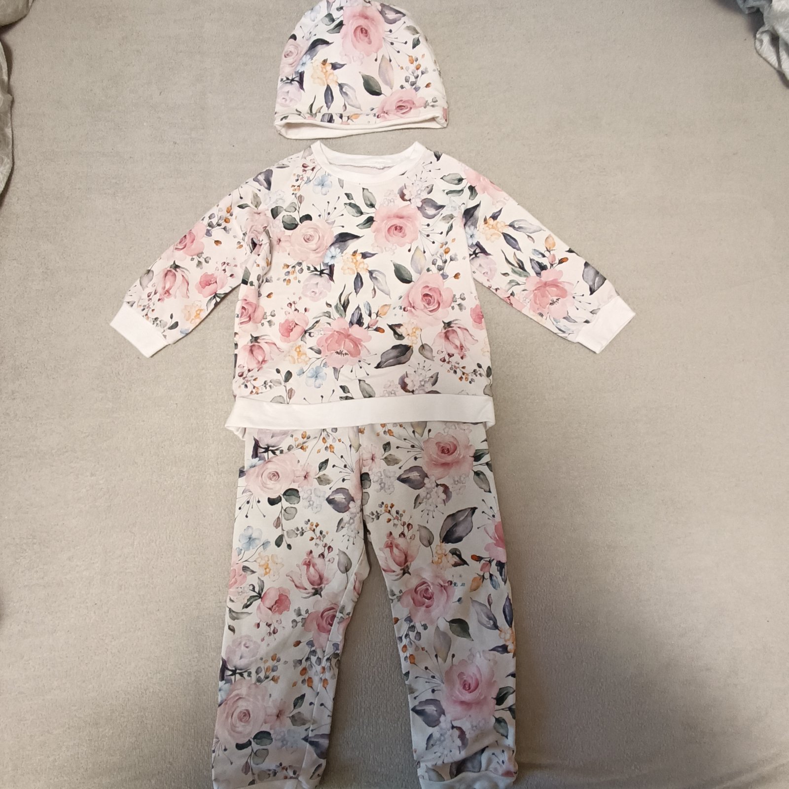 Dievčenský set hand made pozostávajúci z mikiny, tepláková a čiapky. Veľkosť 92, nezateplený. Výborný stav, ako nové, žiadne poškodenia.