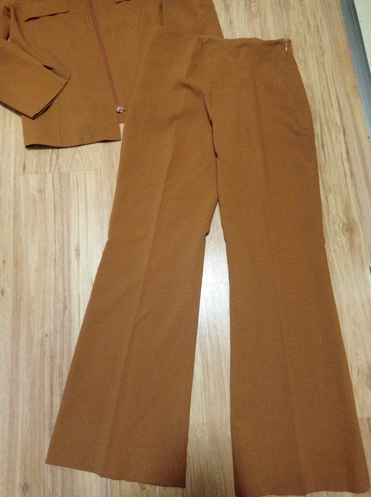 Farba tehlovooranzova, jasnejsia ako na foto. Nohavice maju zips na boku. Dole jemne rozsirene, puky. Dlzka:98,5, pas:35 cm. Sako nie je podsite, dlzka:62,5, rukav od krku:64,5, sirka:43,5.