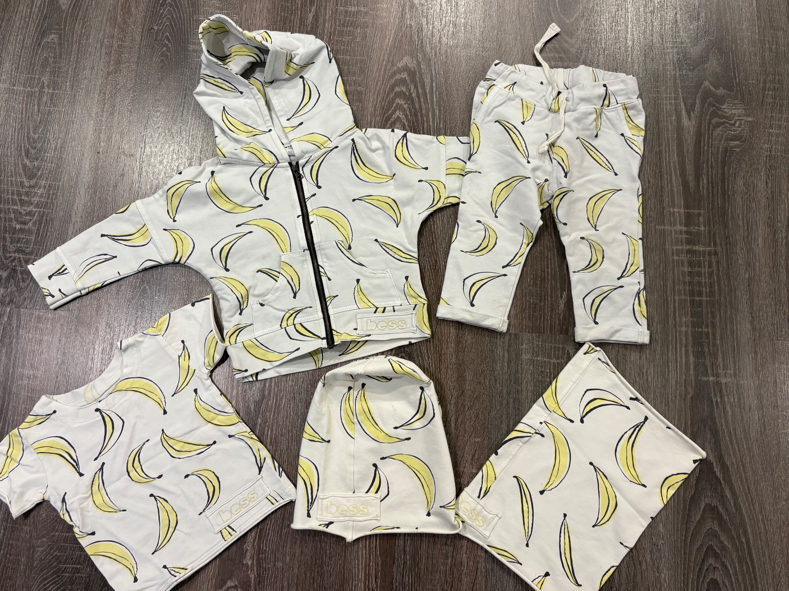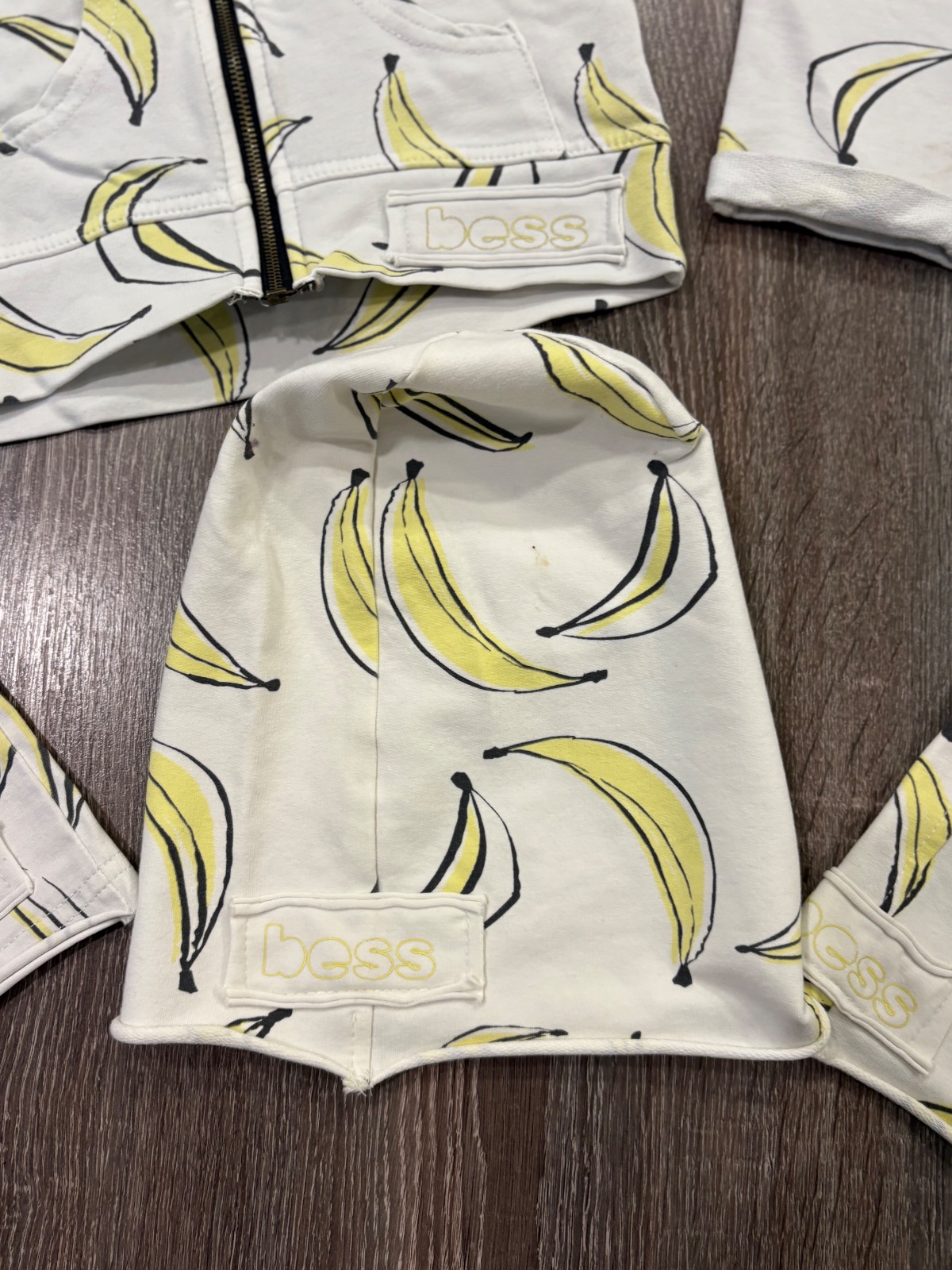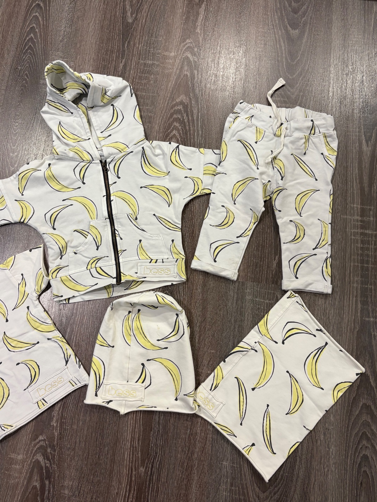 Super banánová suprava vo velkosti 9-12 mesiacov, 80 a mikina je velkost 86 ale nosili sme to spolu