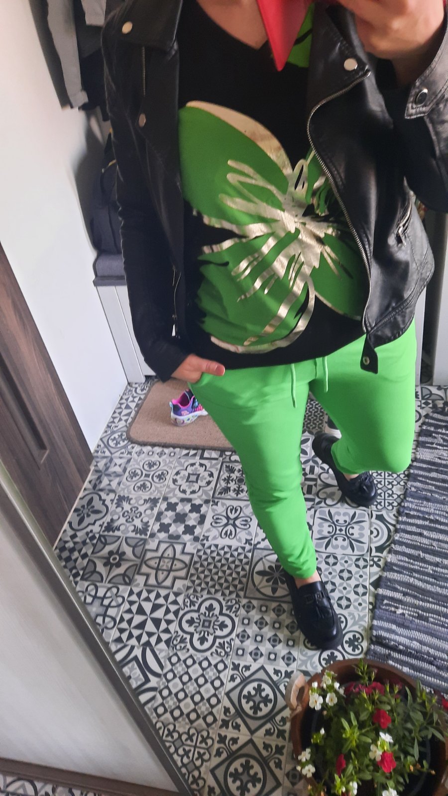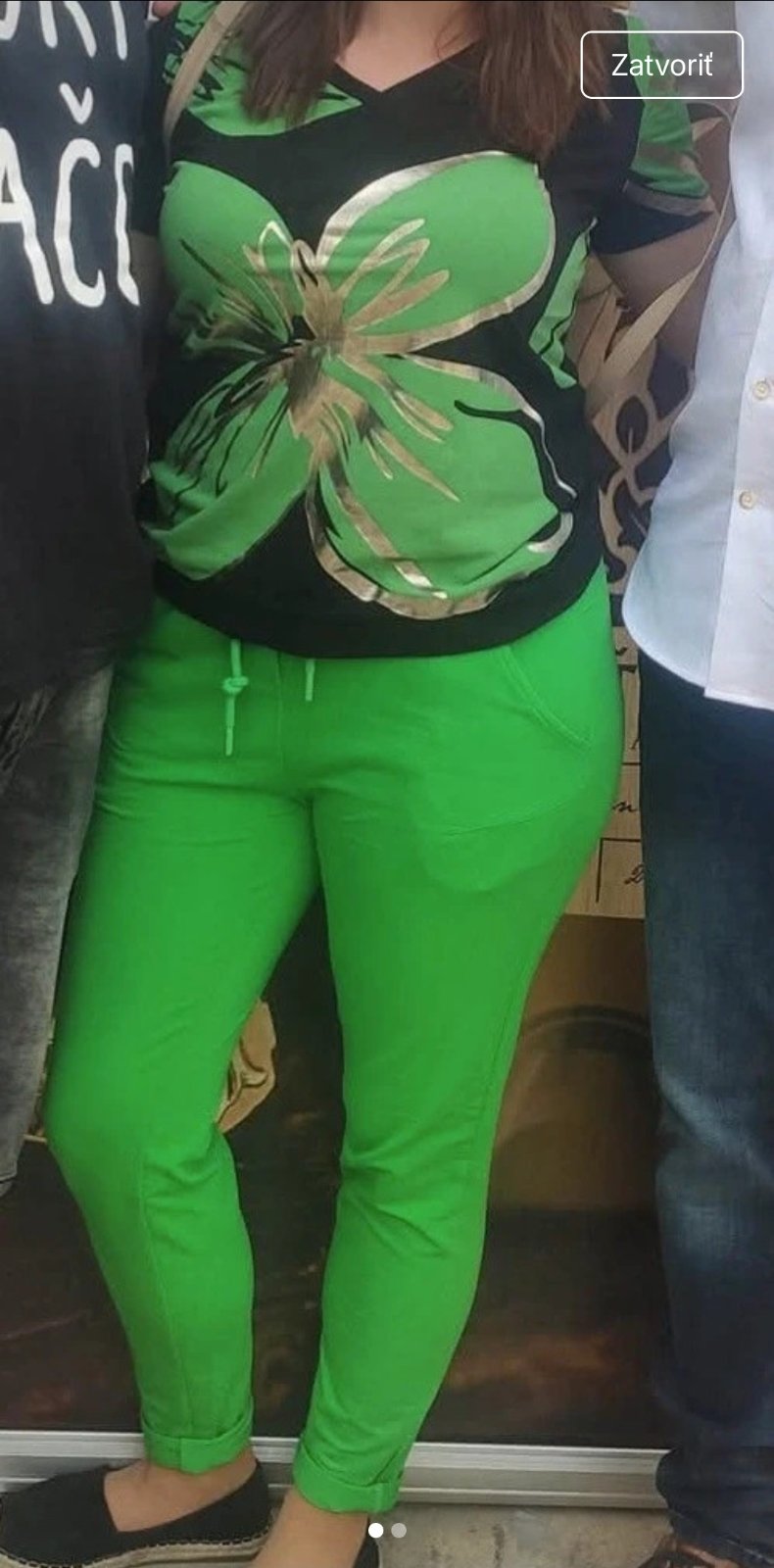 Komplet pozostáva z trička s krátkym rukávom a nohavíc teplákového materialu. Sú do gumy,v pase majú šnúrku na stiahnutie, majú dva funkčné vačky. veľkosť S/M značka MEGi